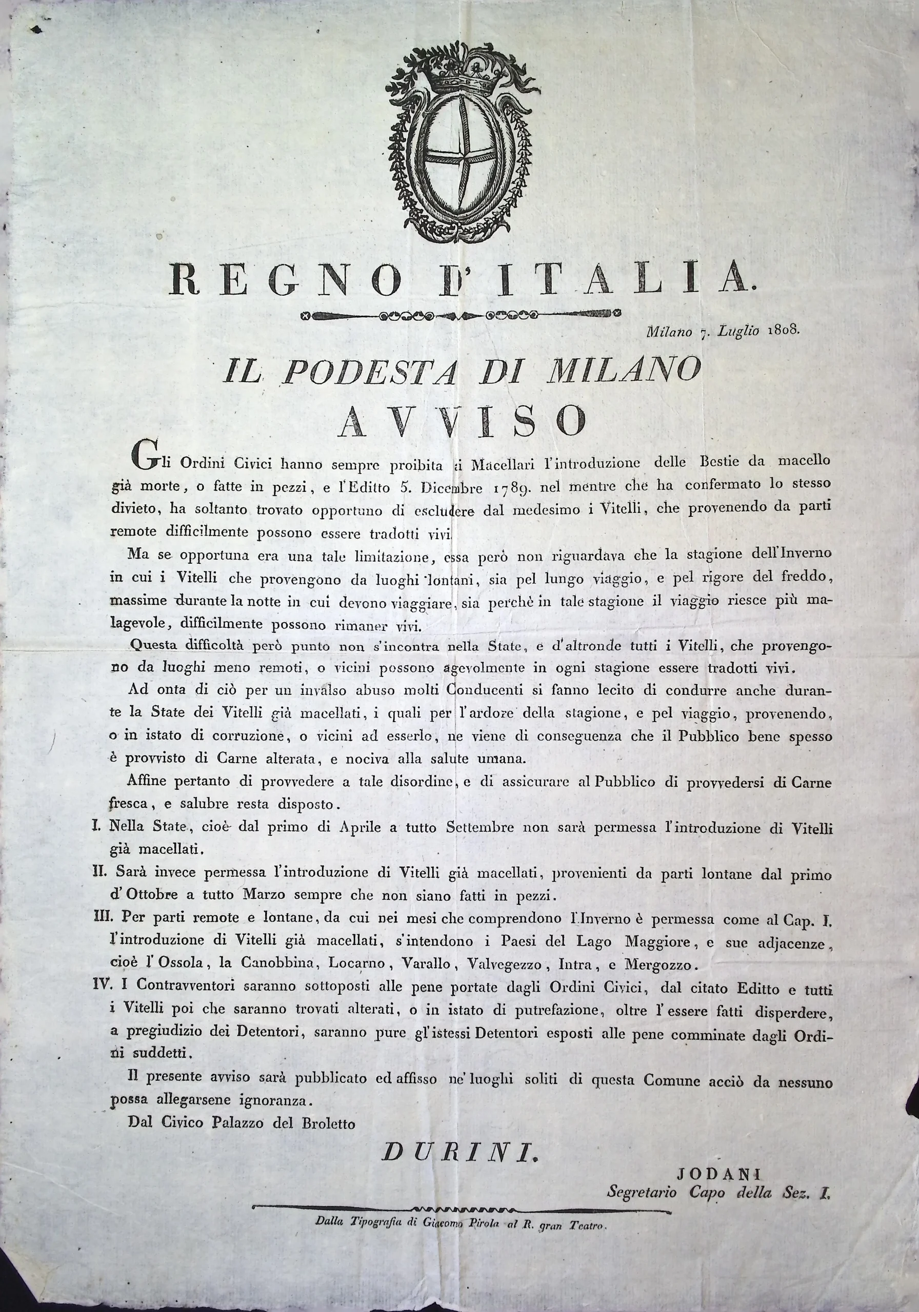 Avviso del Podestà di Milano circa il divieto d’introdurre in città vitelli già morti e fatti a pezzi