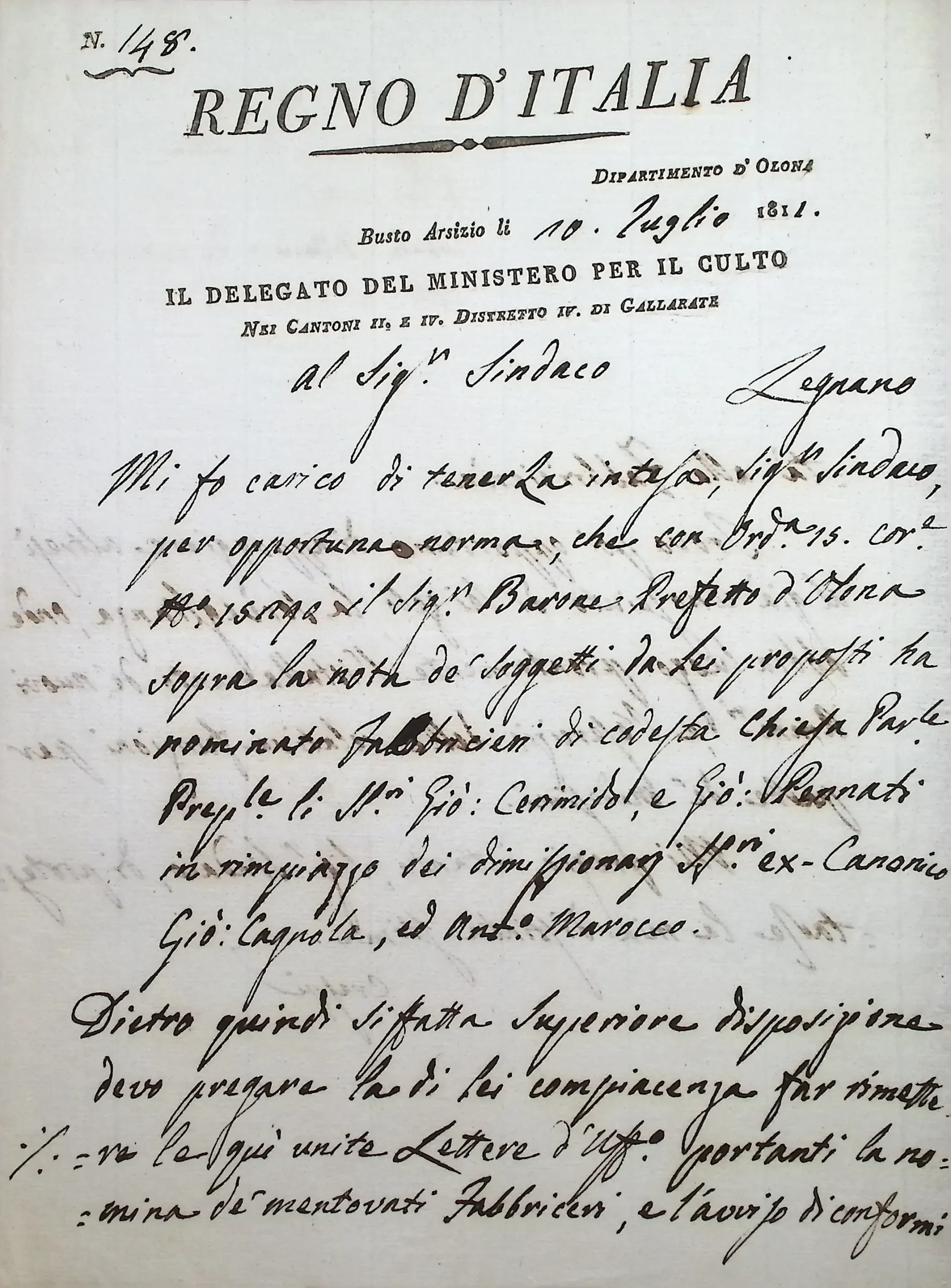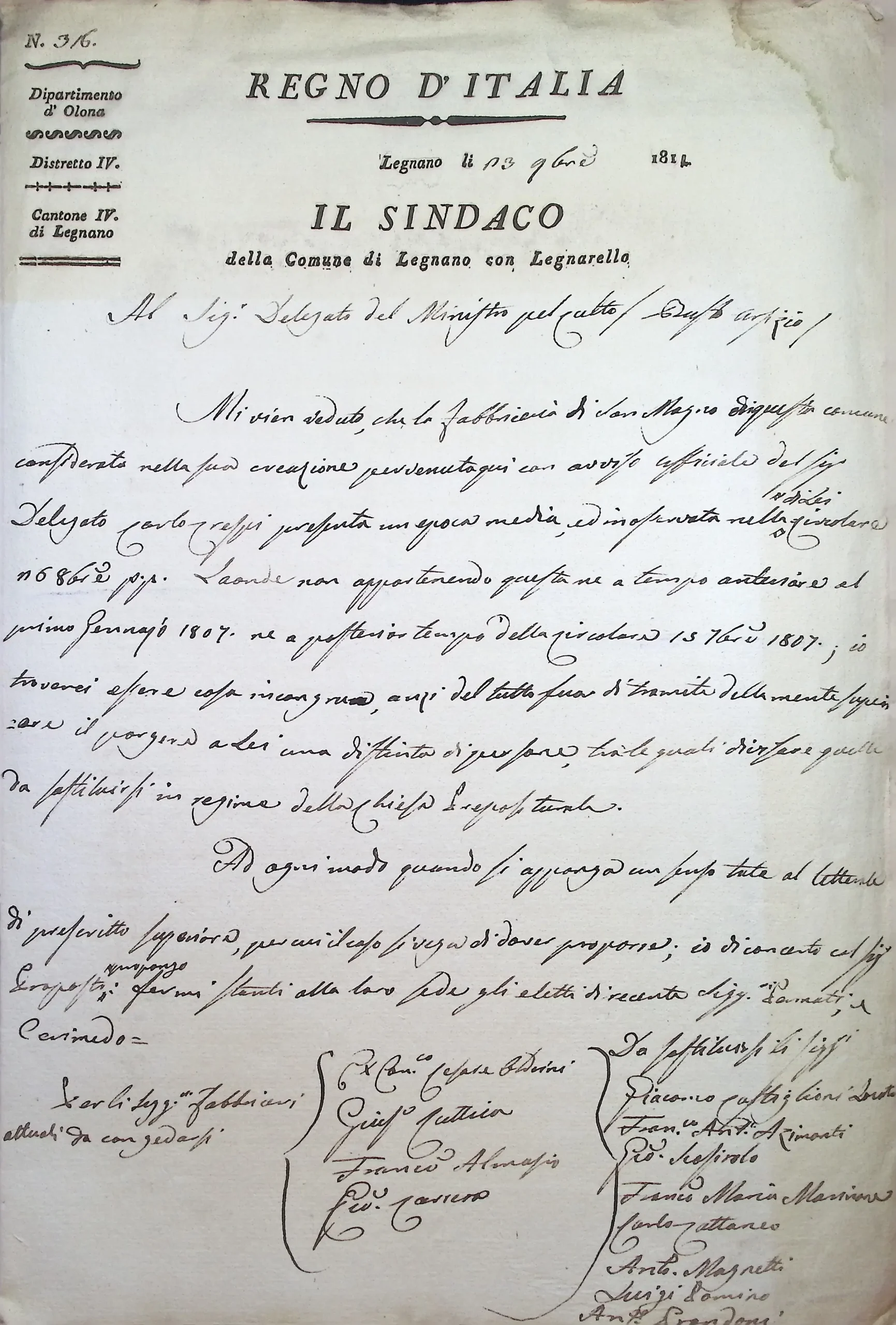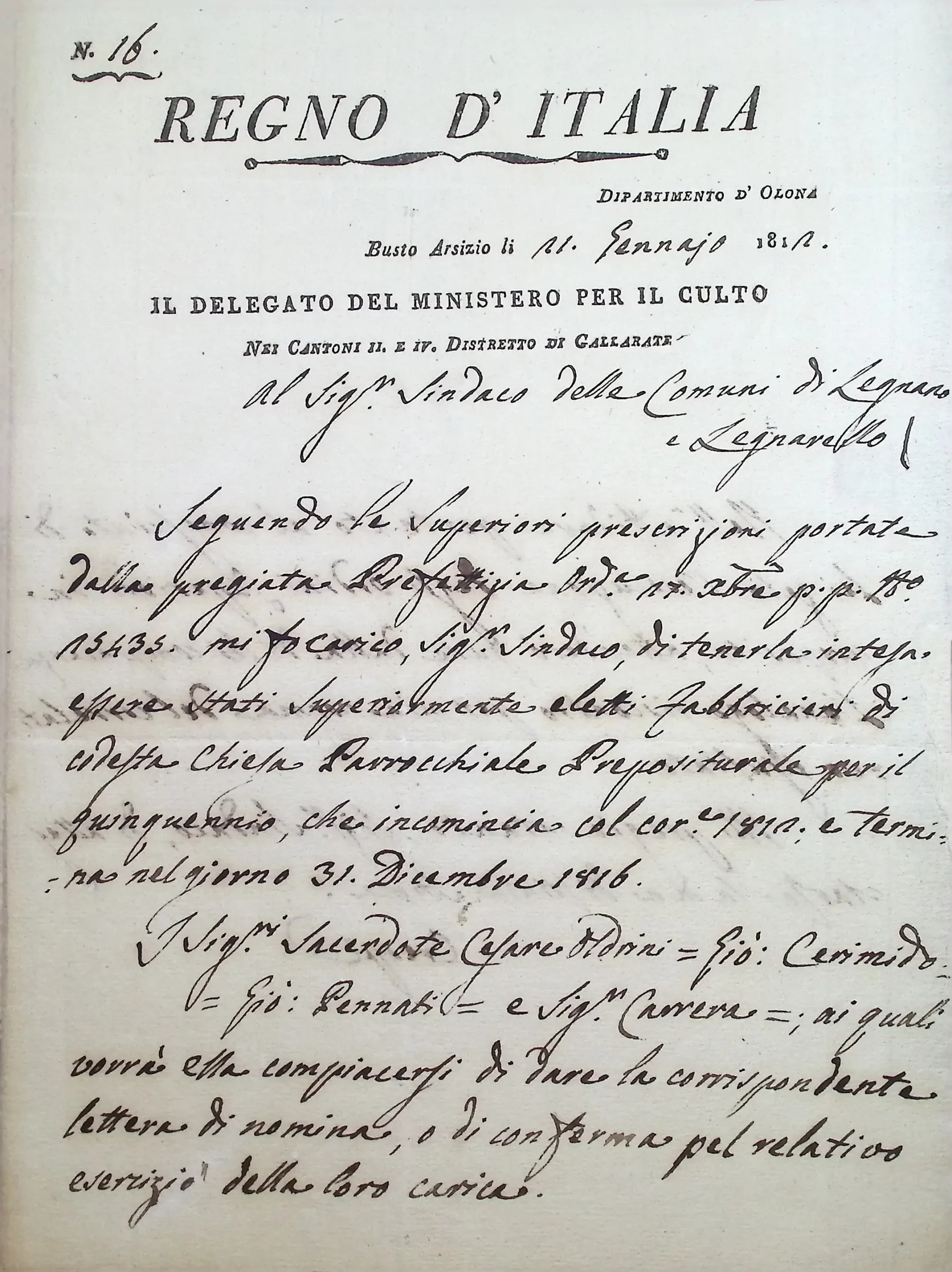Carteggio con il Delegato del Ministero per il Culto relativo alla nomina dei fabbricieri della chiesa prepositurale di S. Magno per il quinquennio 1812-1816