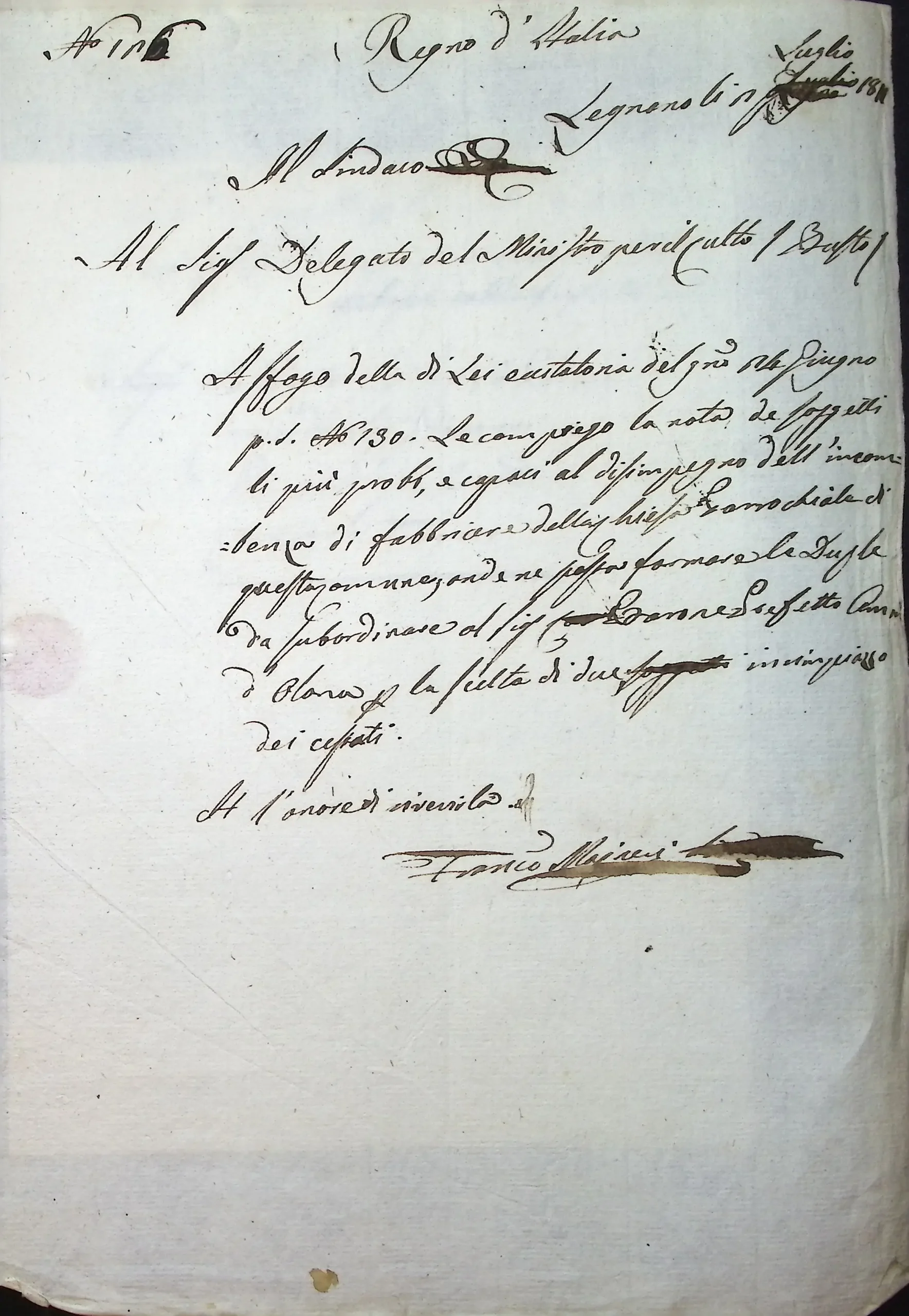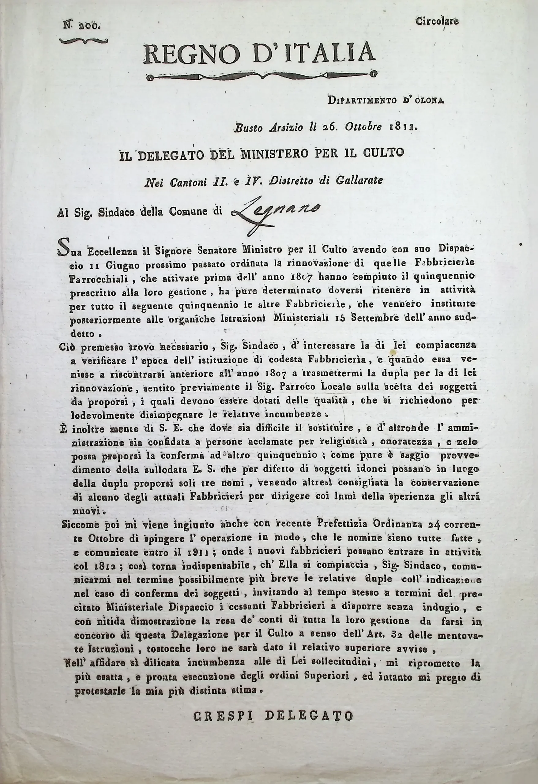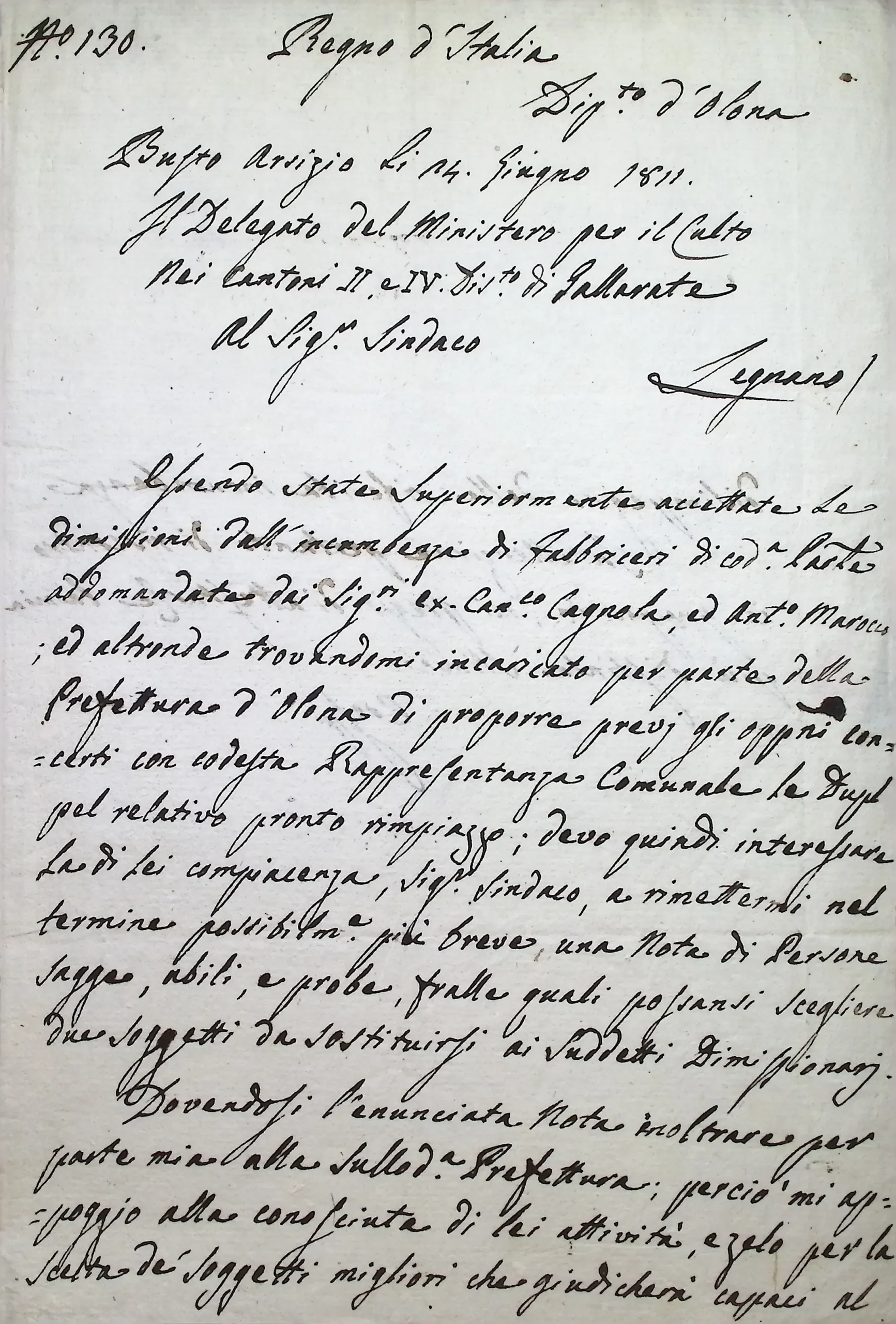 Carteggio con il Delegato del Ministero per il Culto relativo alla nomina dei fabbricieri della chiesa prepositurale di S. Magno per il quinquennio 1812-1816