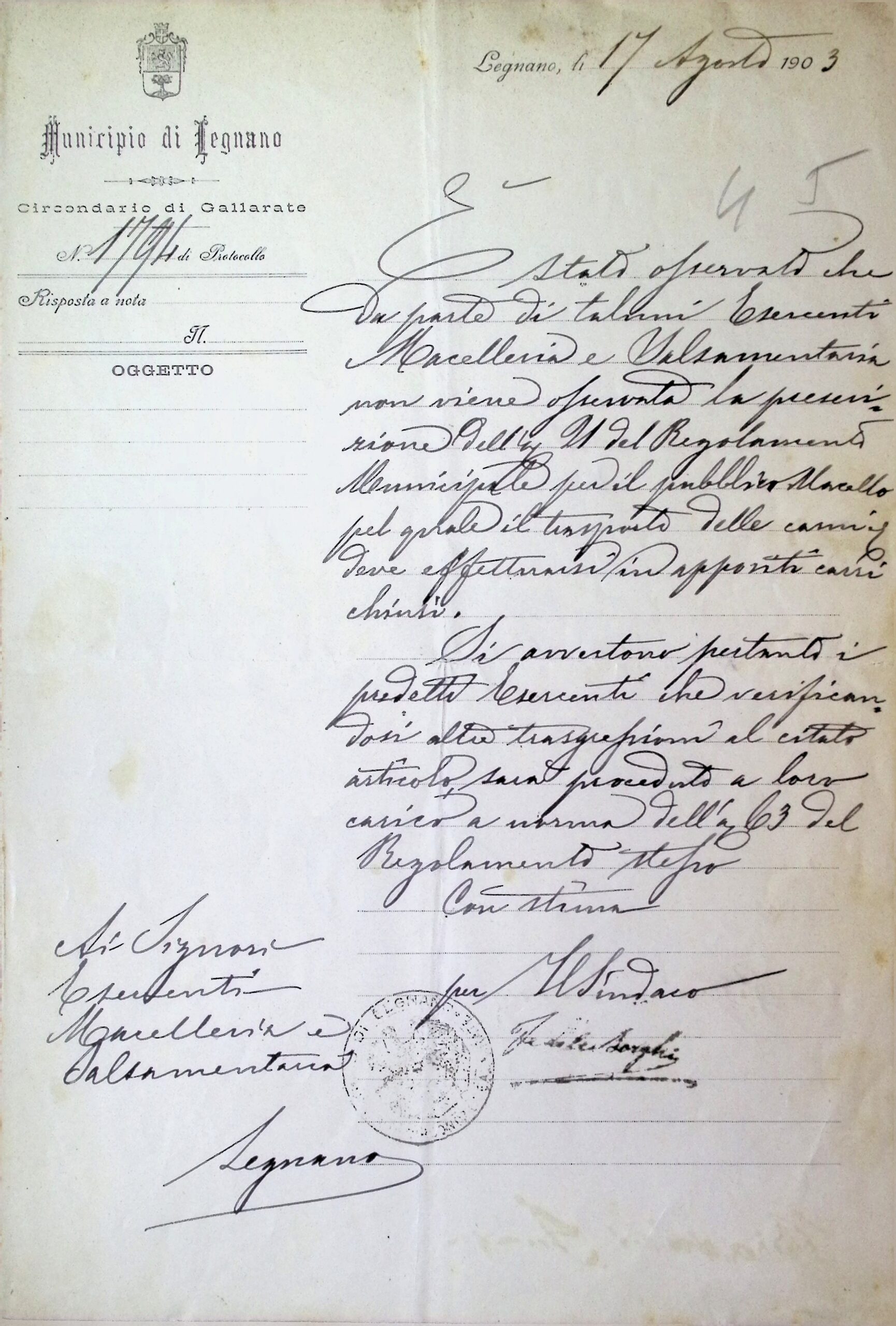 Circolare agli esercenti riguardo le norme vigenti sull’igiene della vendita delle carni e trasporto delle carni per quanto riguarda il Civico Macello del Comune di Legnano