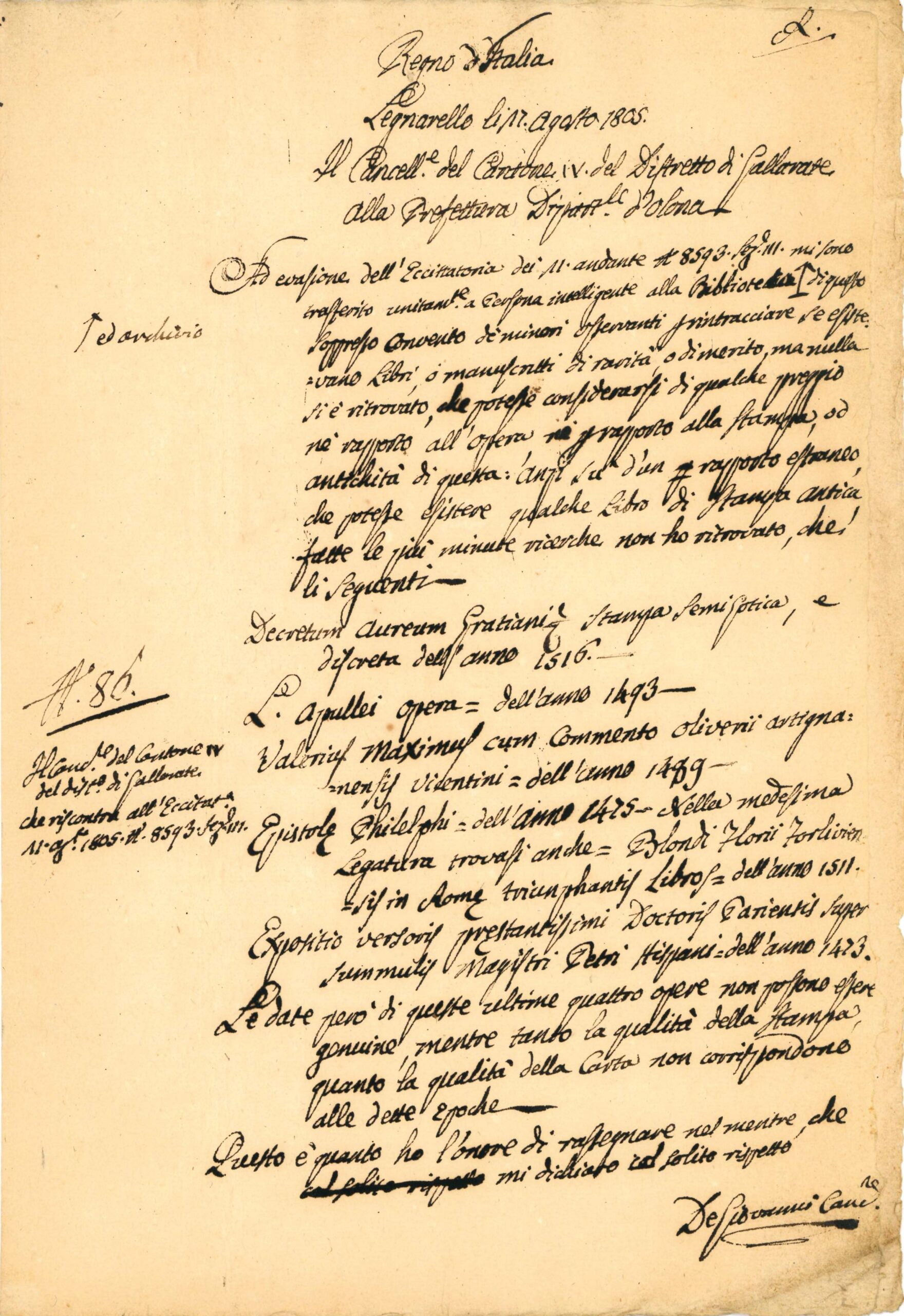 Comunicazione del Cancelliere del Cantone alla Prefettura Dipartimentale d’Olona dell’esito della ricerca di libri e manoscritti nel soppresso monastero dei Minori Osservanti