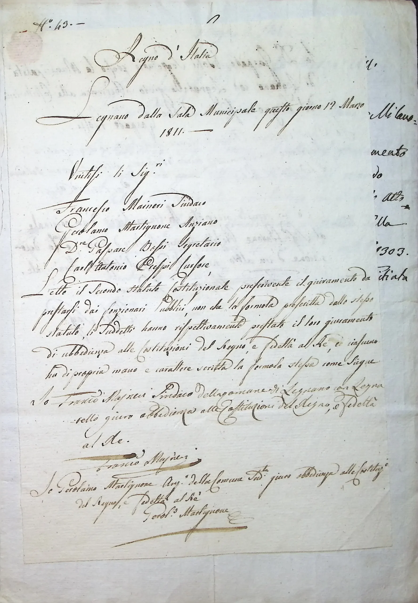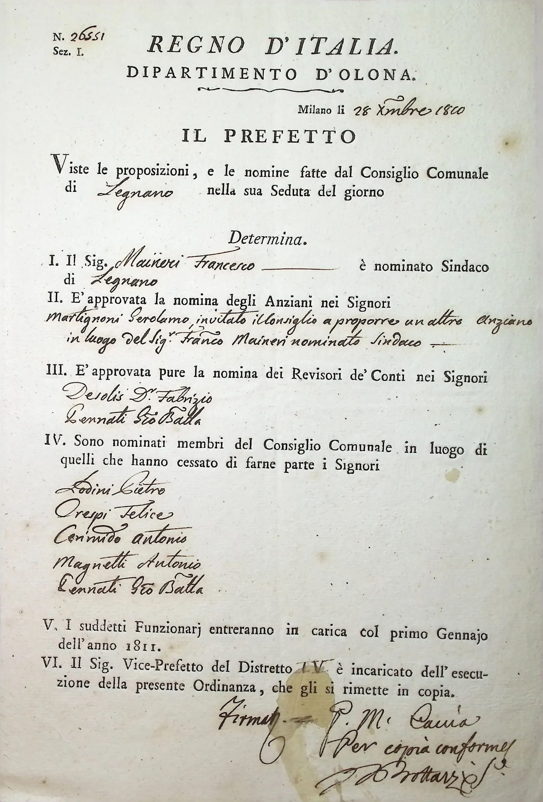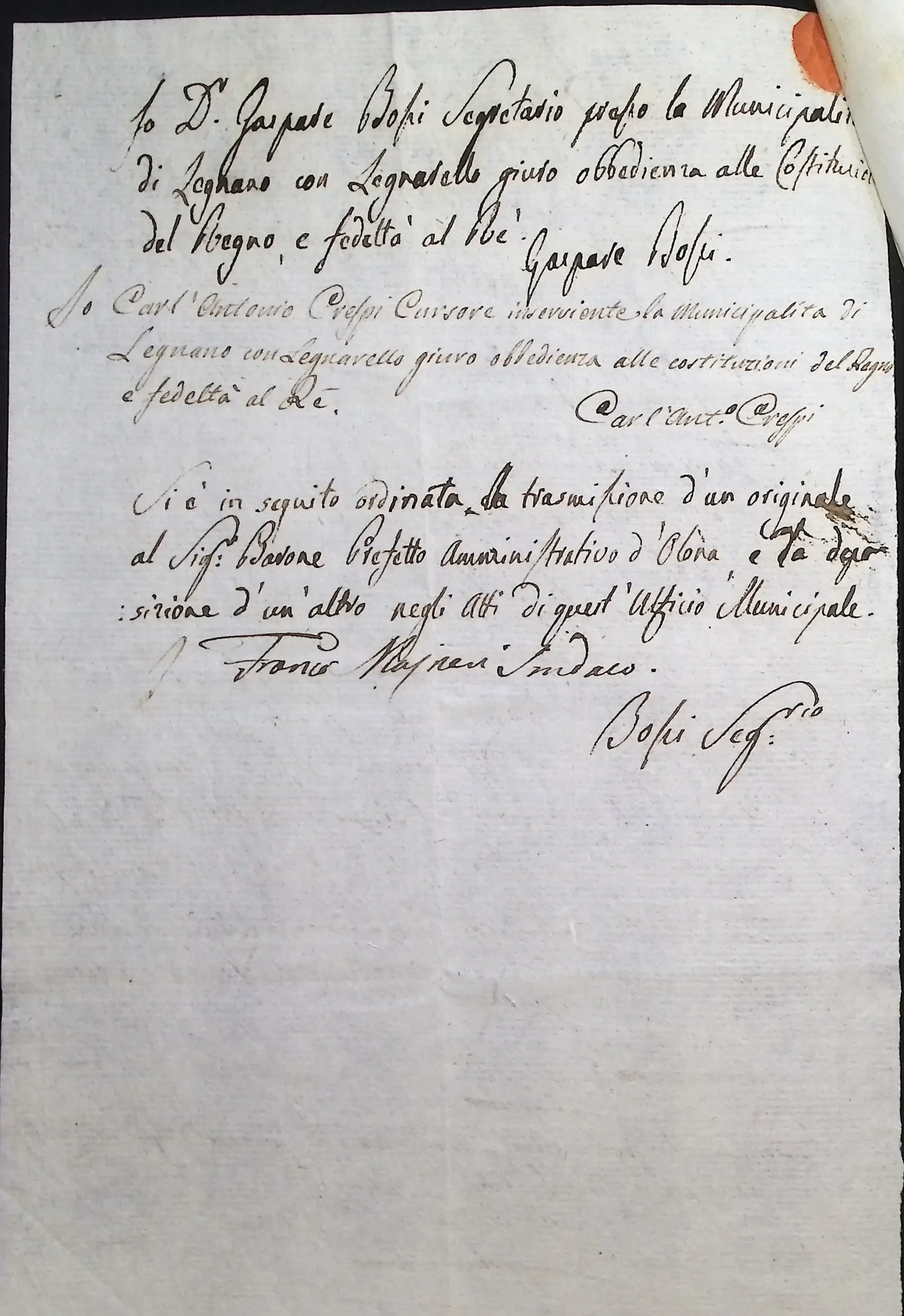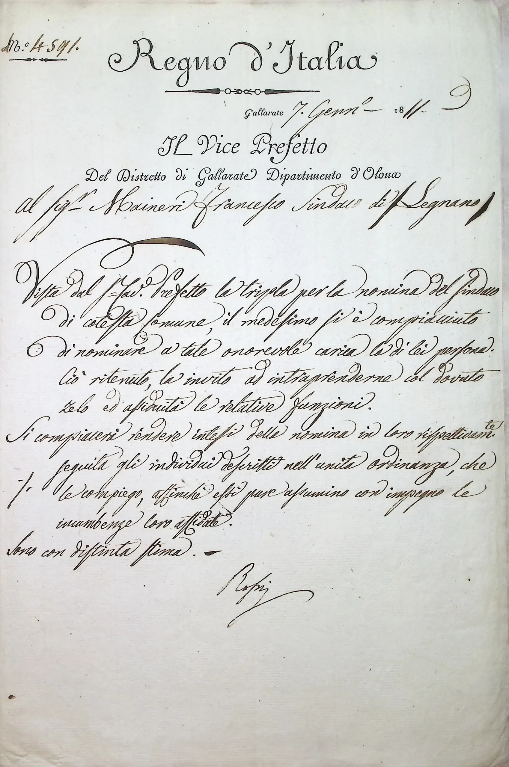 Carteggio relativo alla nomina del sig. Francesco Maineri a Sindaco del Comune e suo giuramento