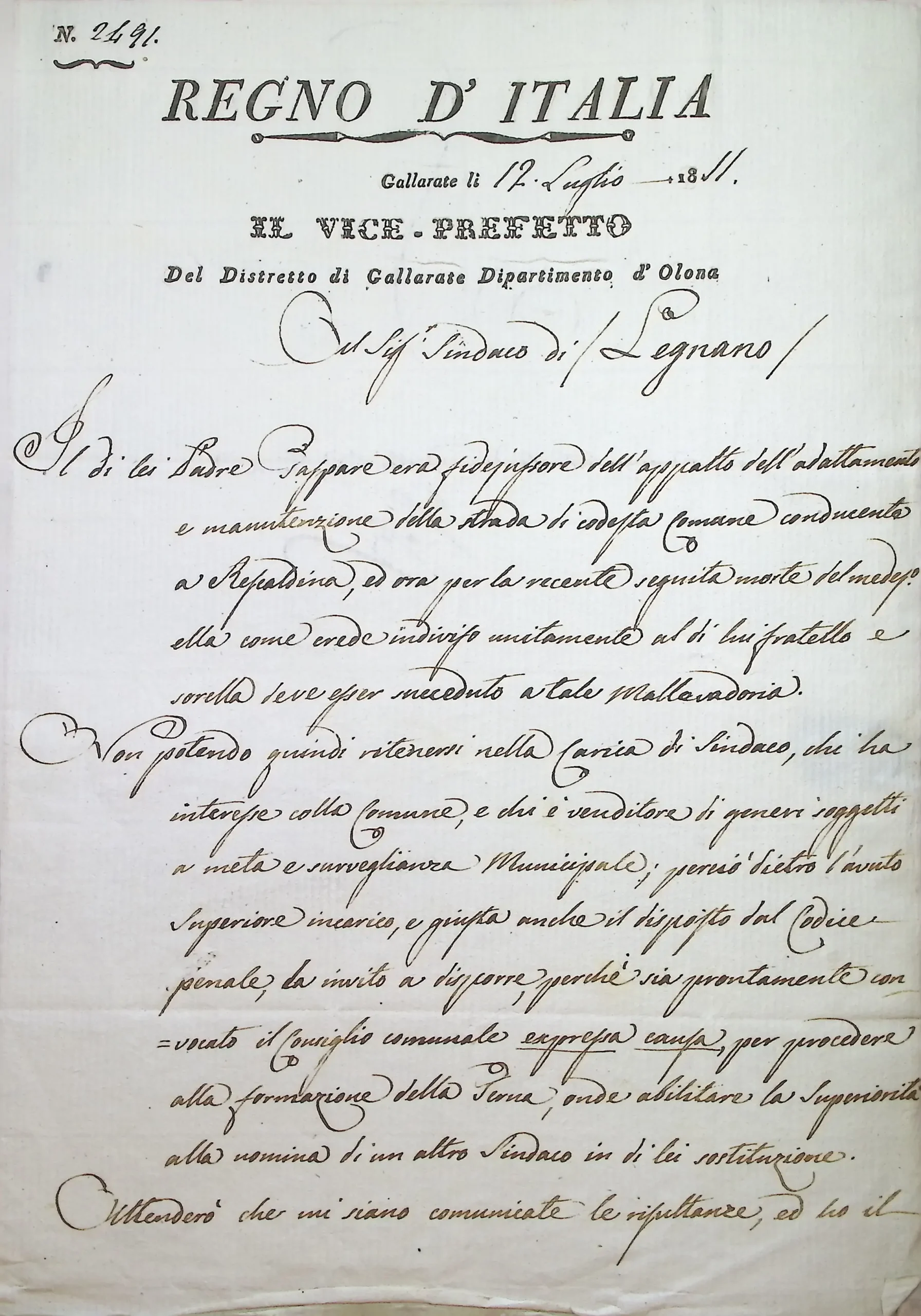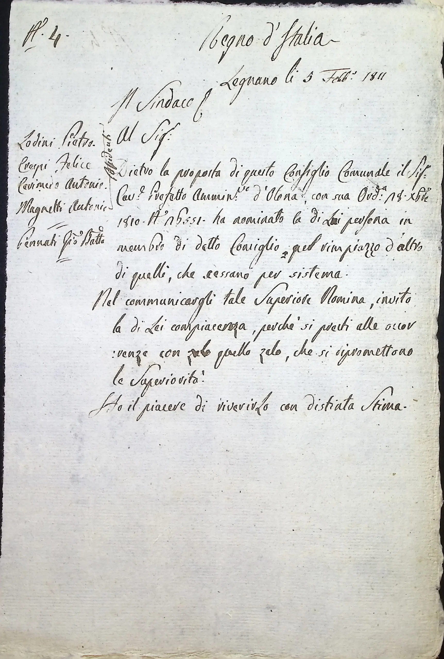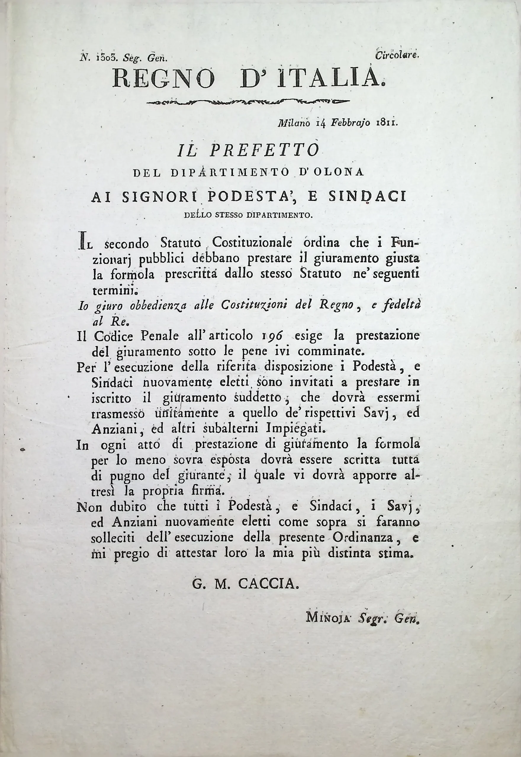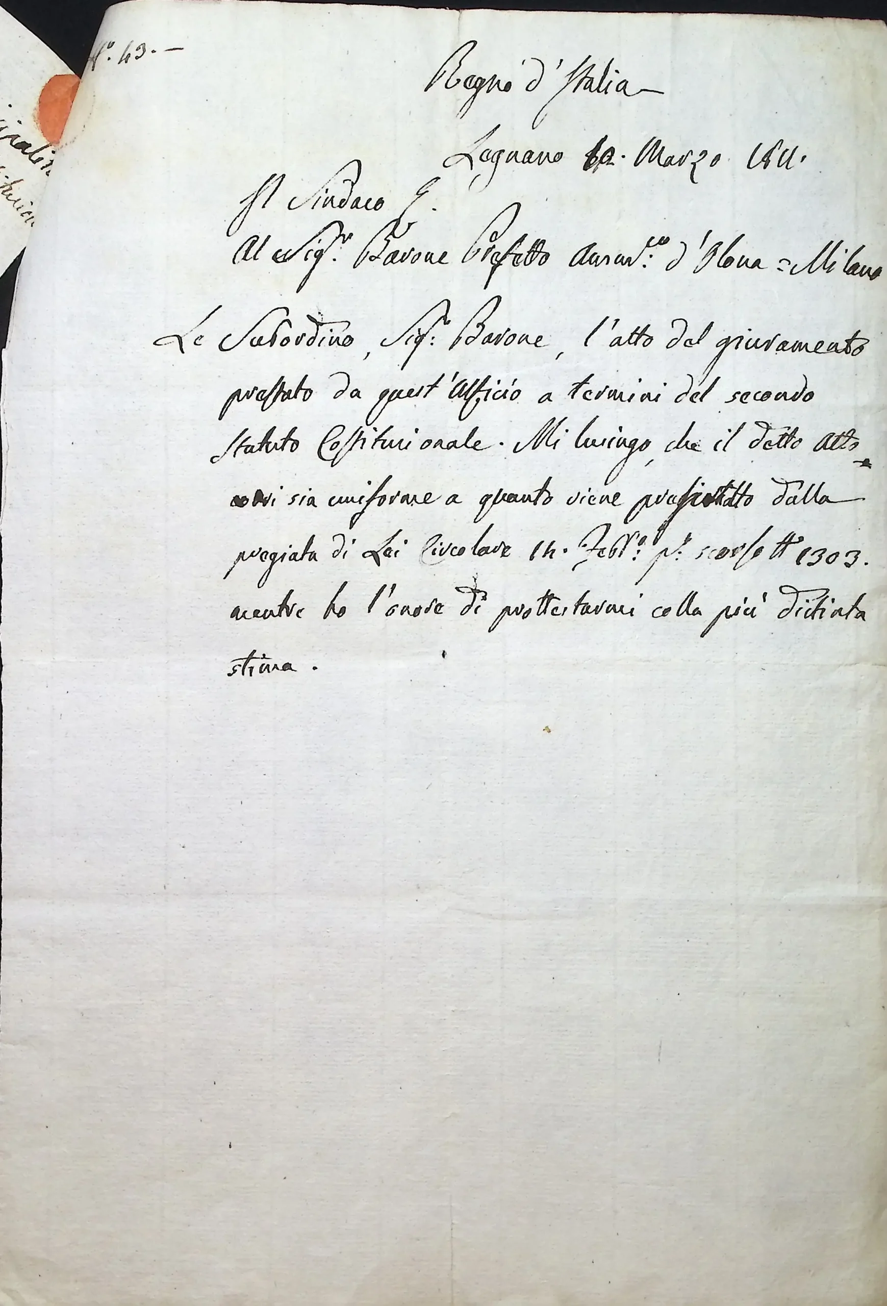 Carteggio relativo alla nomina del sig. Francesco Maineri a Sindaco del Comune e suo giuramento