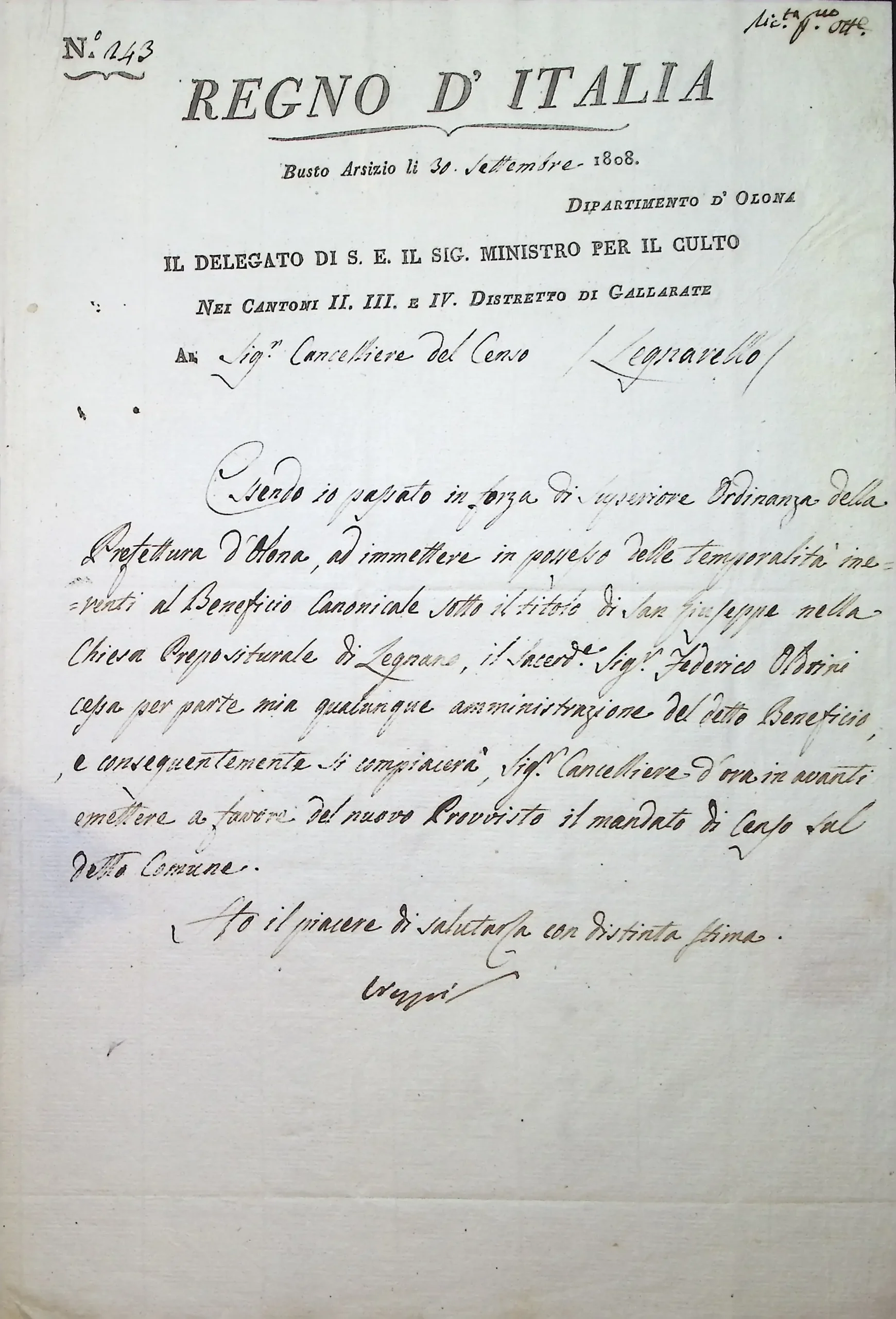 Carteggio relativo all’Amministrazione del beneficio canonicale di S. Giuseppe nella chiesa prepositurale di Legnano