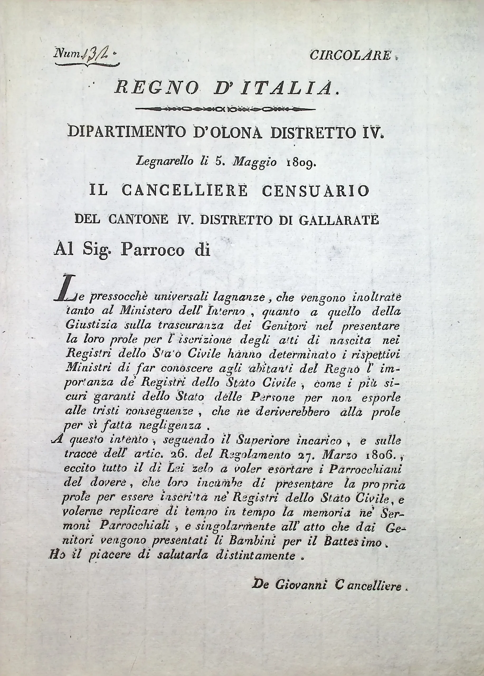 Circolare del Cancelliere Censuario per l’iscrizione dei nati nei registri di stato civile