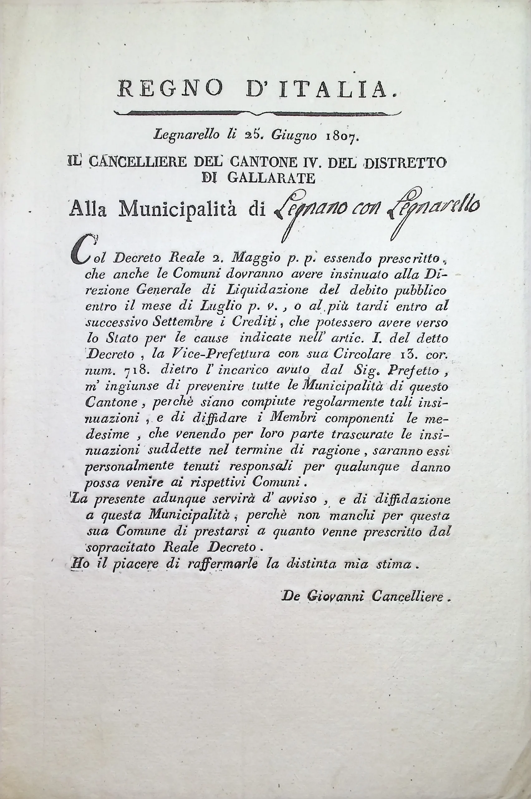 Circolare del Cancelliere del Cantone sulla insinuazione di crediti alla Direzione Generale di Liquidazione del debito pubblico