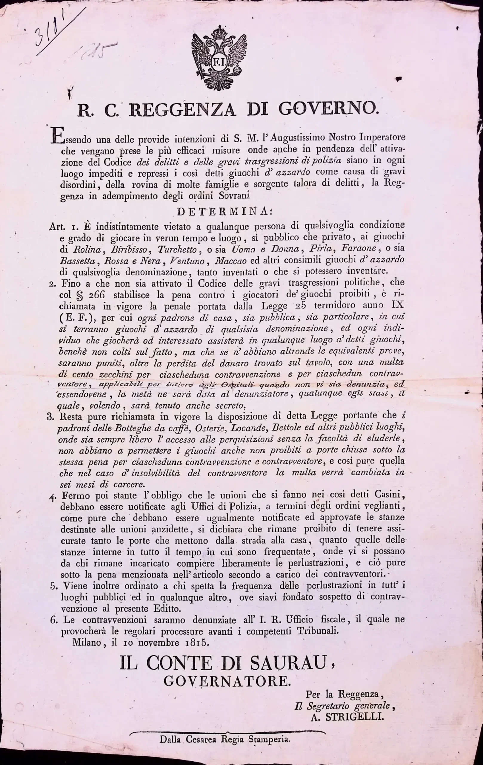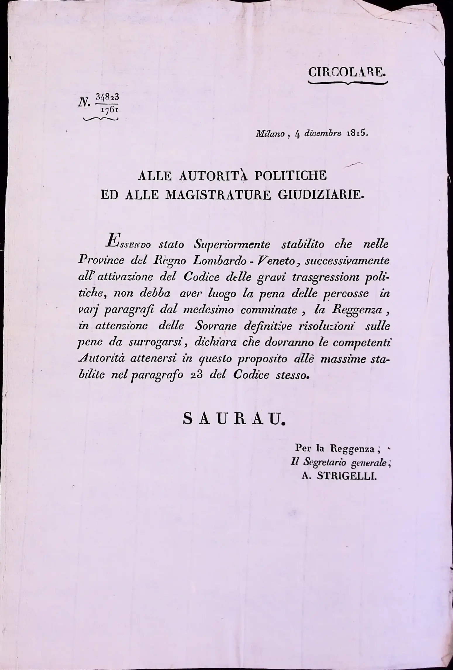 Circolare del Governatore circa l’inapplicabilità della pena delle percosse per le gravi trasgressioni politiche