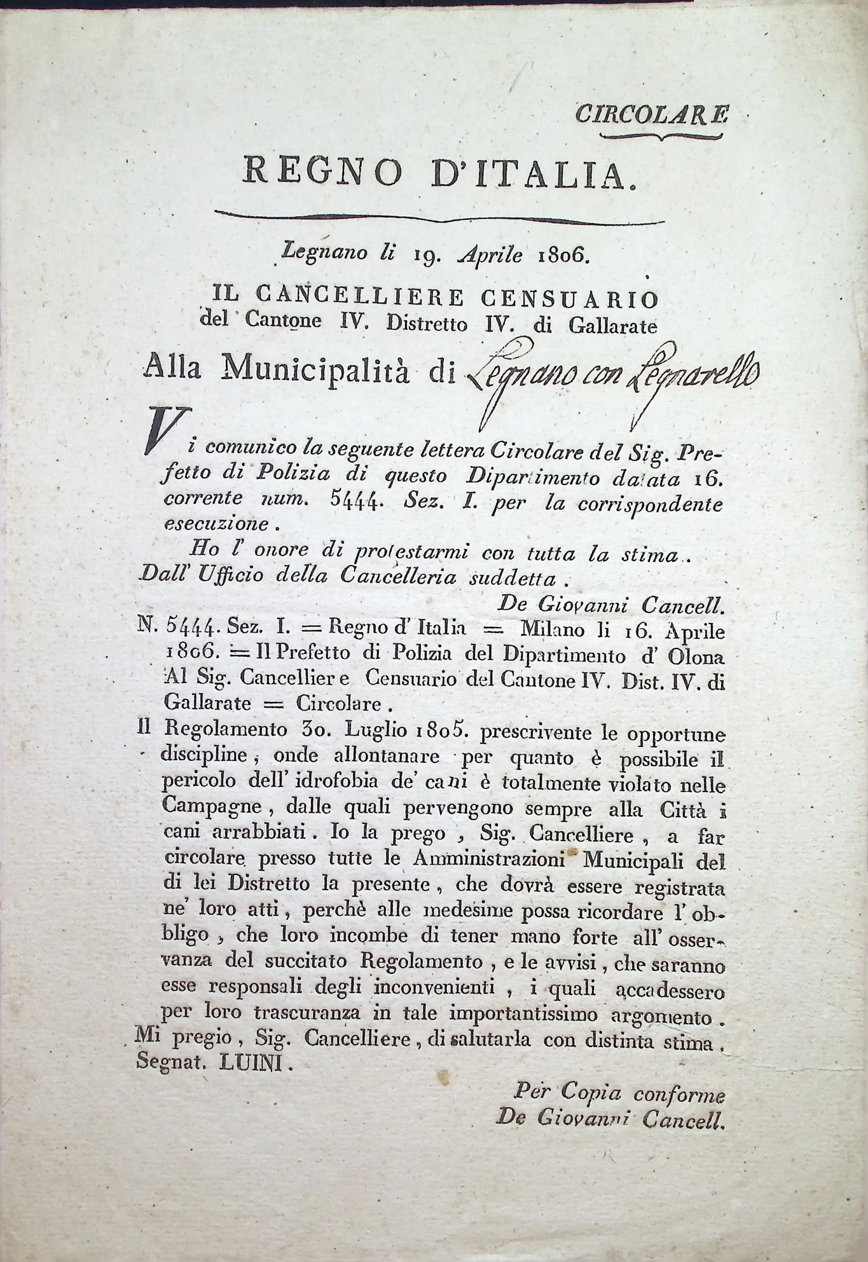 Circolare del Prefetto di Polizia circa il pericolo dei cani idrofobi