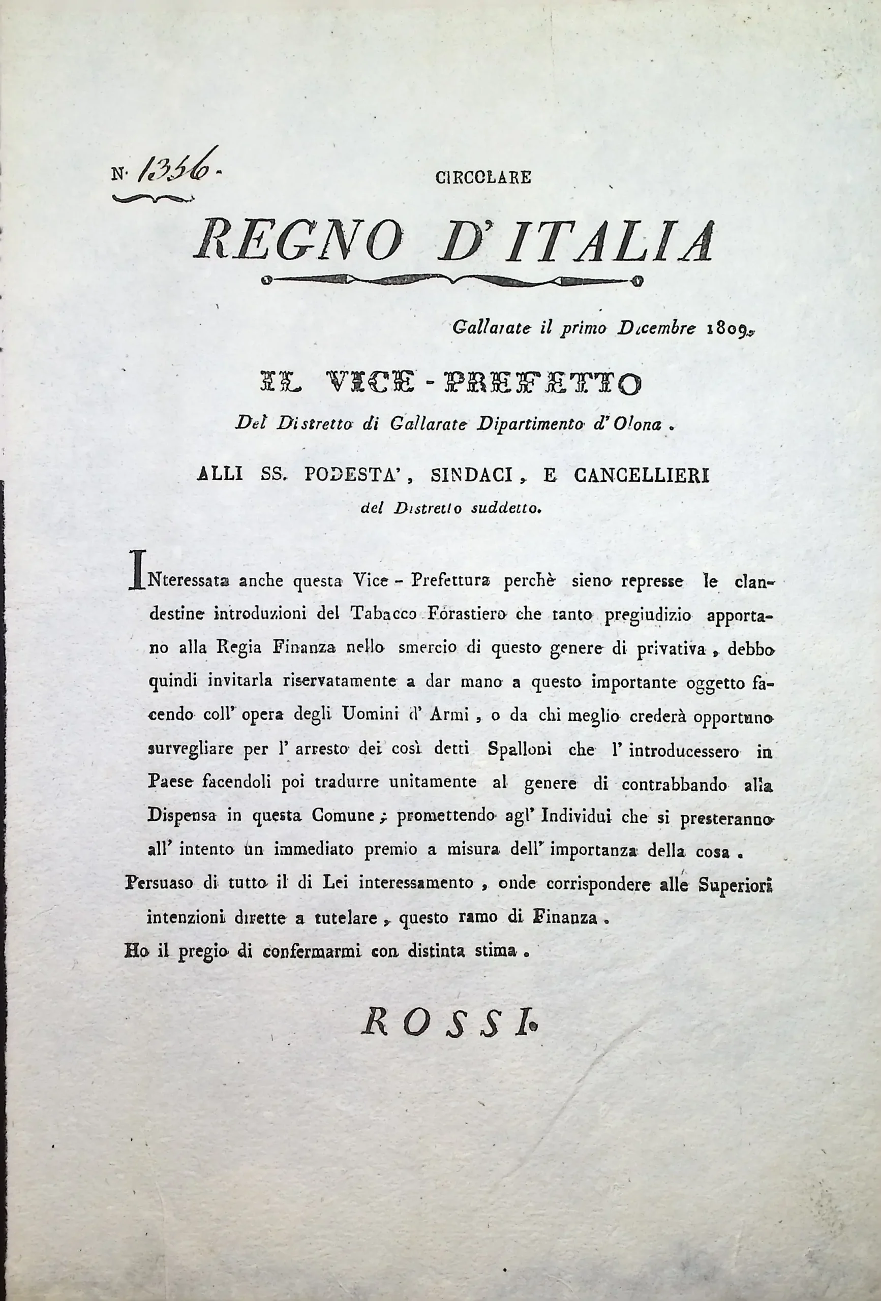 Circolare del vice Prefetto del distretto per la repressione del contrabbando del tabacco