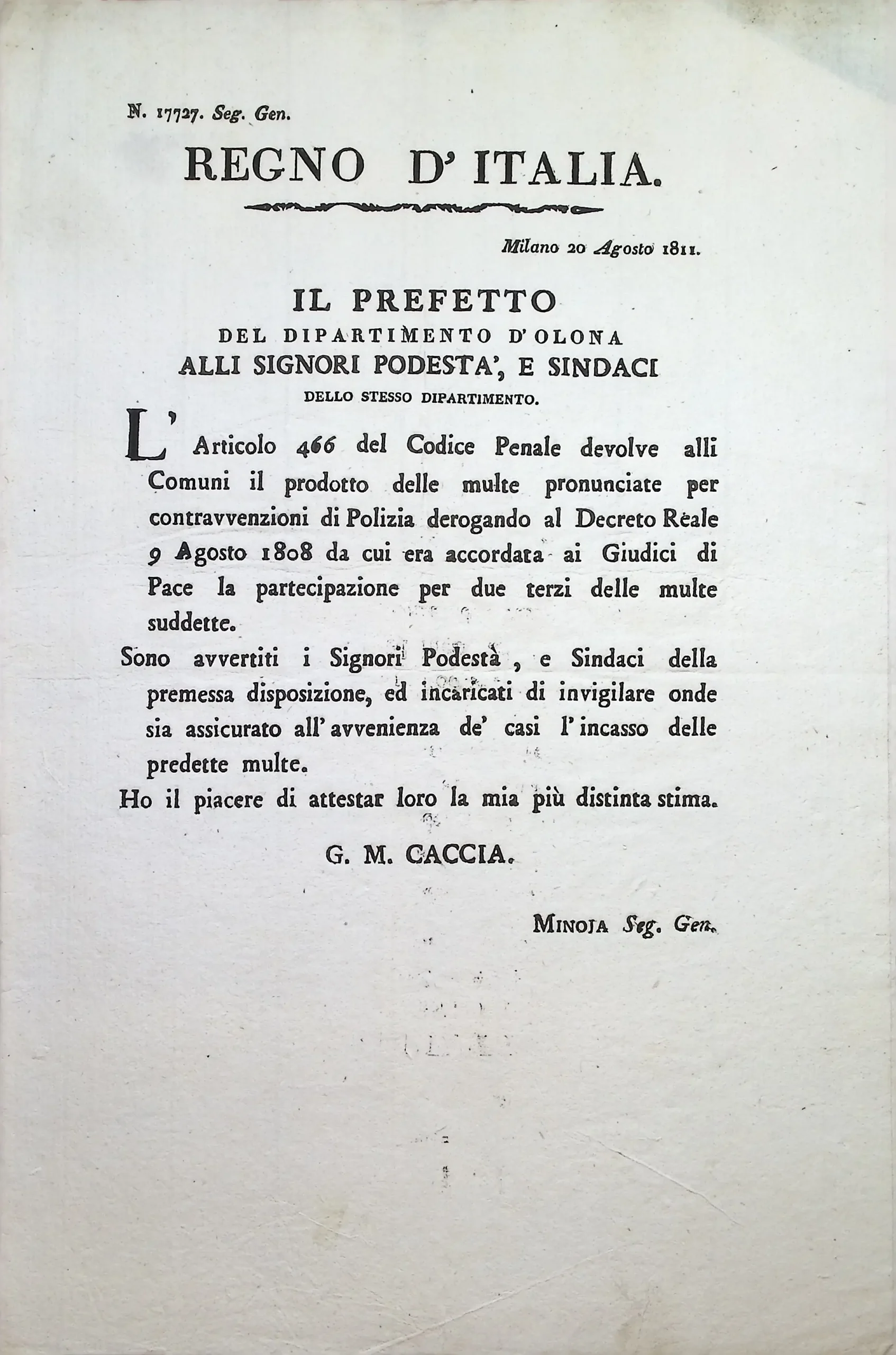 Circolare Prefettizia sulla devoluzione ai Comuni dei diritti sulle multe inflitte per contravvenzioni di polizia