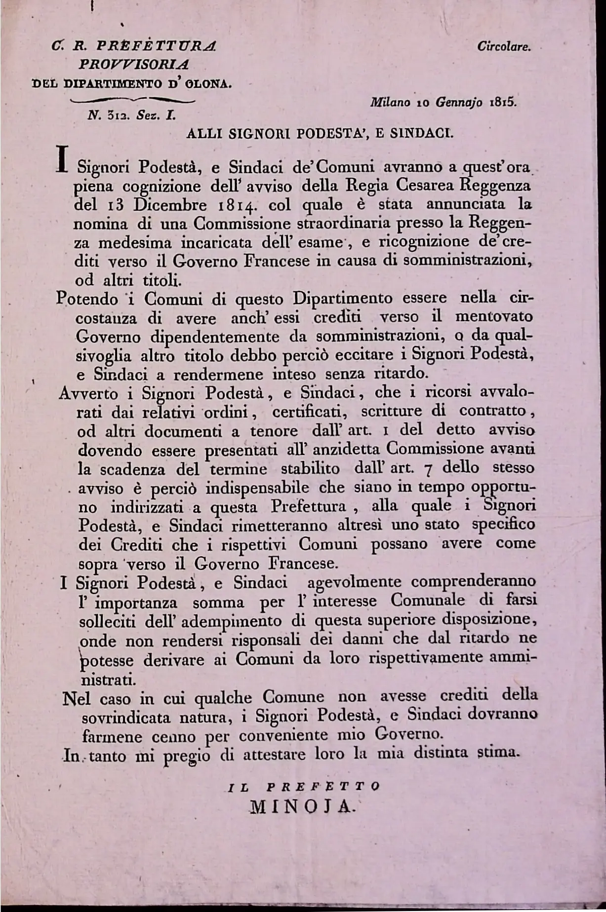 Circolare Prefettizia sulla ricognizione del credito verso il Governo Francese