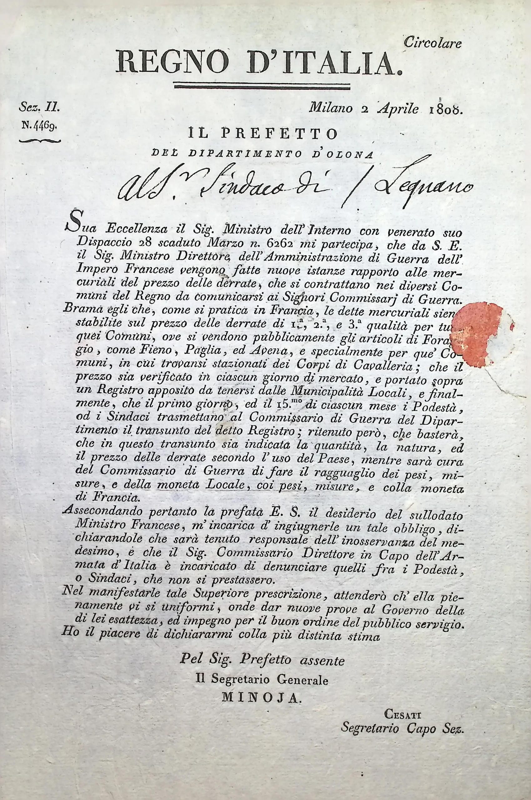 Circolare Prefettizia sulle mercuriali del prezzo delle derrate
