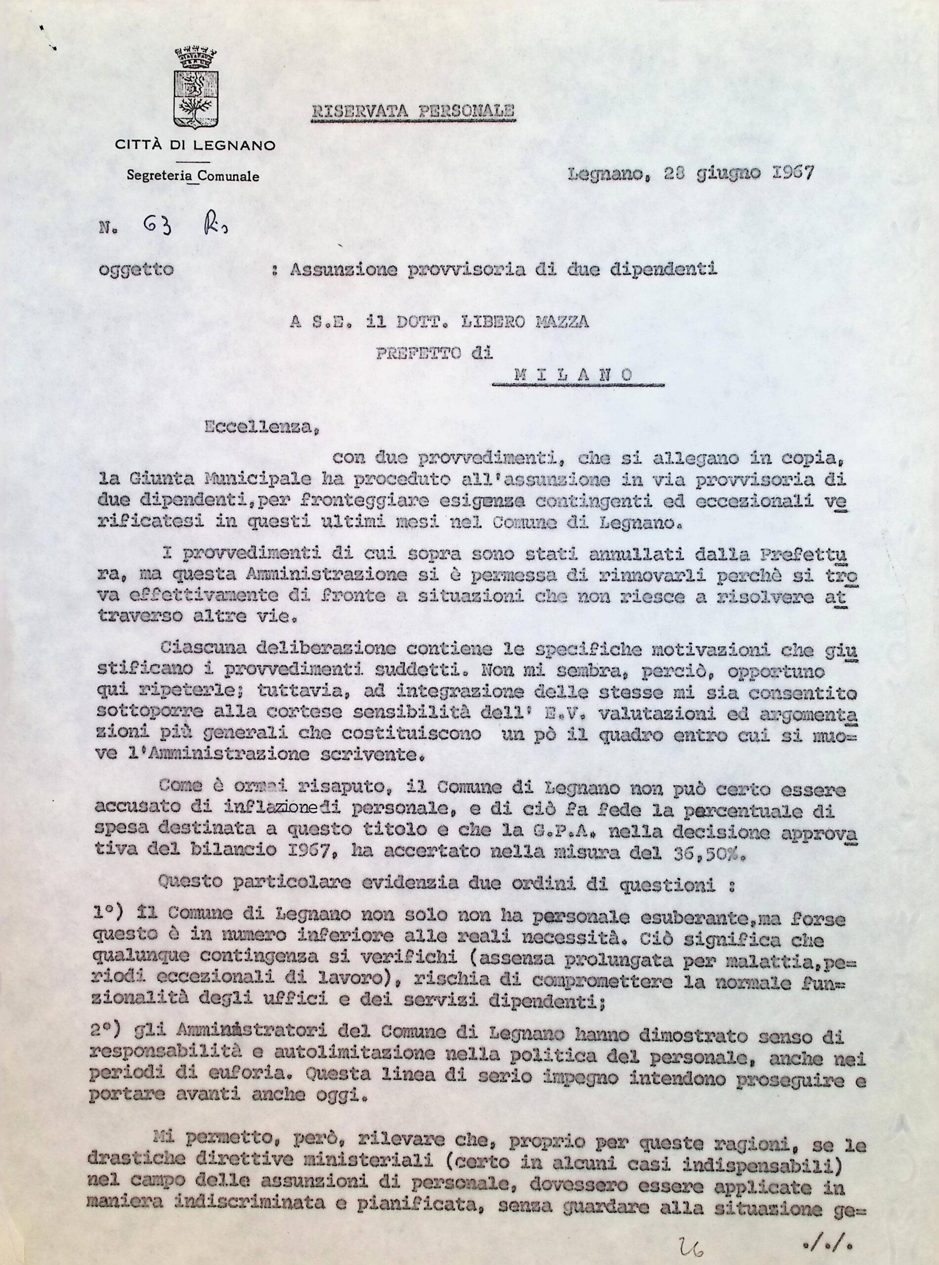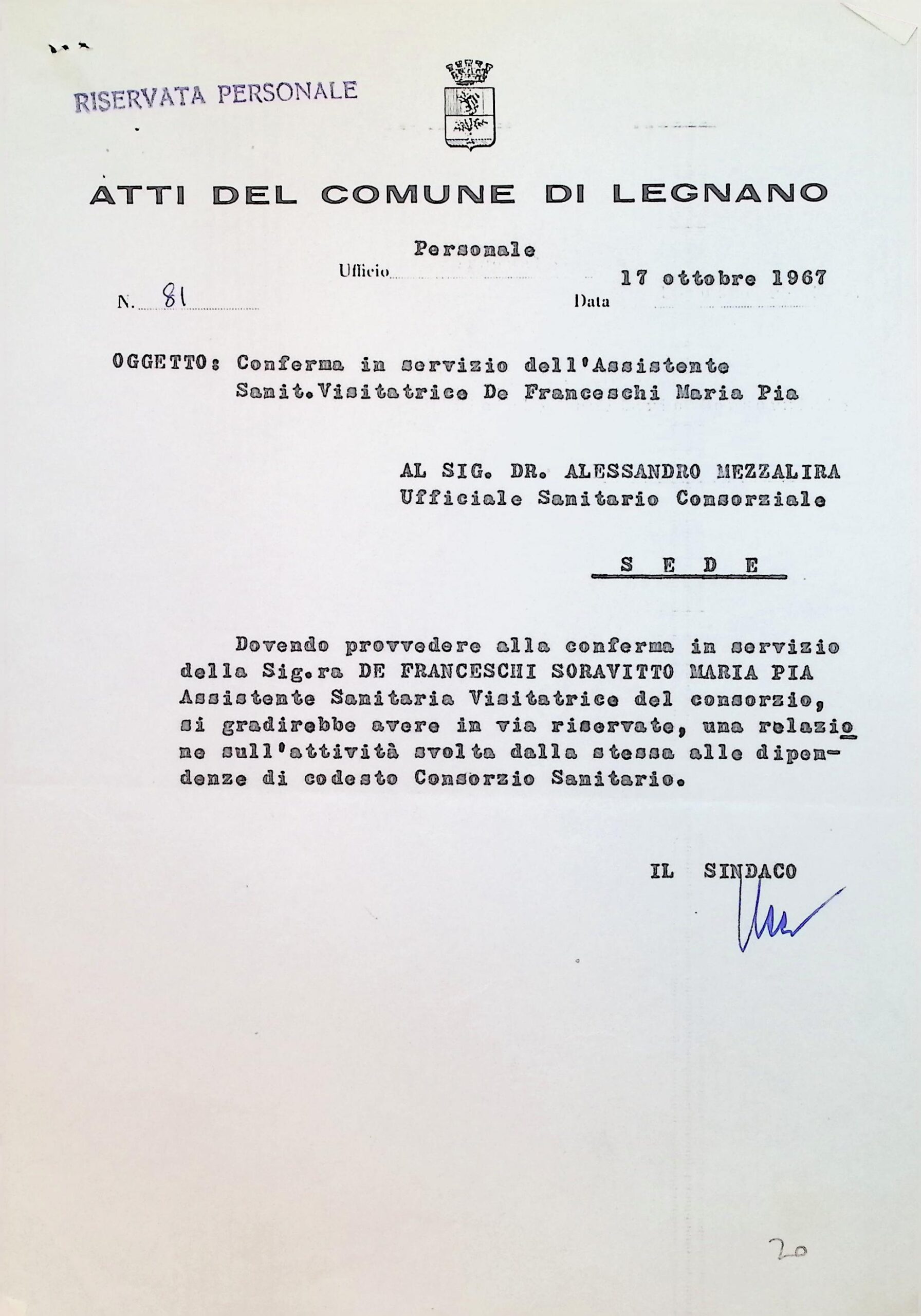 Corrispondenza personale del sig. sindaco: atti riserevati