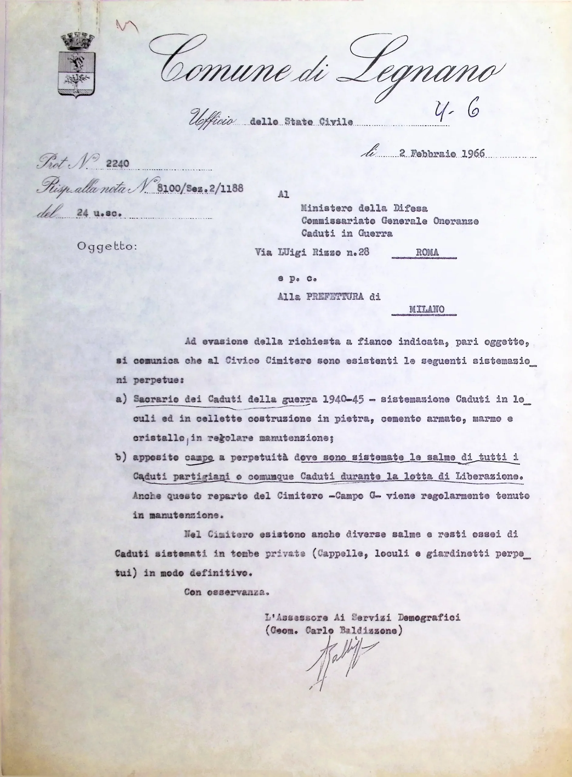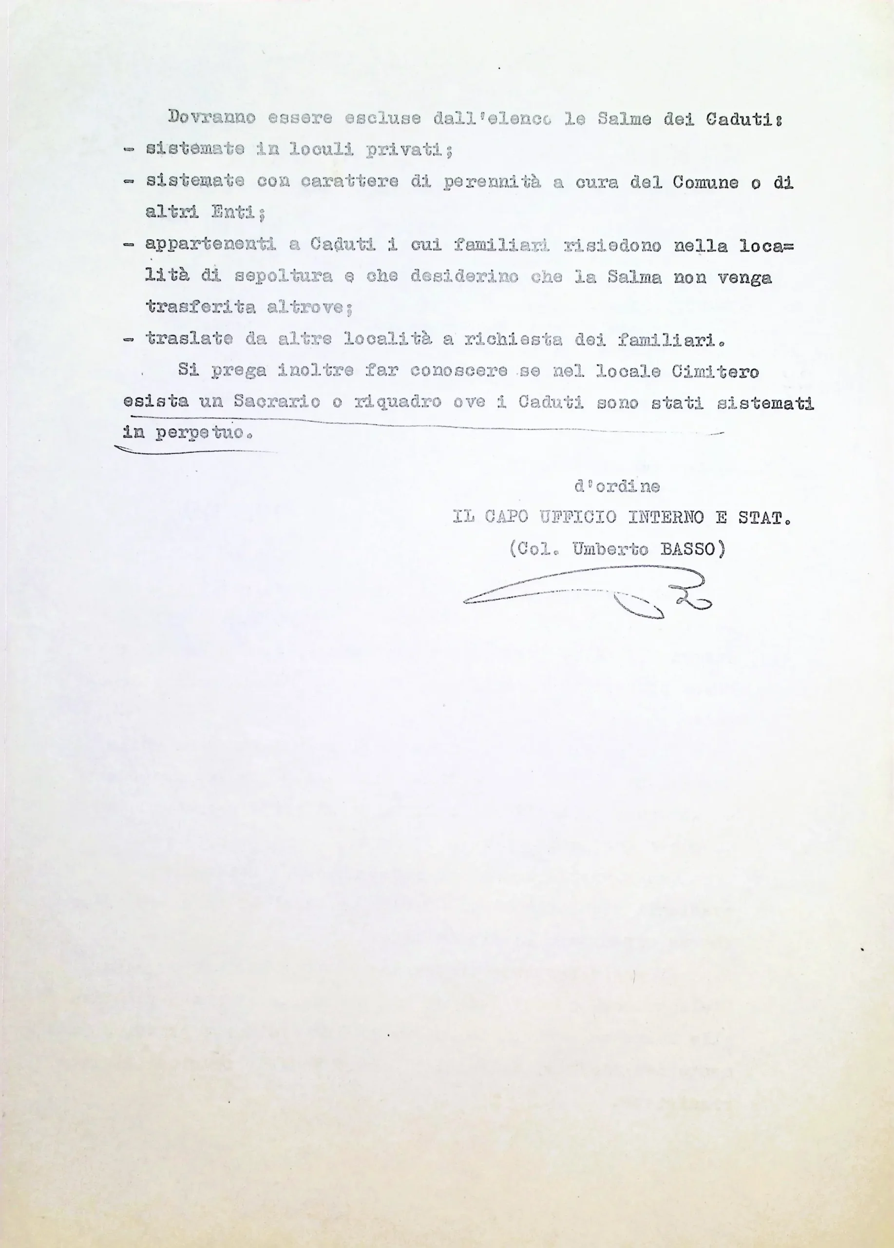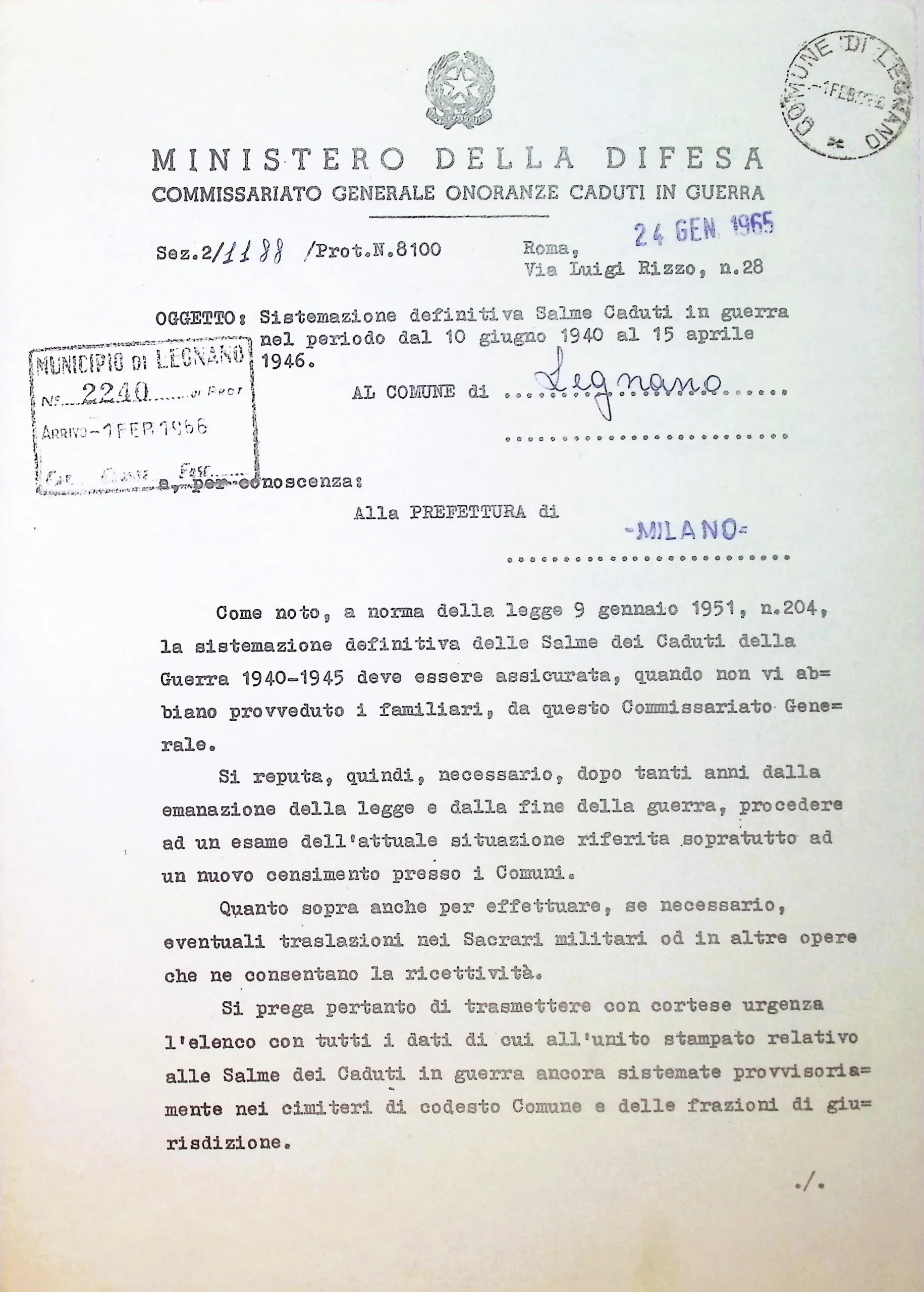 Dati sulla sepoltura dei militari caduti nella guerra 1940/45 e le salme di tutti i caduti partigiani o comunque cauti durante la lotta di liberazione