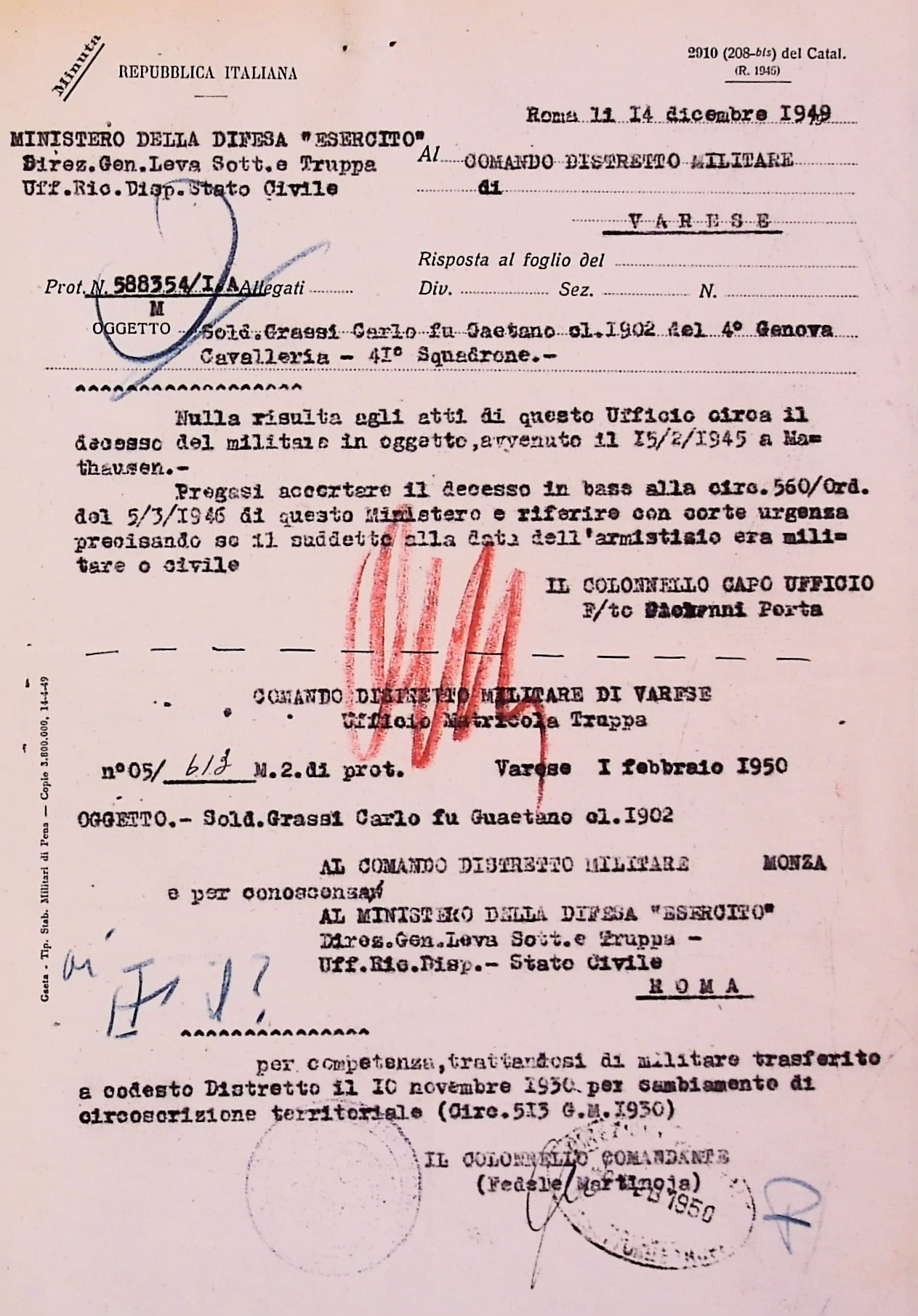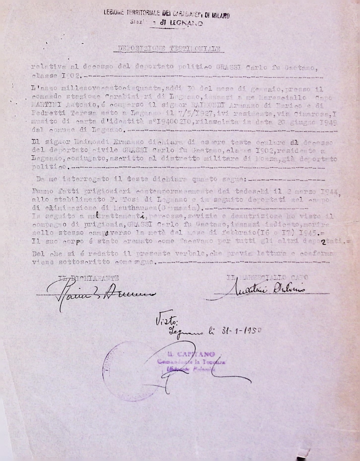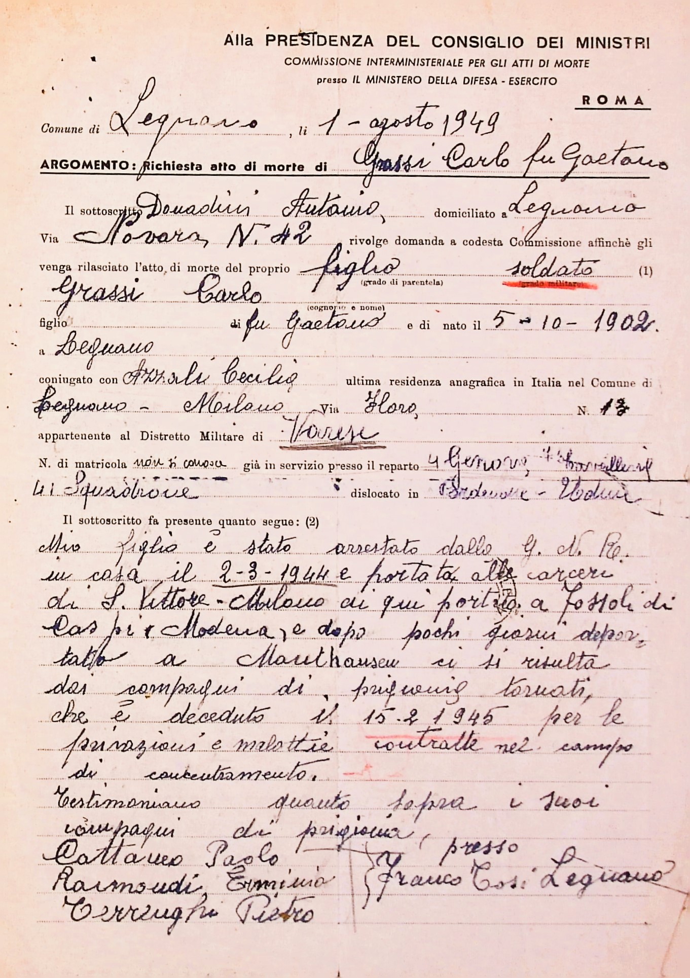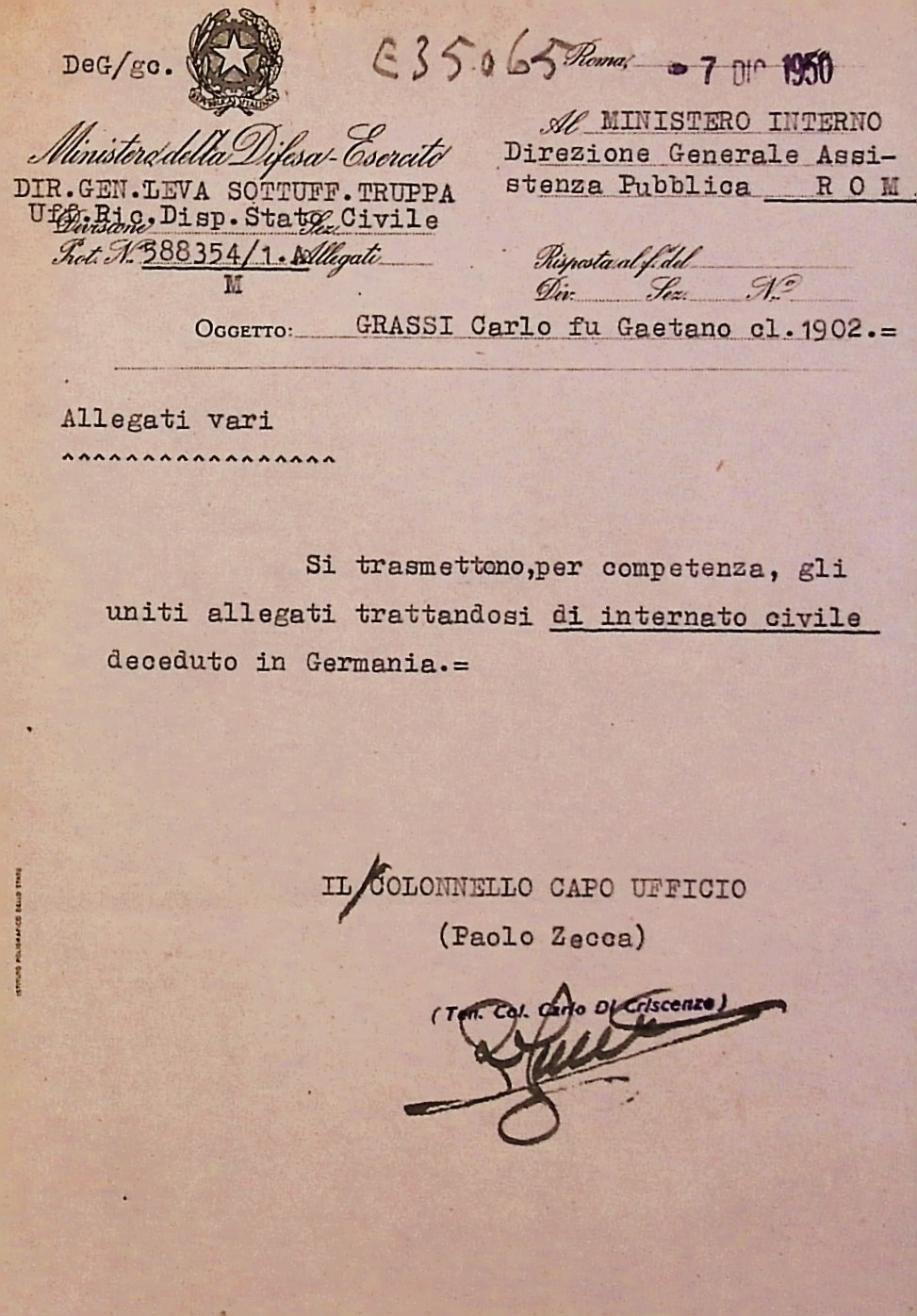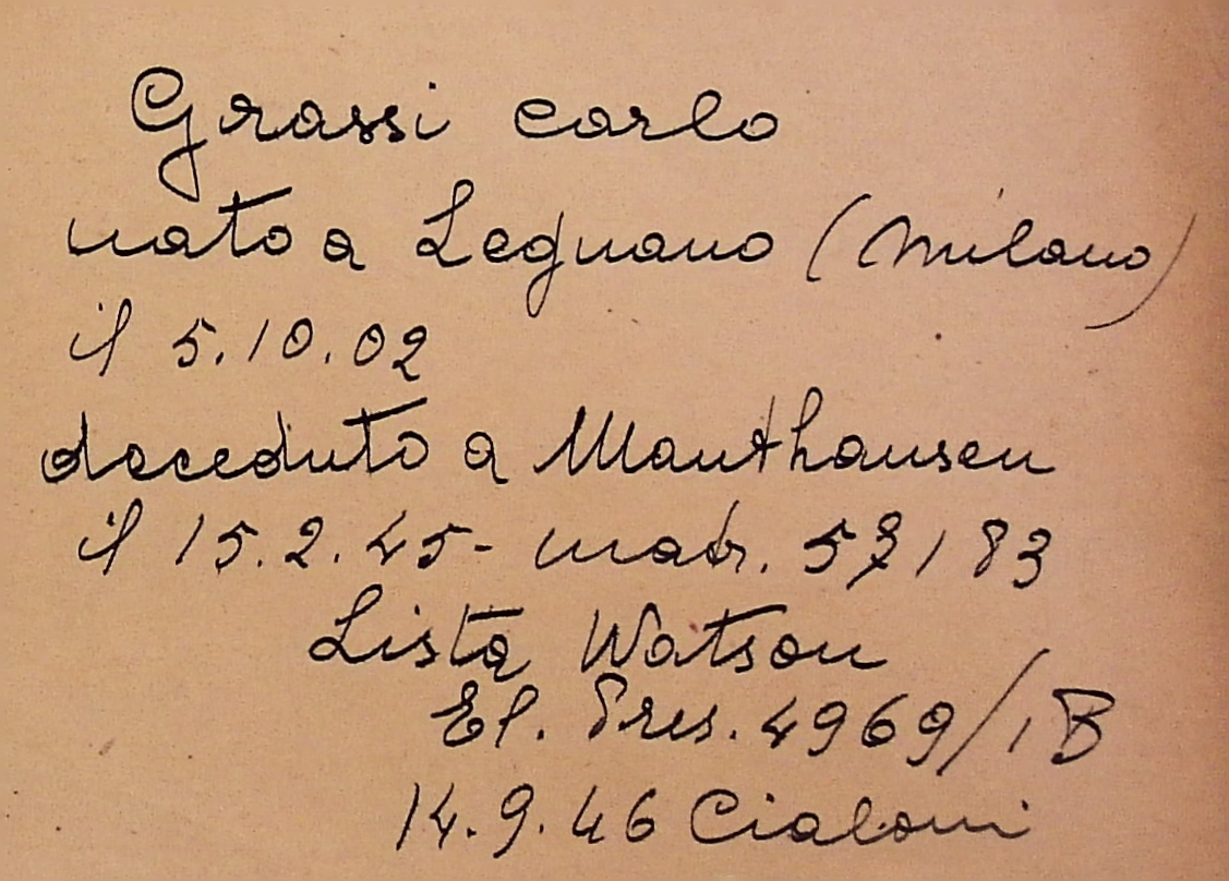 Deportato Carlo Grassi: fascicolo personale