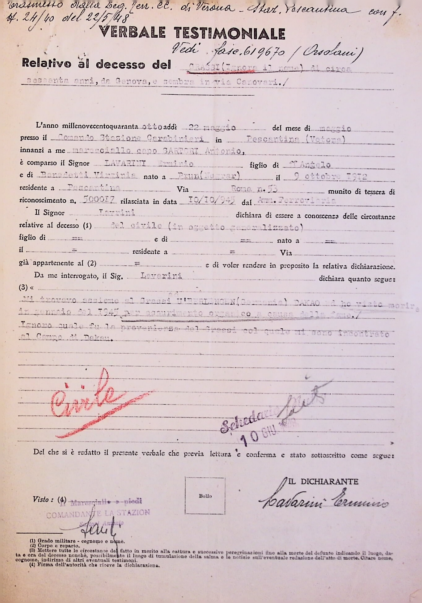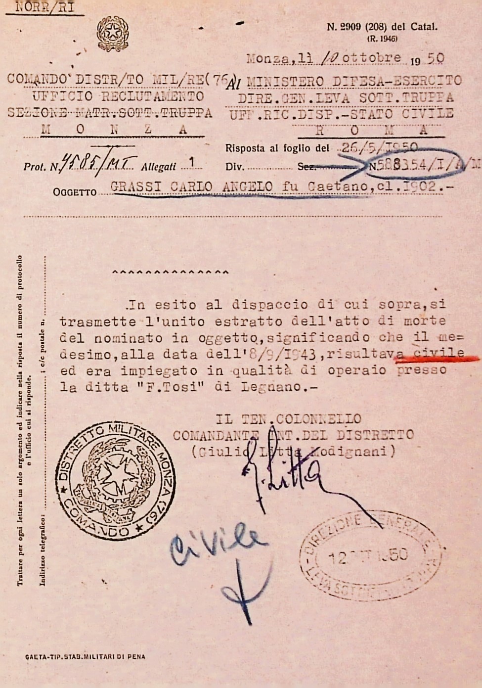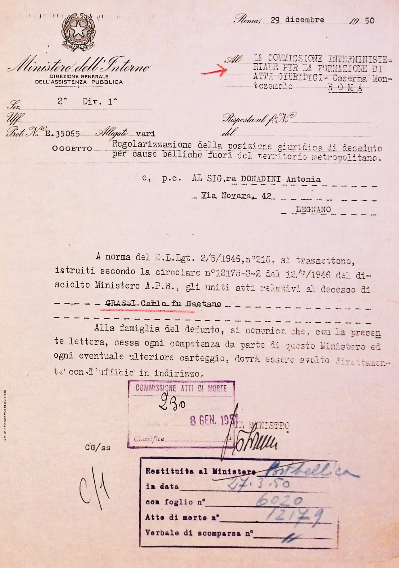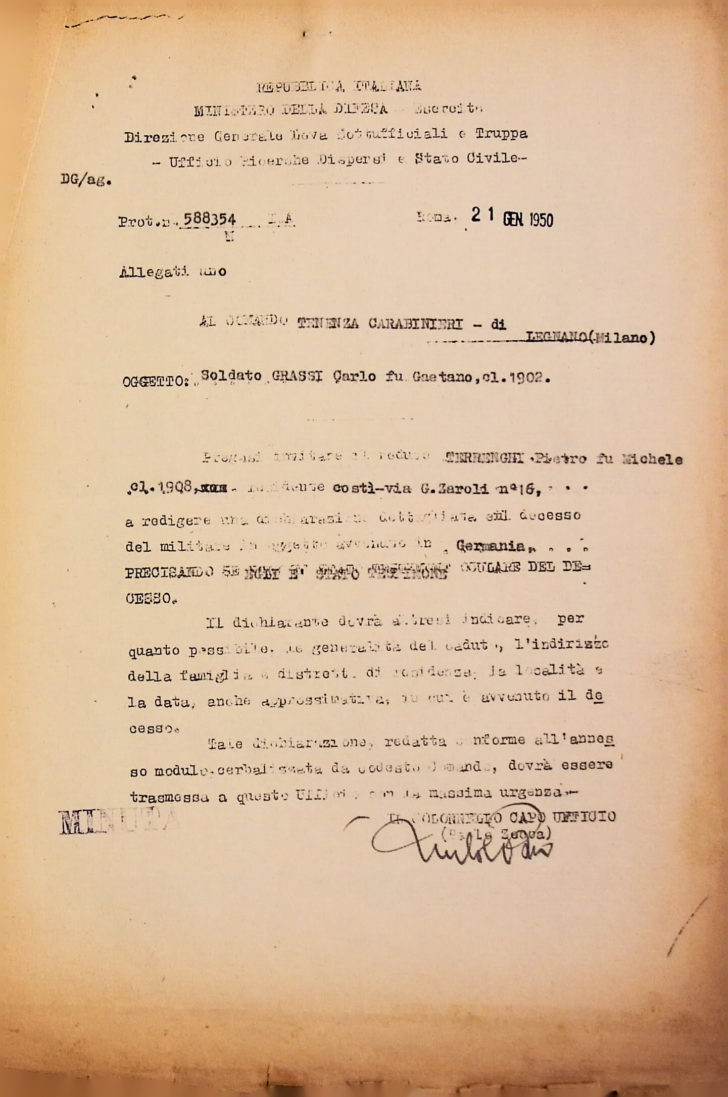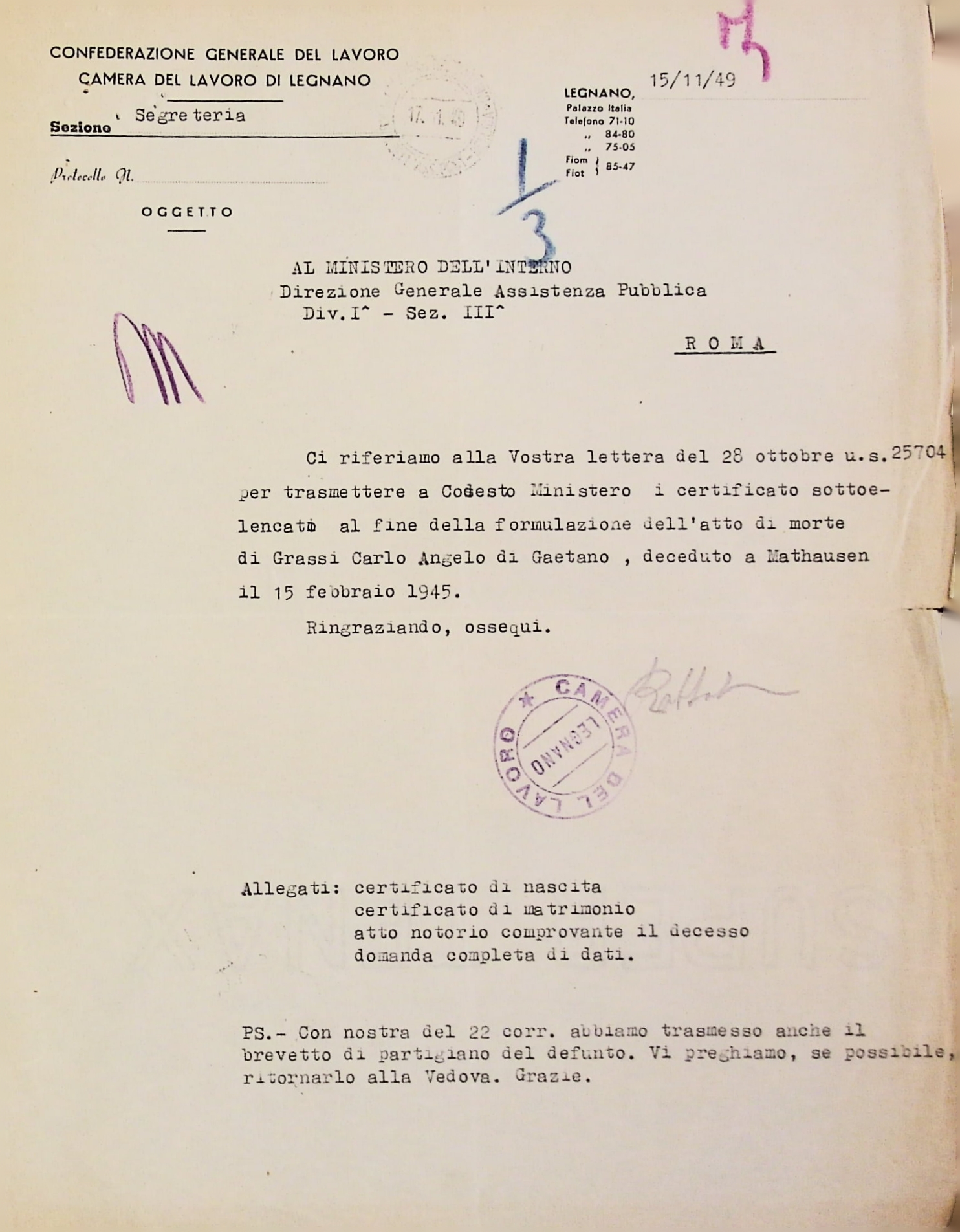 Deportato Carlo Grassi: fascicolo personale