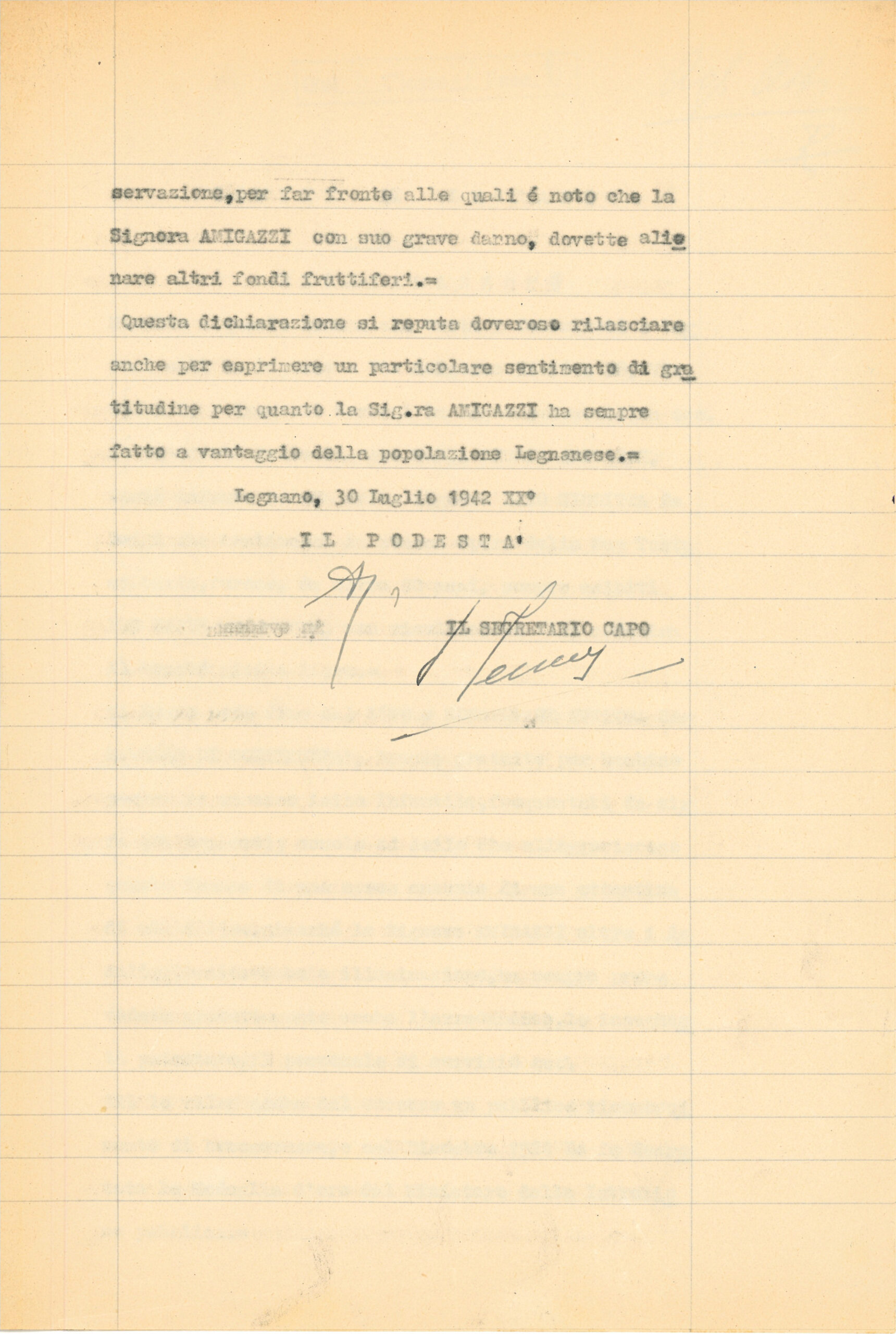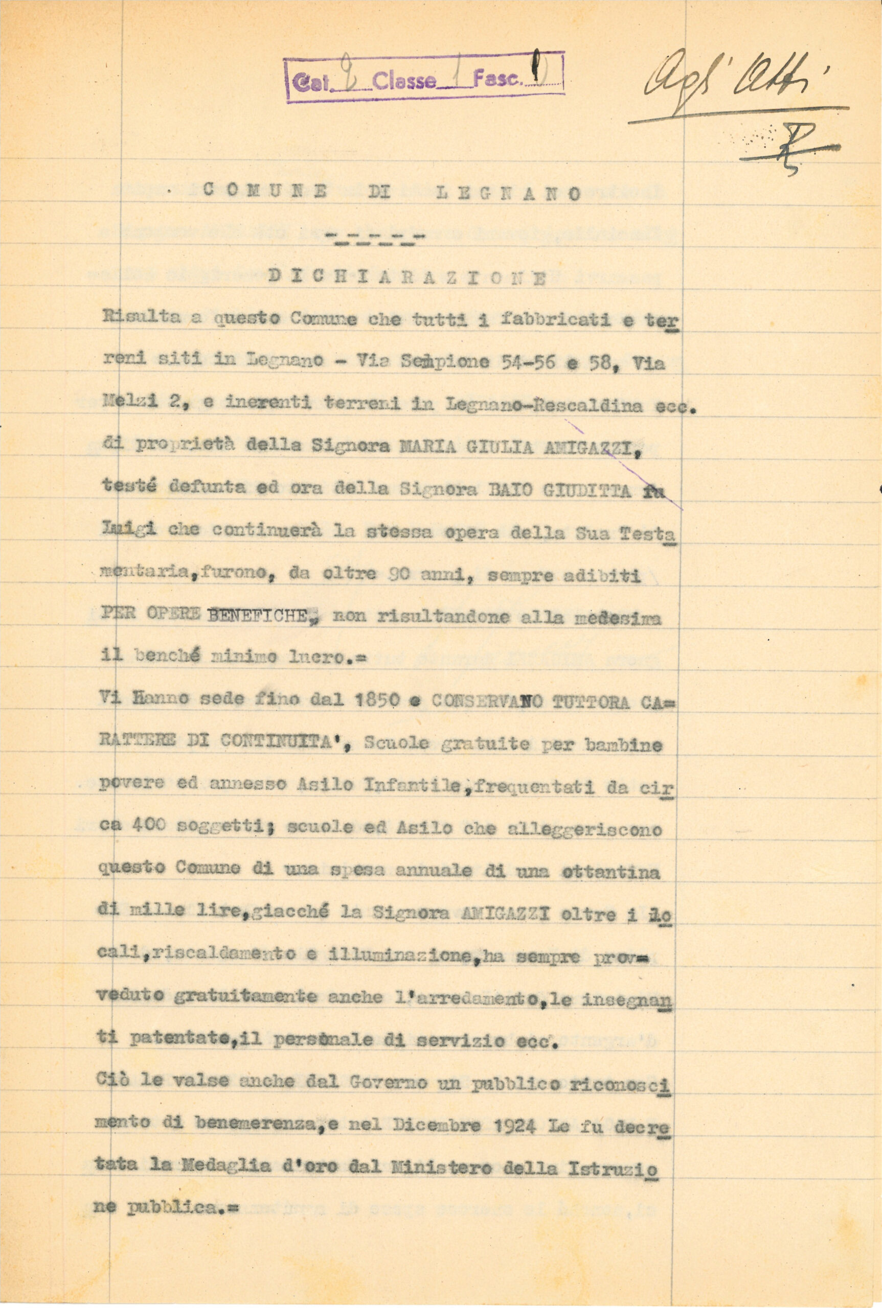 Dichiarazione sulla consistenza dei terreni e delle Opere Pie esistenti in Legnano della defunta Maria Giulia Amigazzi ed ora della signora Baio Giuditta