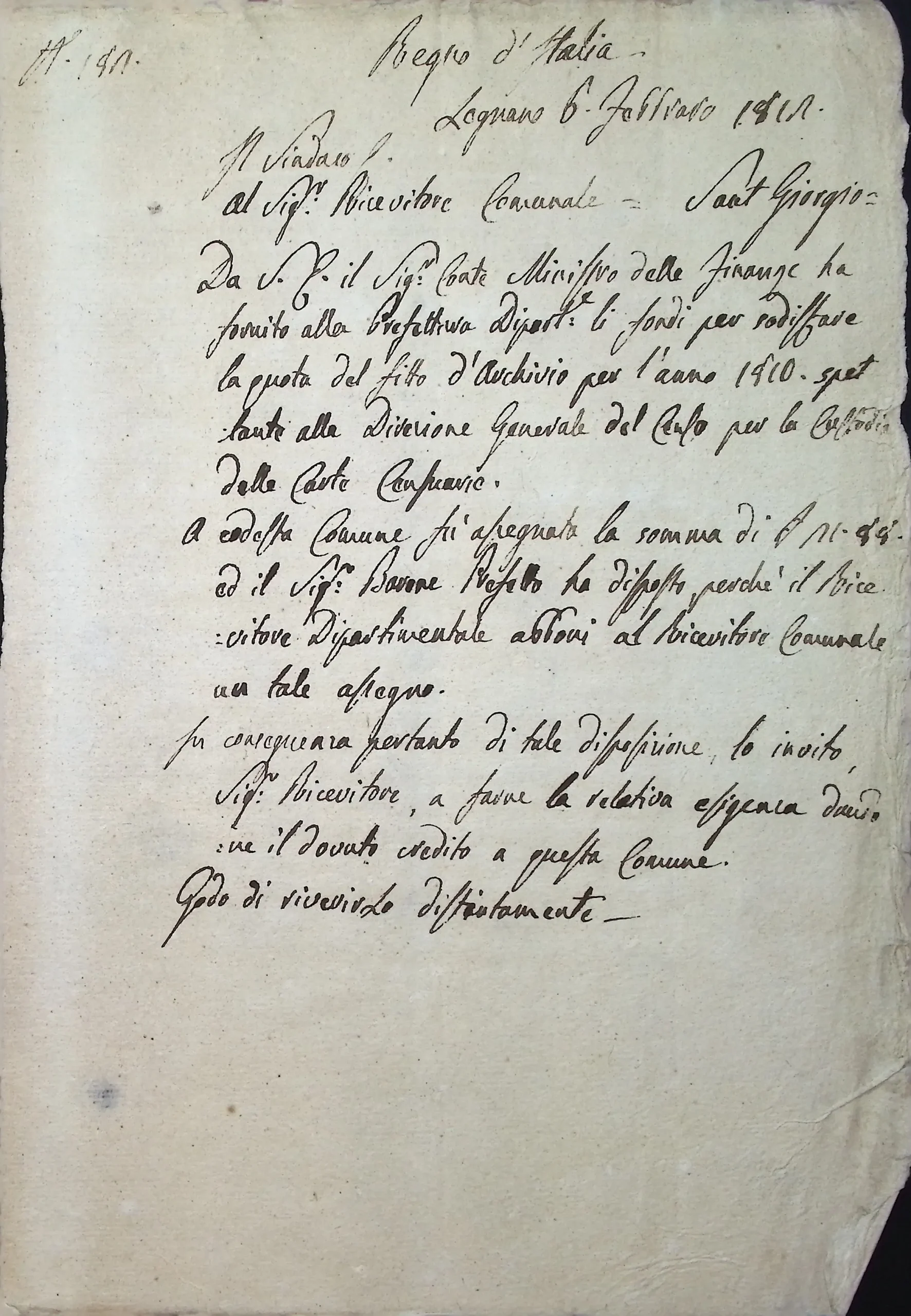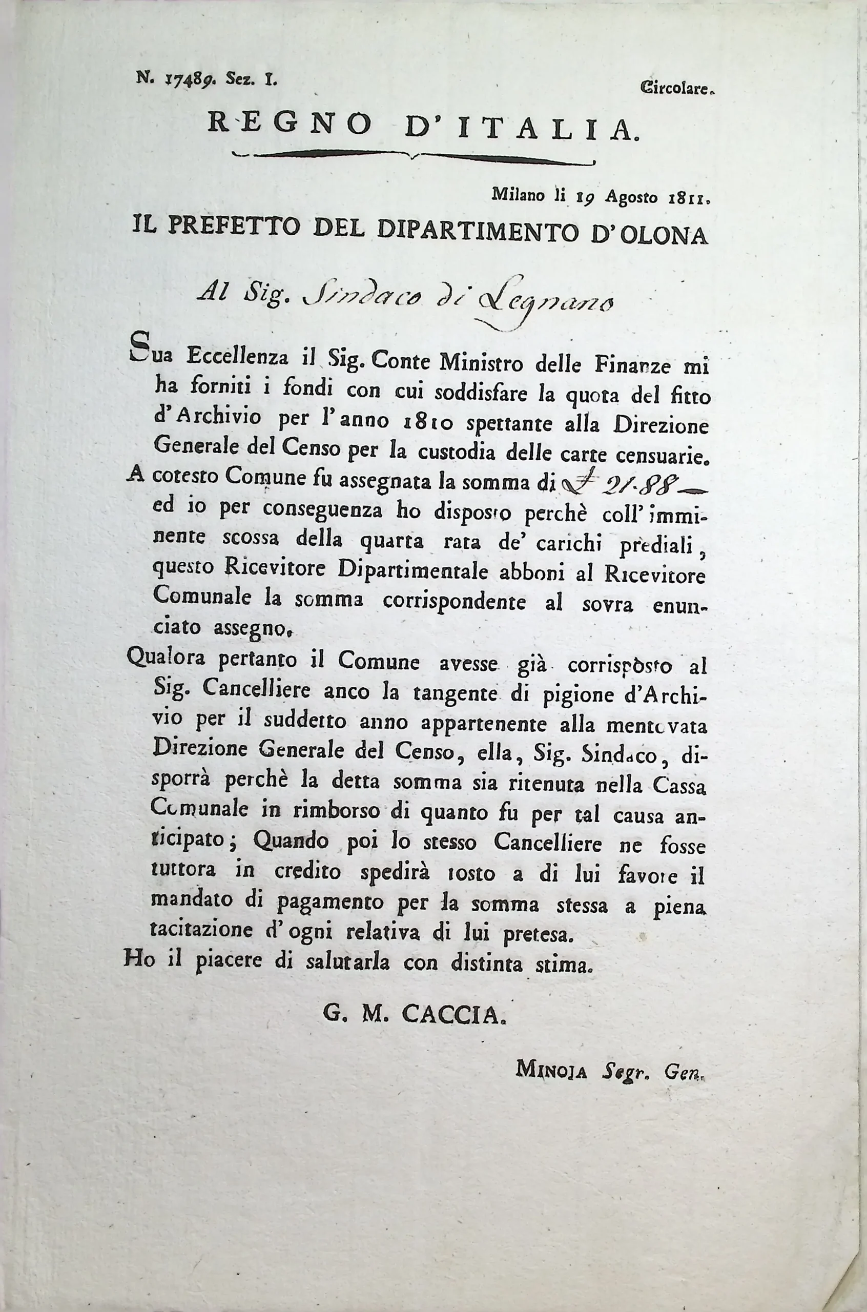 Disposizioni per il pagamento dell’affitto dei locali dell’archivio comunale da parte governativa per la custodia delle carte censuarie
