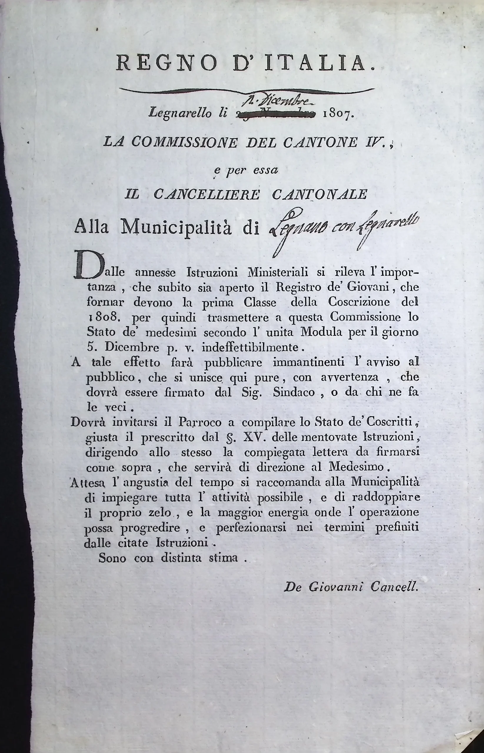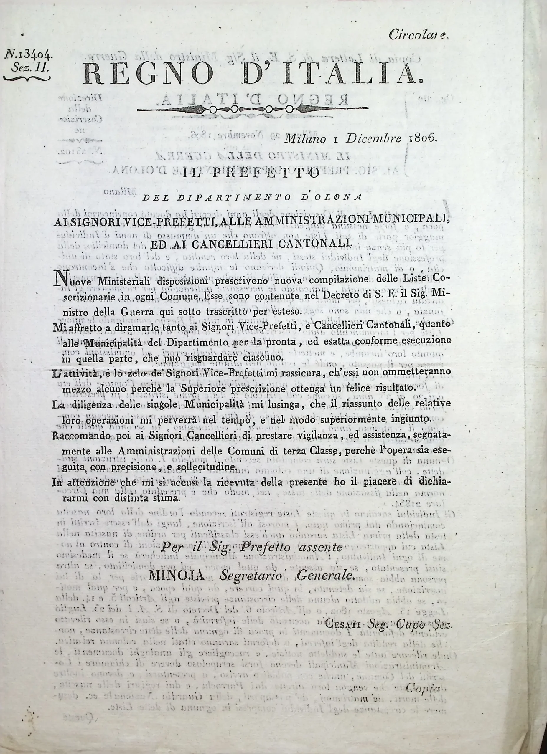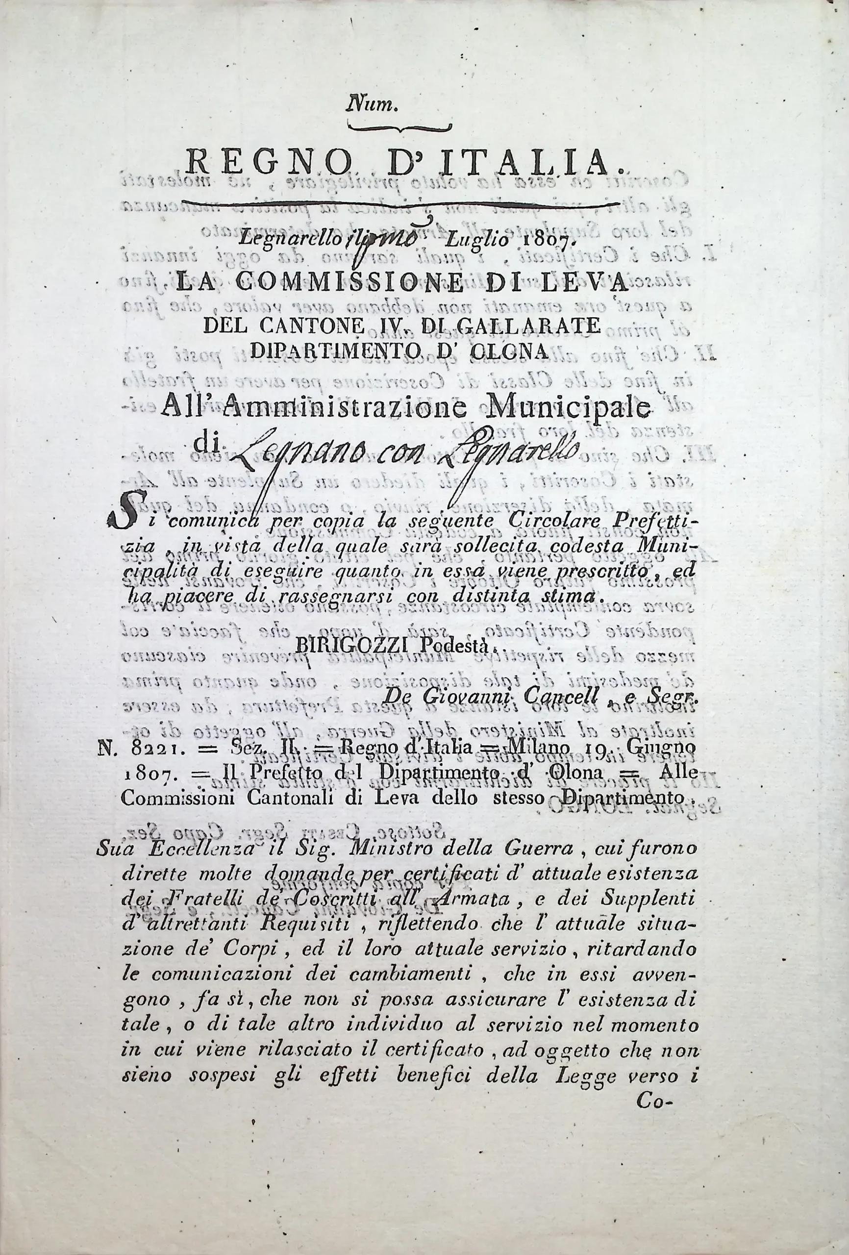 Disposizioni e circolari relative alla formazione delle liste di leva per l’anno 1808