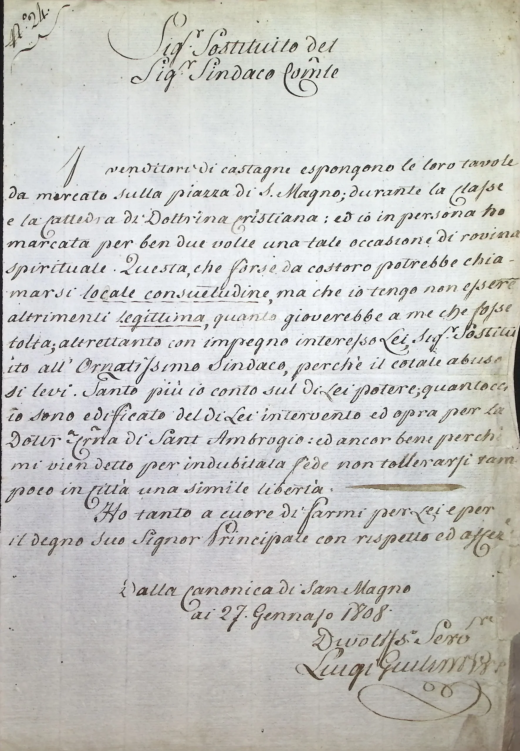 Esposto del parroco di S. Magno per ottenere il divieto di tenere banchi per la vendita delle castagne sulla piazza durante le lezioni di dottrina cristiana