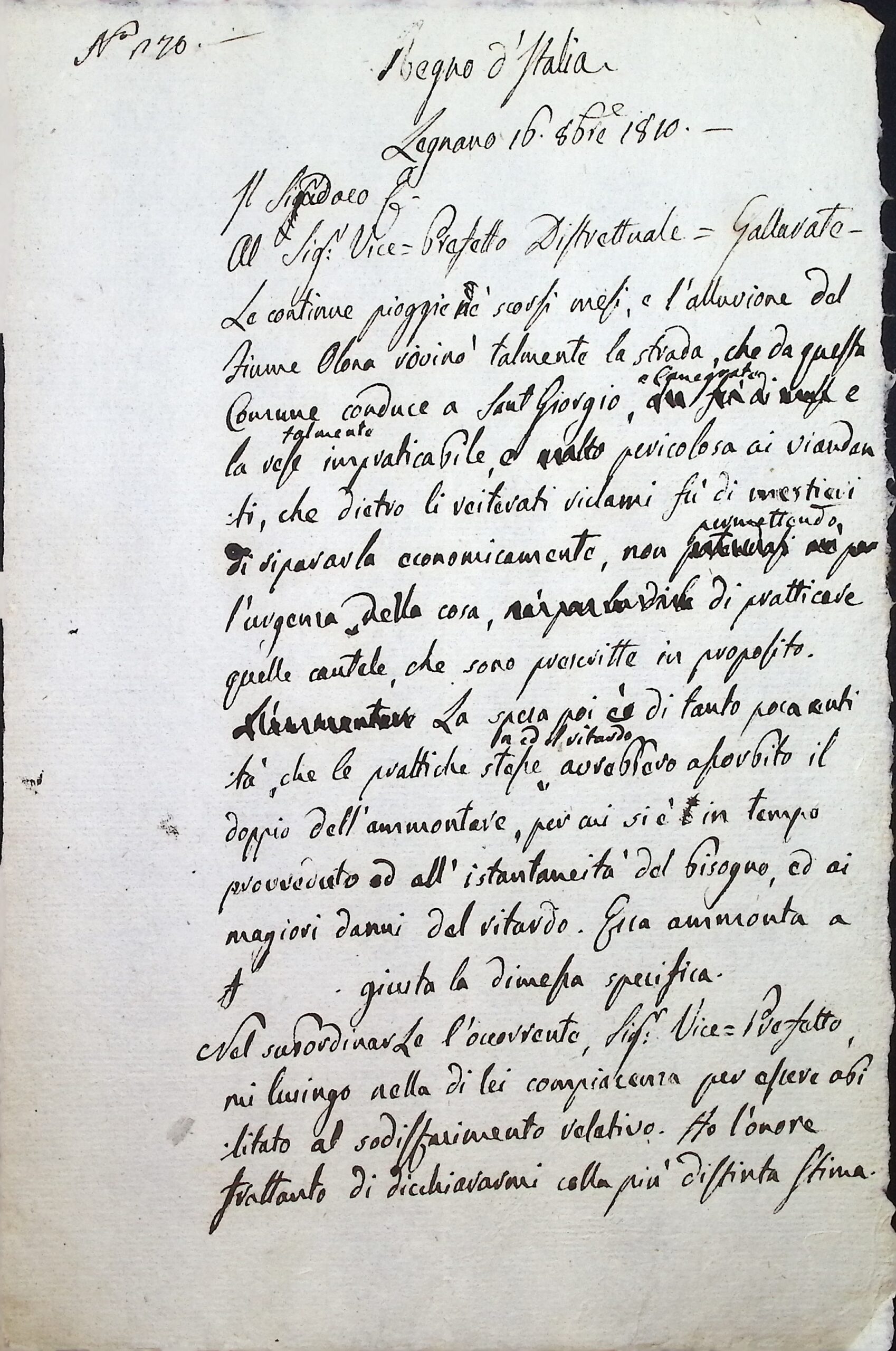 Richiesta alla Vice Prefettura di Gallarate per il rimborso delle spese d’urgenza per la riparazione della strada per S. Giorgio danneggiata dalla piena d’Olona