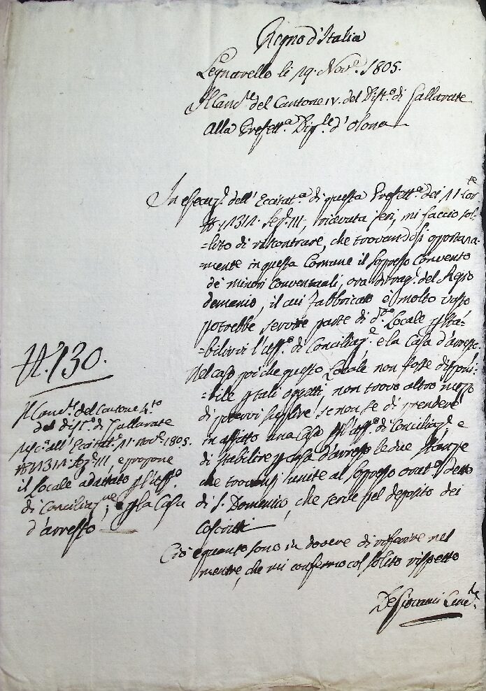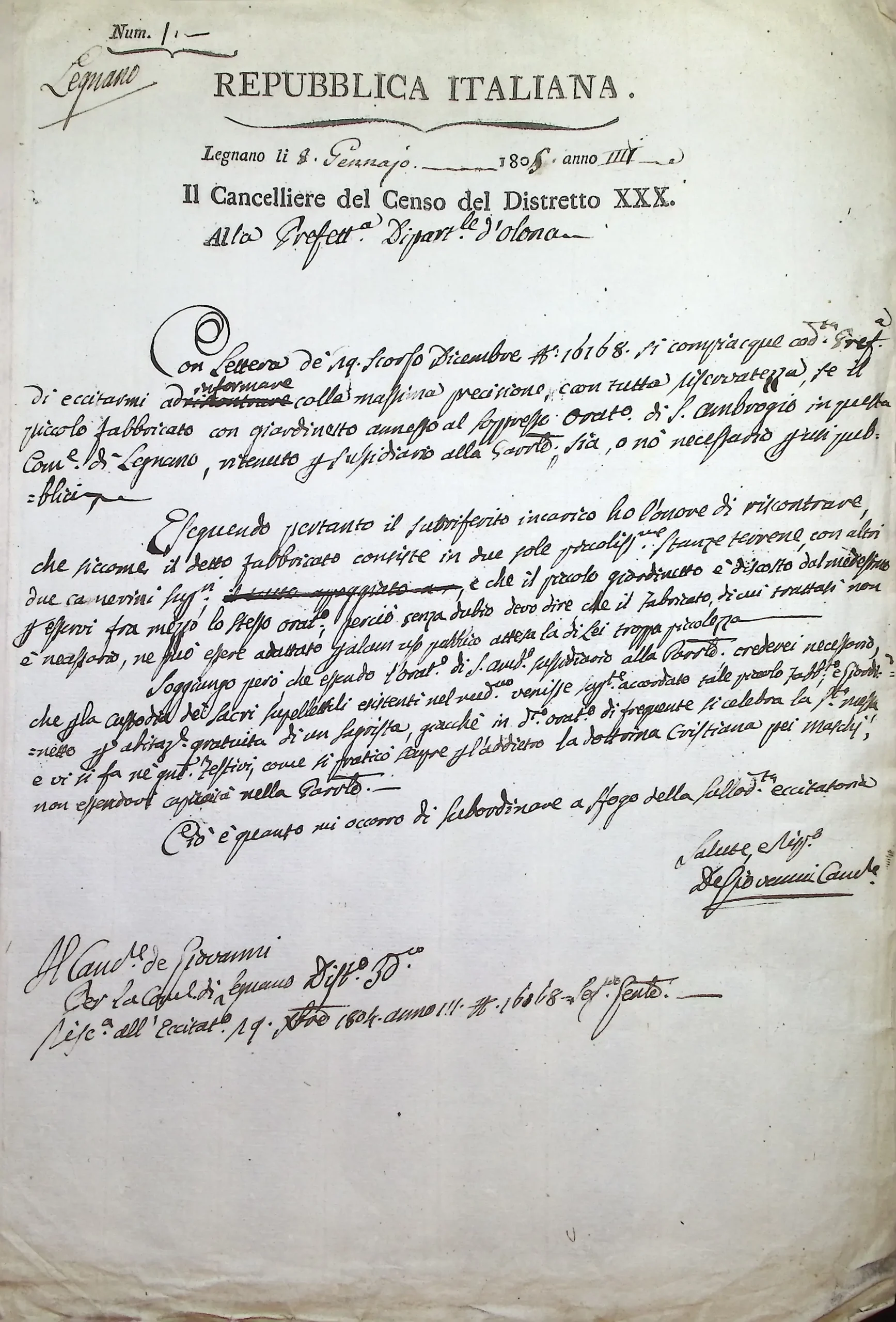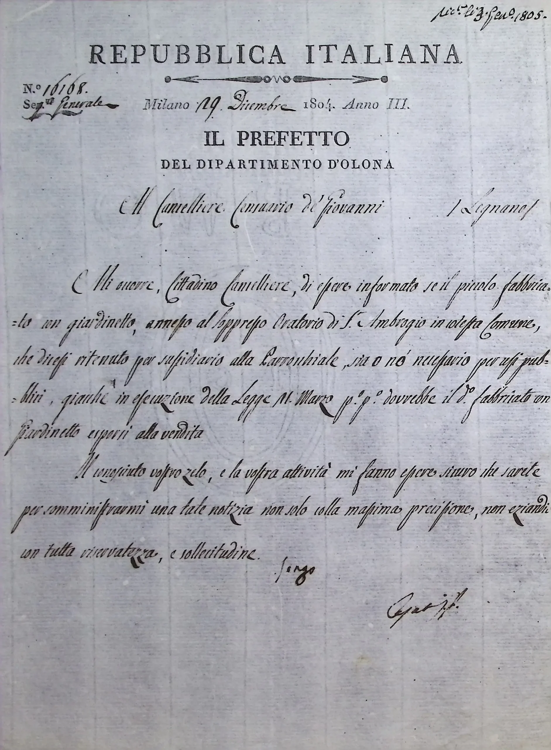 Informazioni riservate sulla possibilità di adibire ad usi pubblici il soppresso oratorio di S. Ambrogio di Legnano