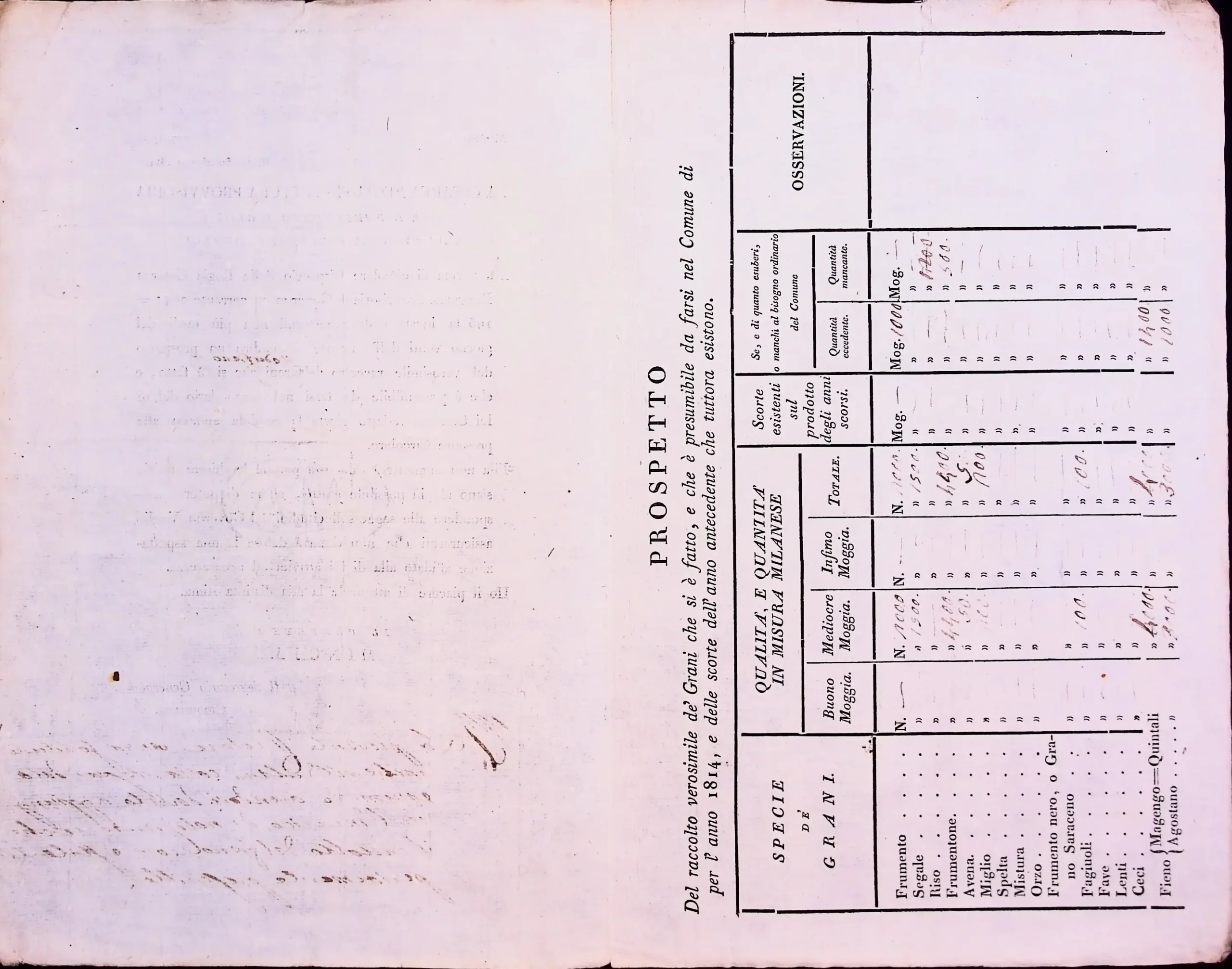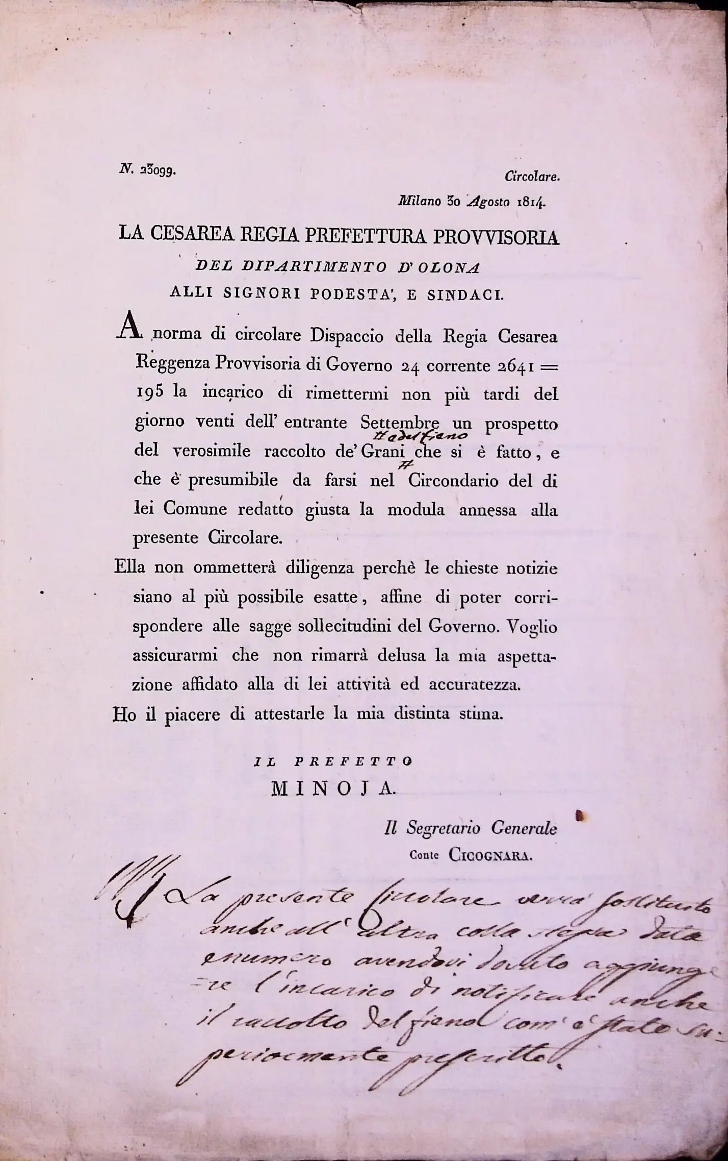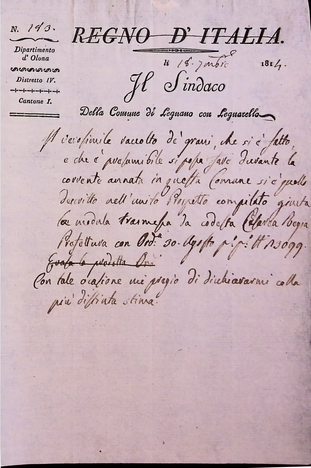 Informazioni sul raccolto del grano e del fieno in territorio di Legnano