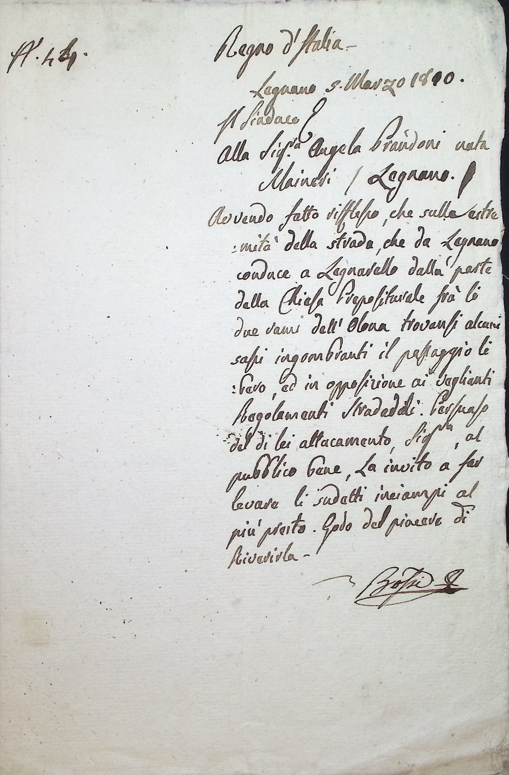 Intimazione del Sindaco alla sig.ra Angela Prandoni nata Maineri per sgomberare terriccio e sassi dalla strada portante da Legnano a Legnarello