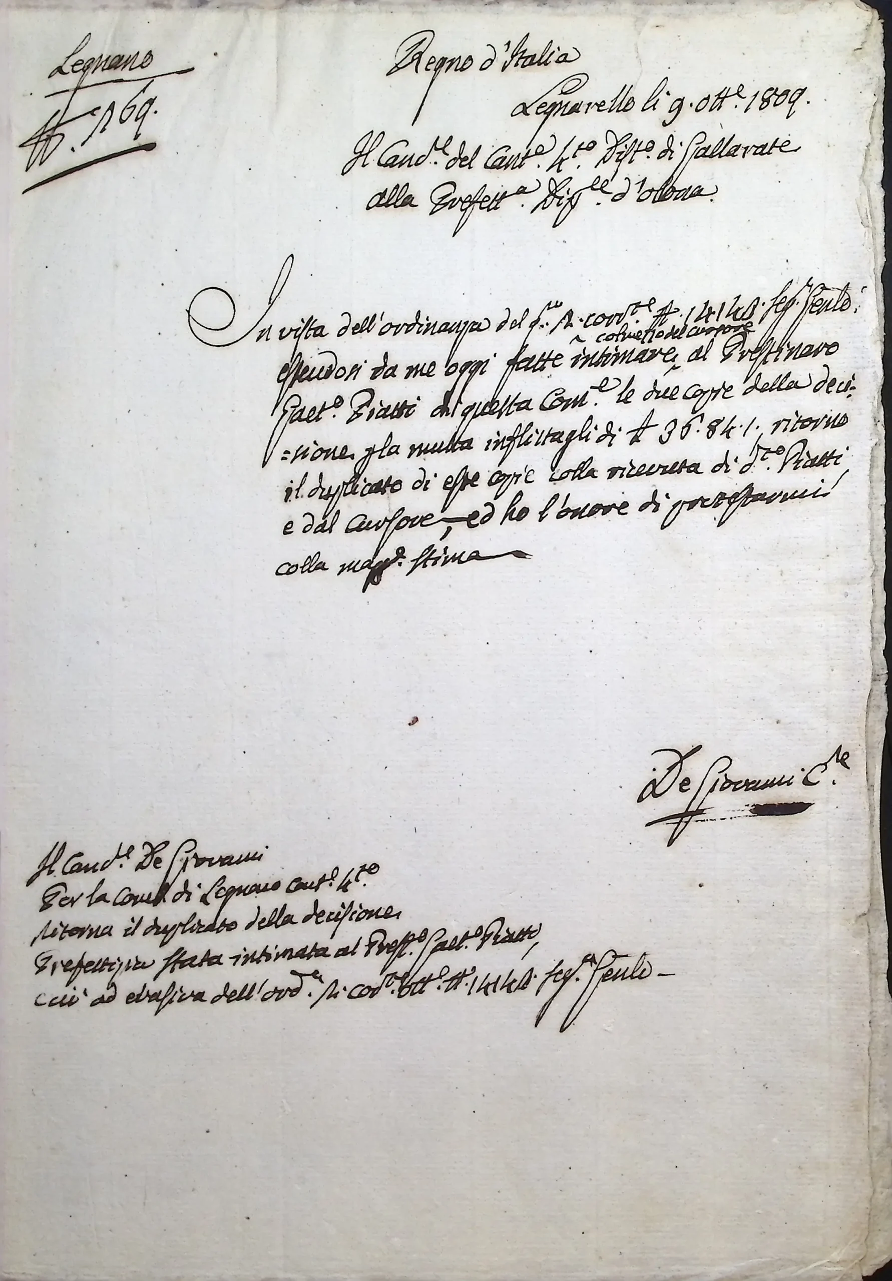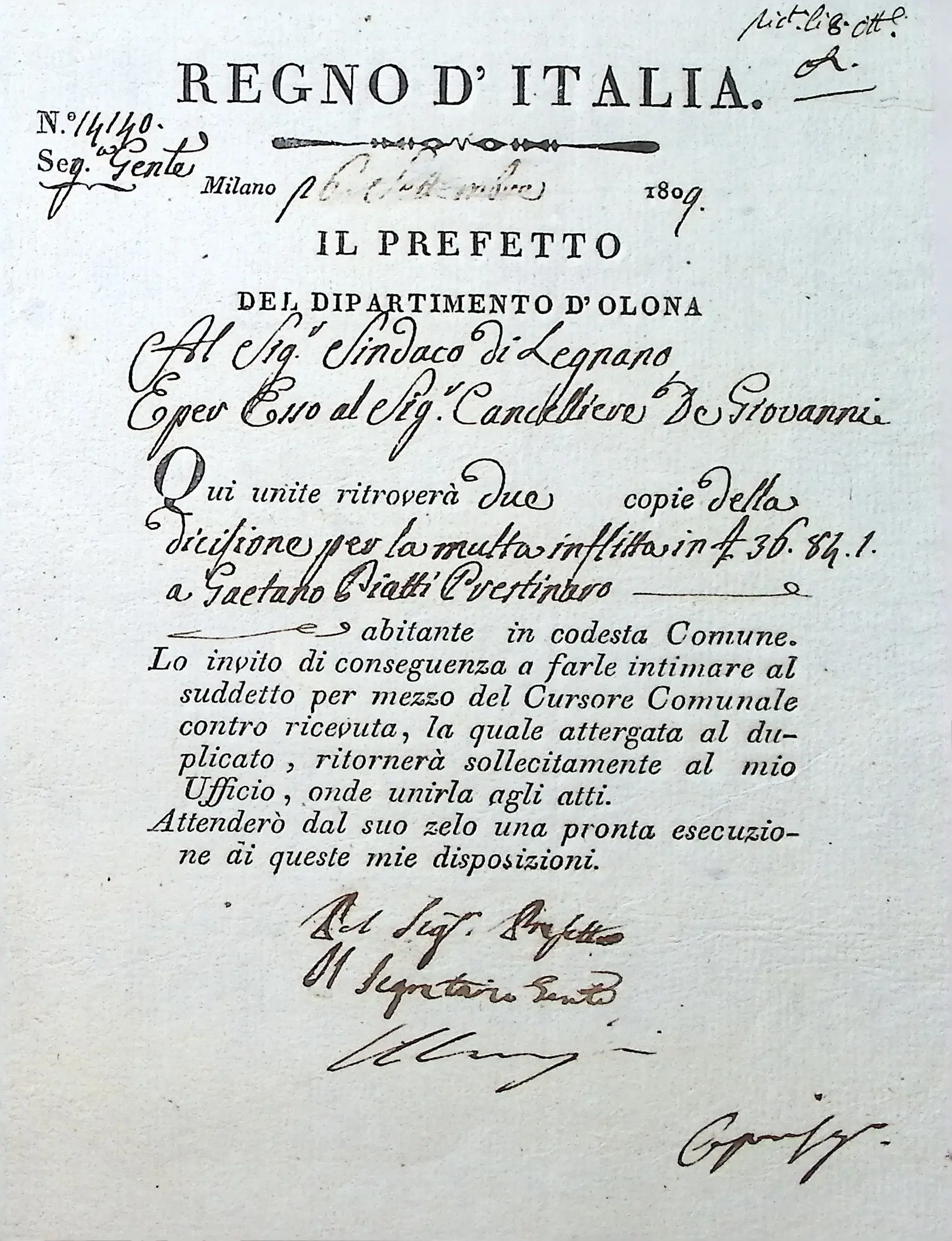 Notificazione da parte del Cancelliere Distrettuale di una multa inflitta dalla Prefettura a carico degli eredi di Giovanni Piatti, prestinaio