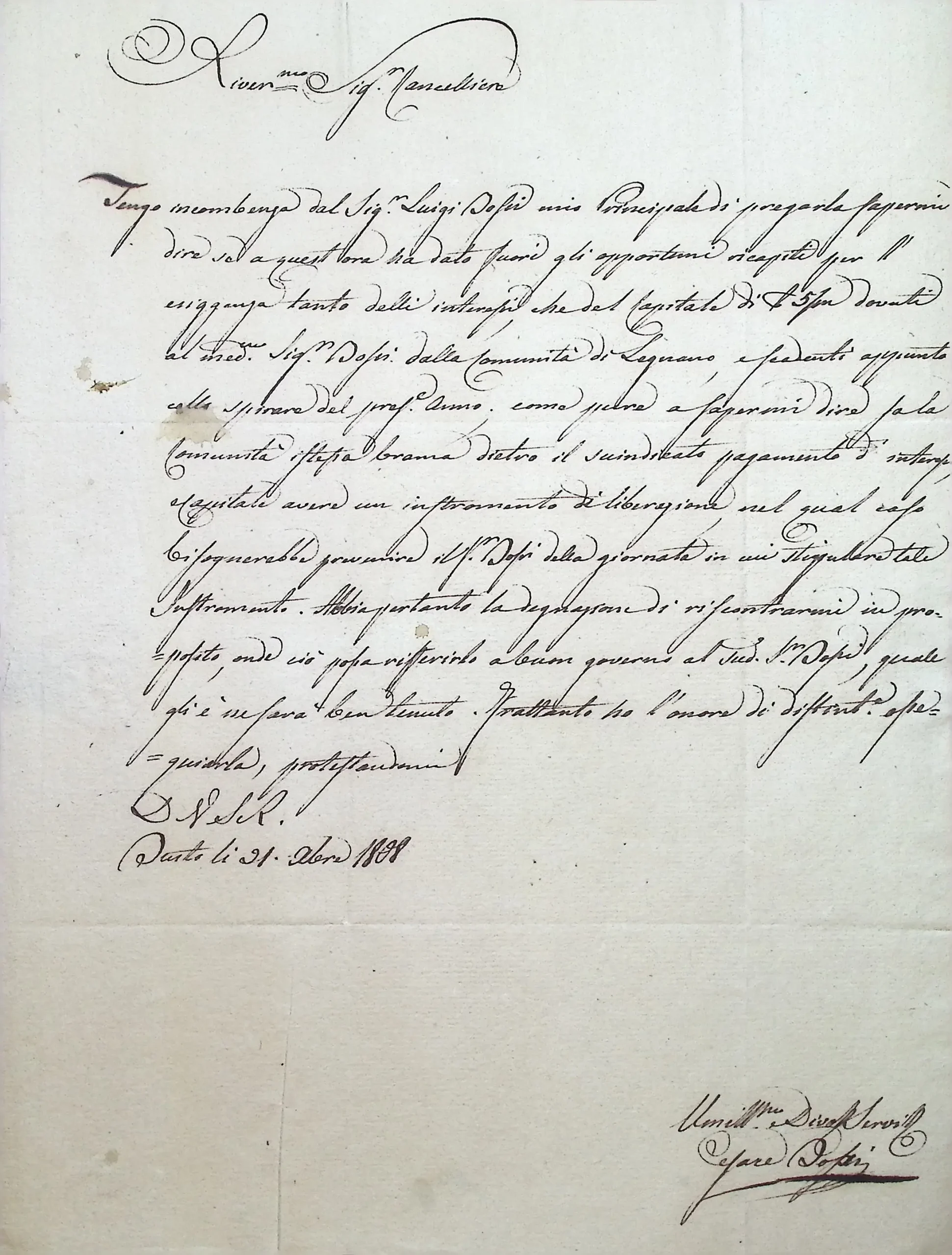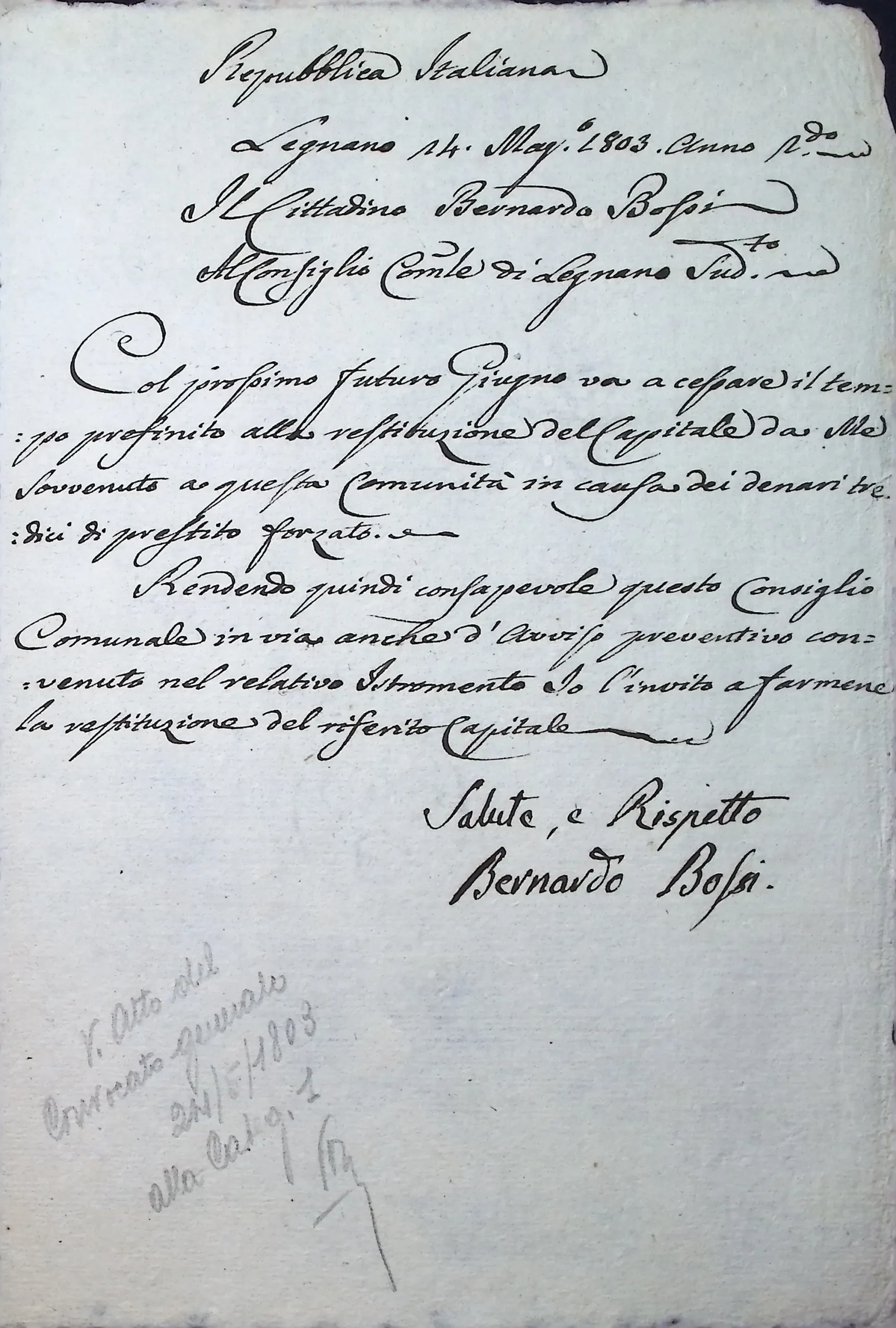 | Note dell'archivista | Descrizione precedente: "Carteggio relativo al debito del Comune verso Bernardo Bossi". In realtà di tratta di due debitori distinti. |