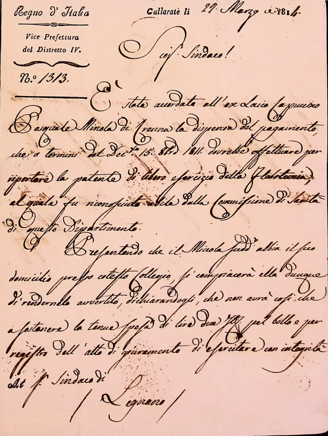 Nota della Vice Prefettura riguardante la patente di flebotomo all’ex laico cappuccino Pasquale Miscola da Crenna, domiciliato in Legnano