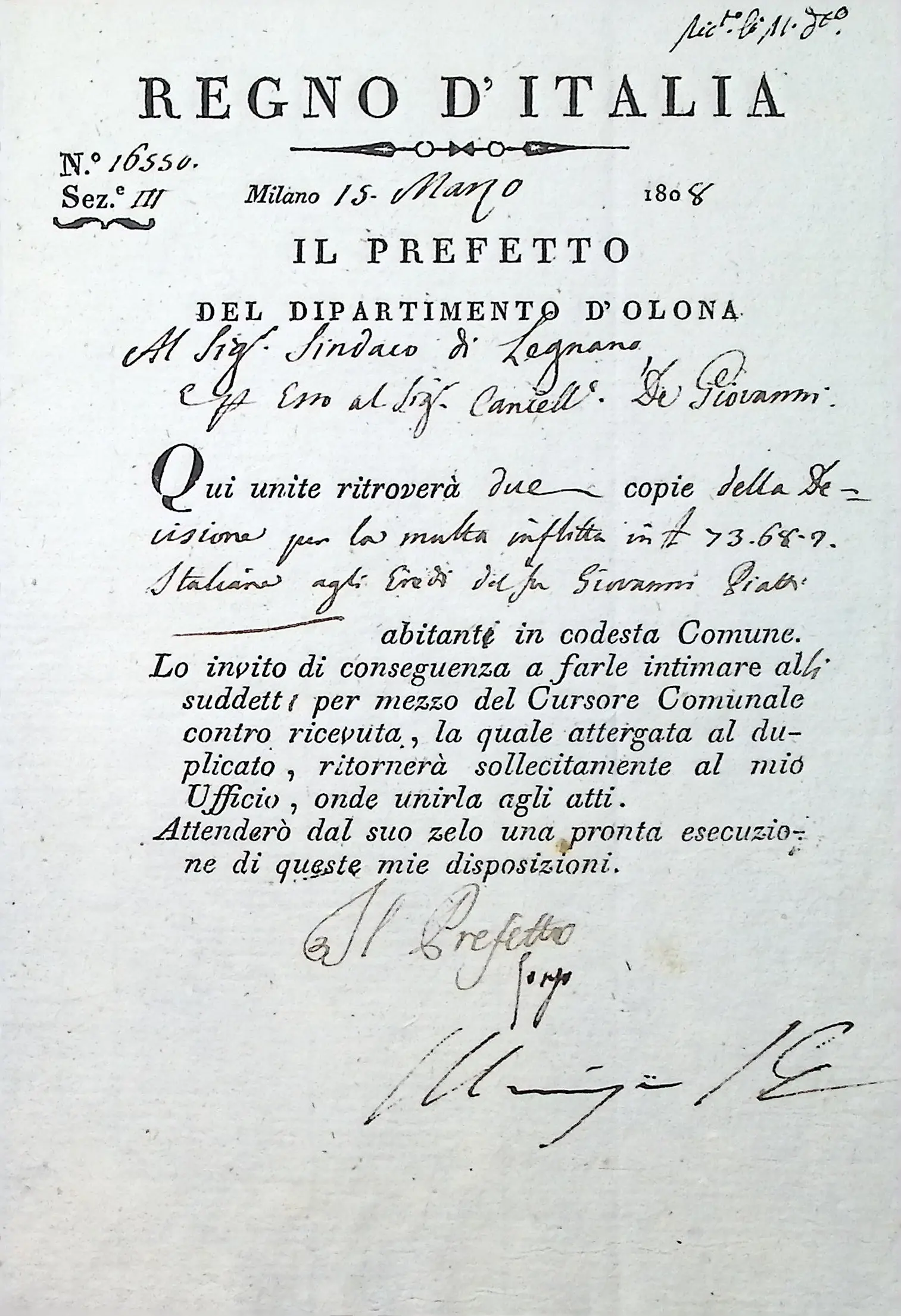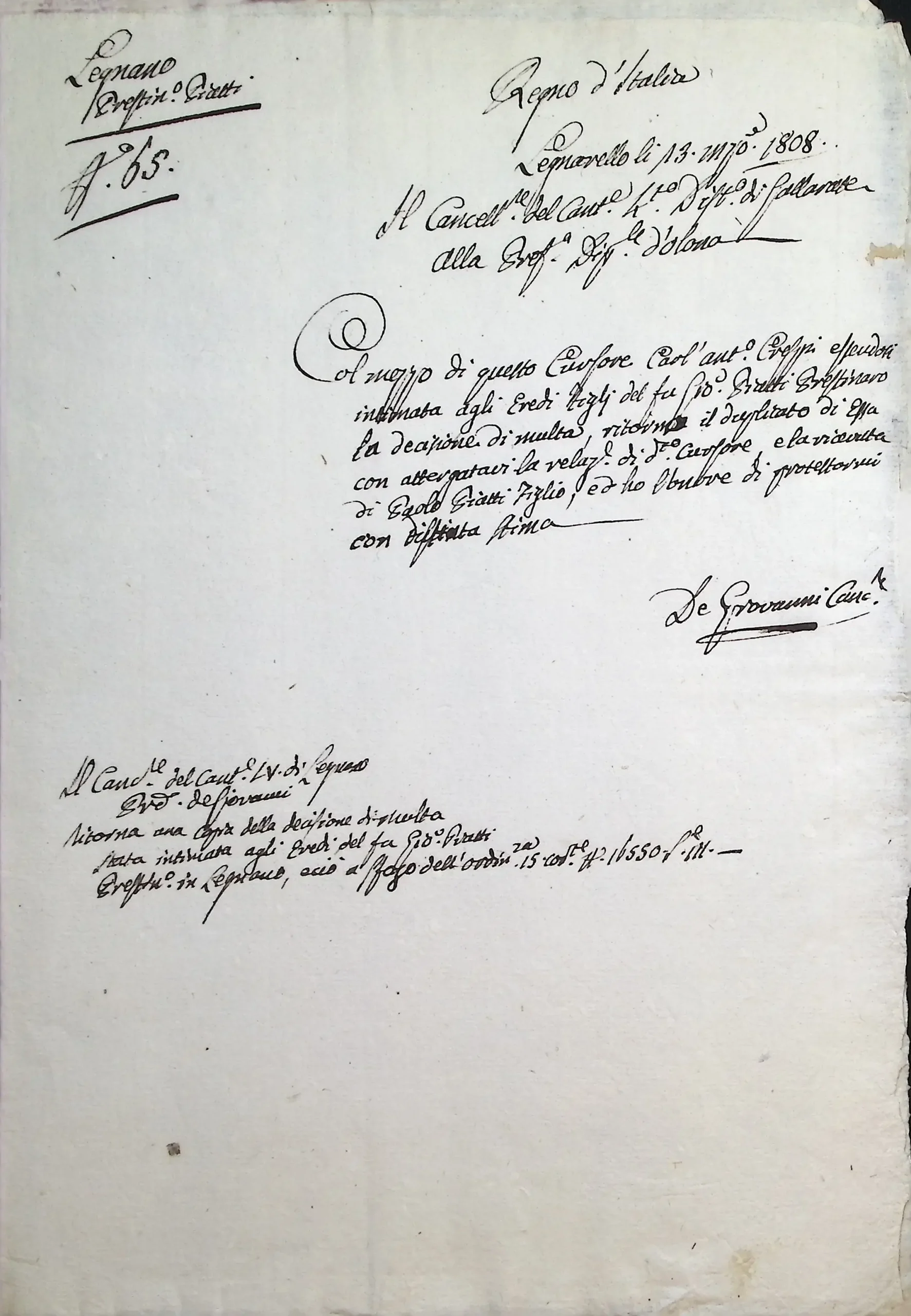 Notificazione da parte del Cancelliere Distrettuale di una multa inflitta dalla Prefettura a carico degli eredi di Giovanni Piatti, prestinaio