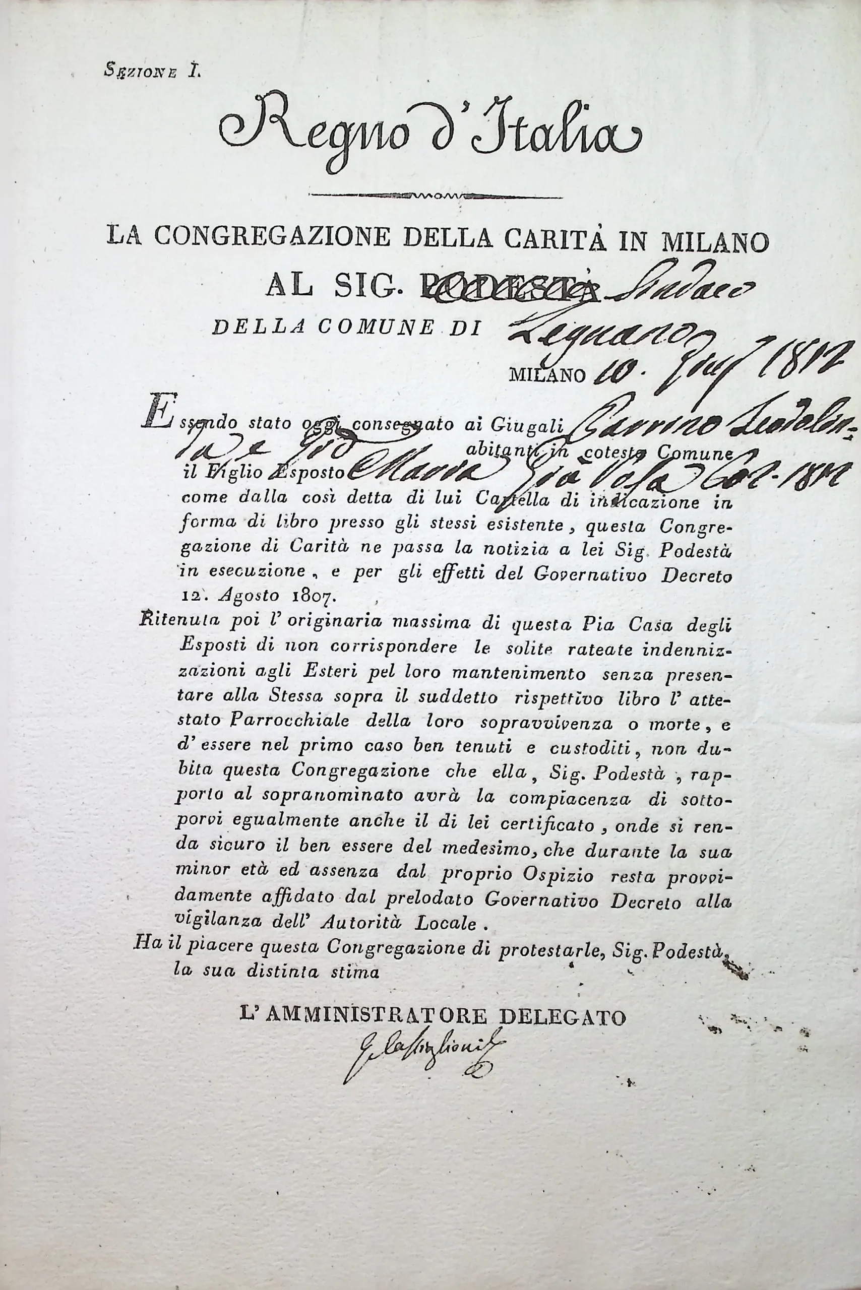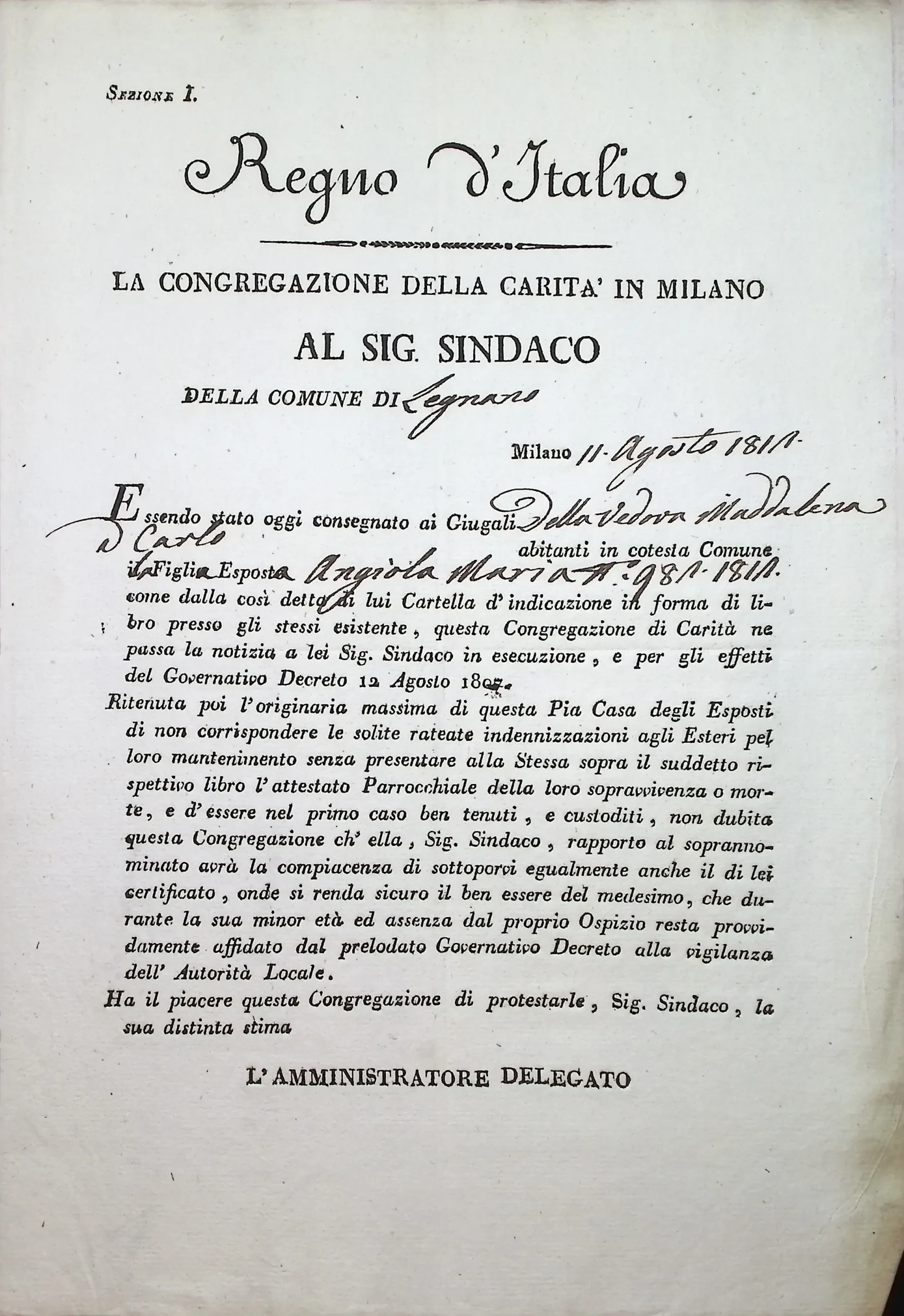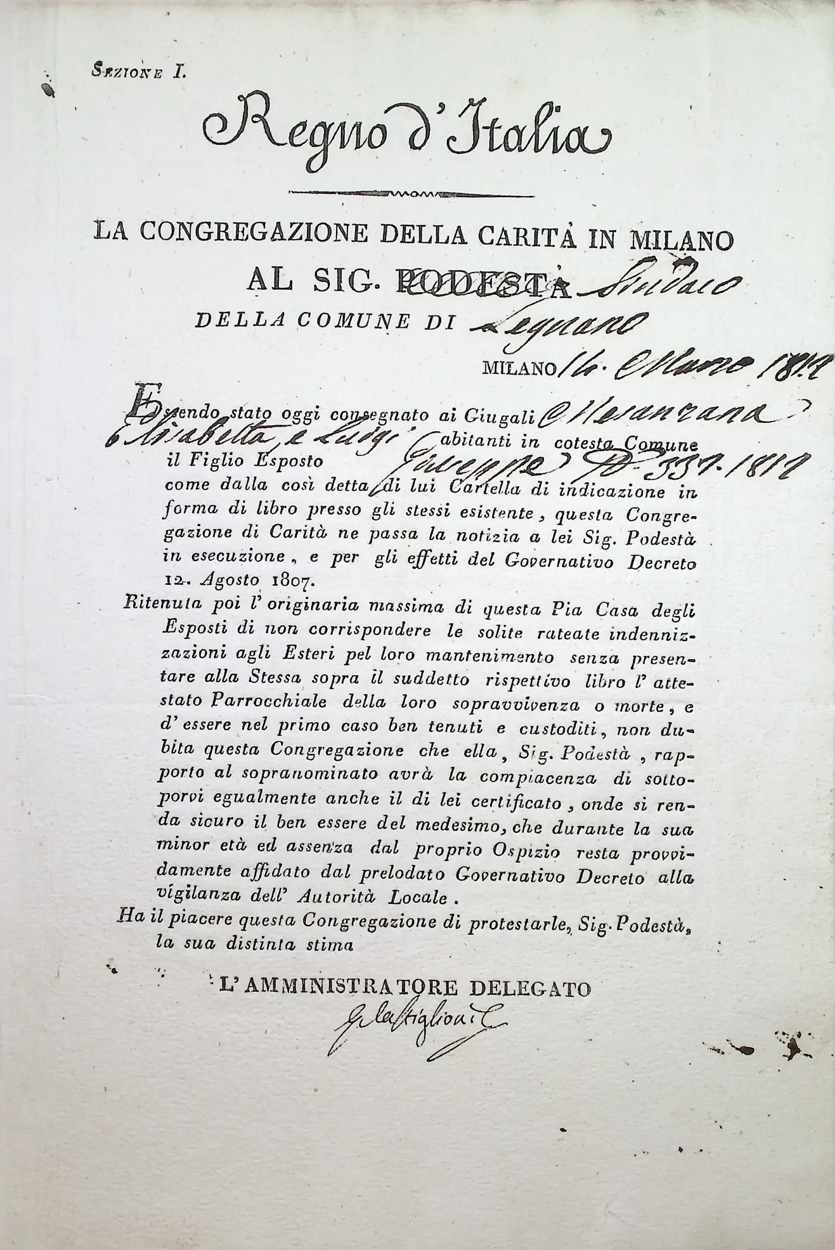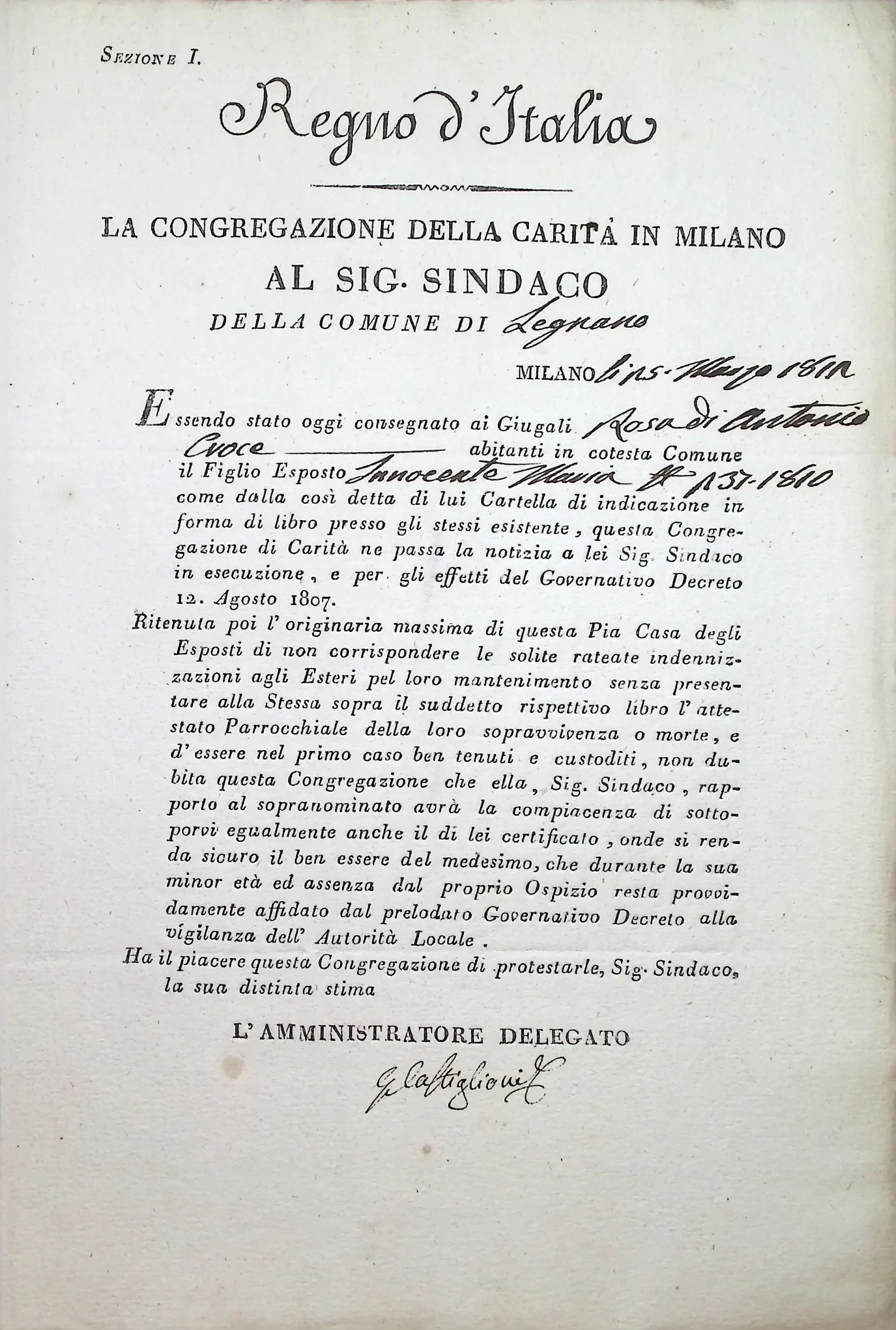 Notificazioni della Congregazione di Carità di Milano al Sindaco relative alla consegna di bambini esposti a coppie di coniugi abitanti in Legnano