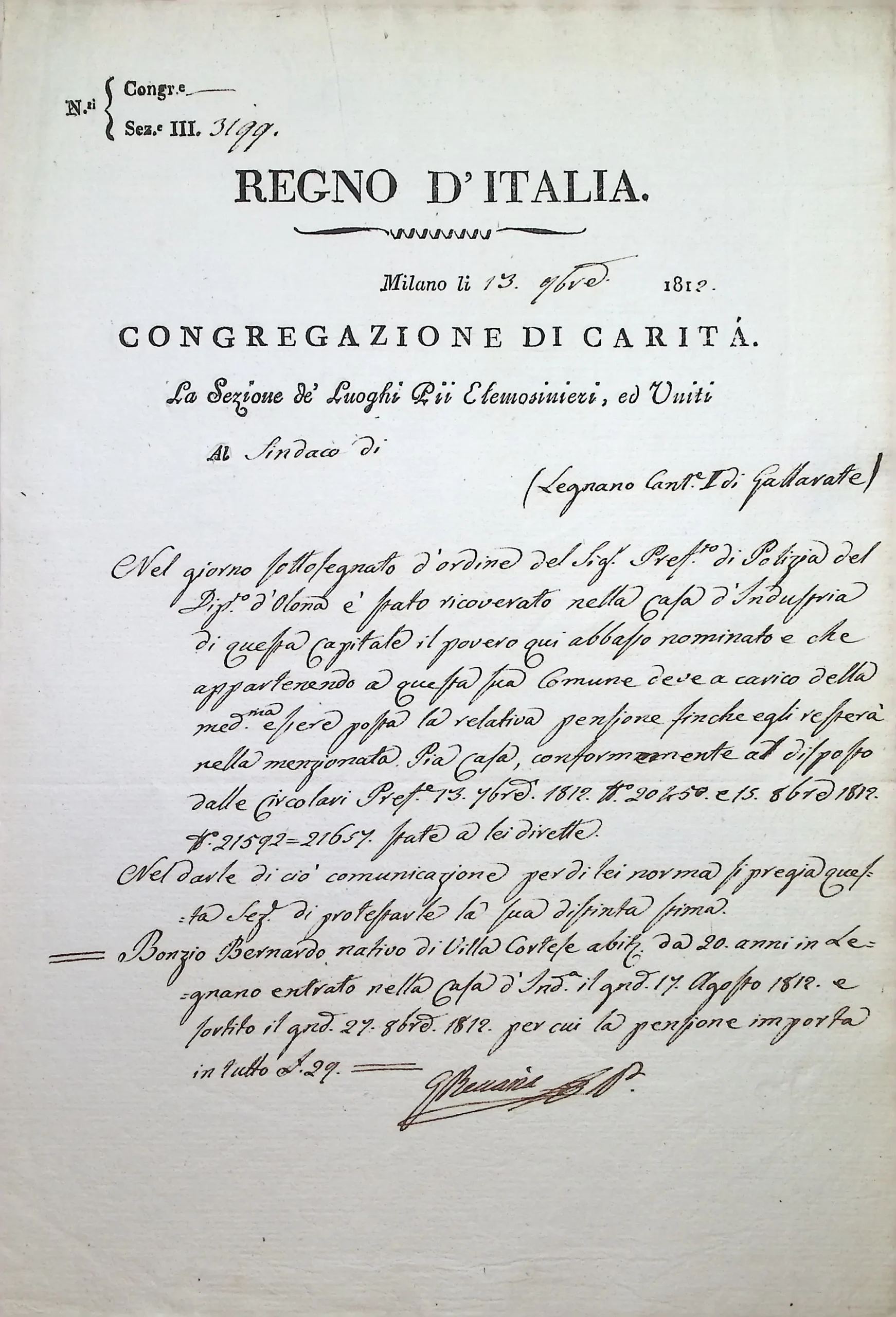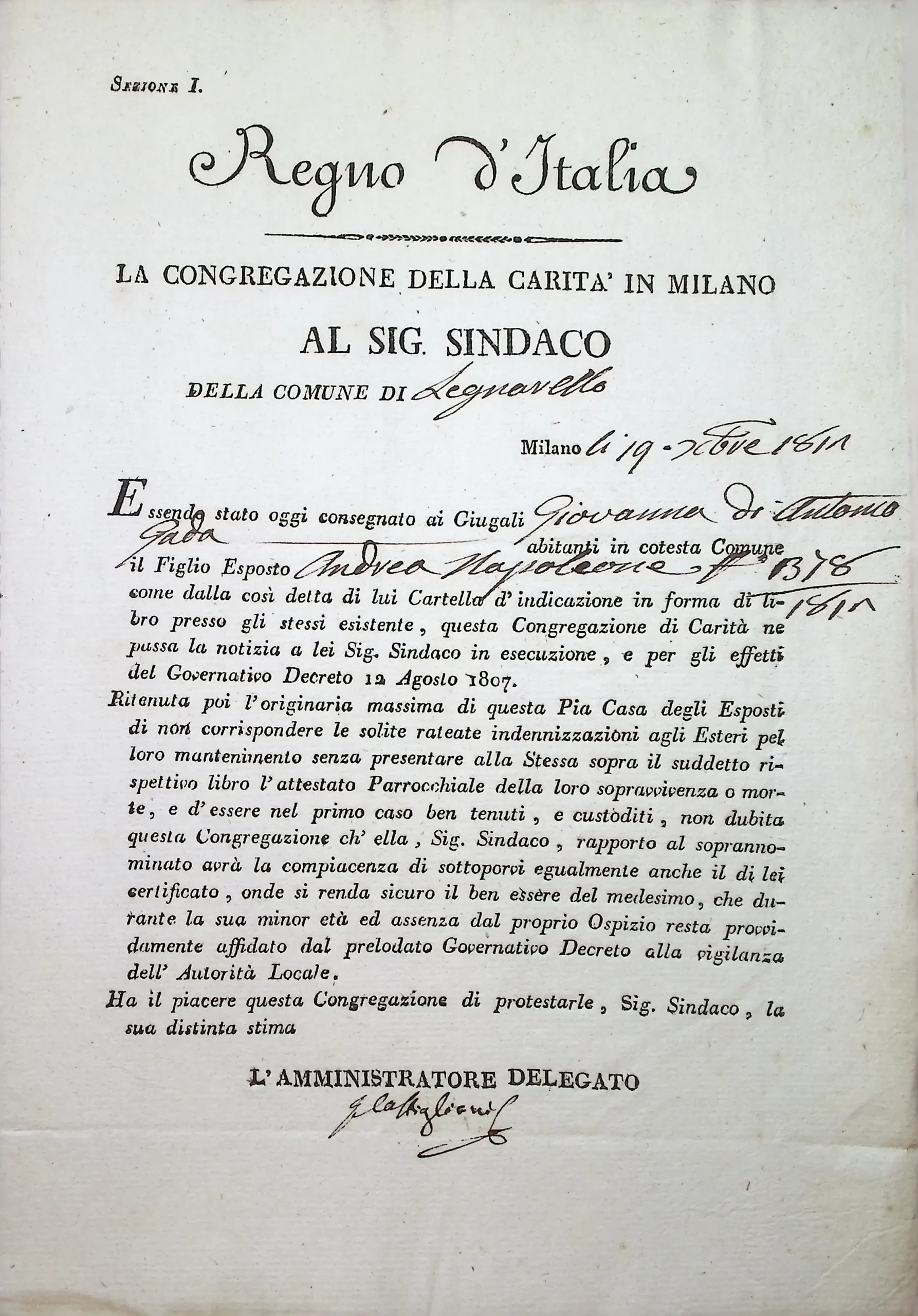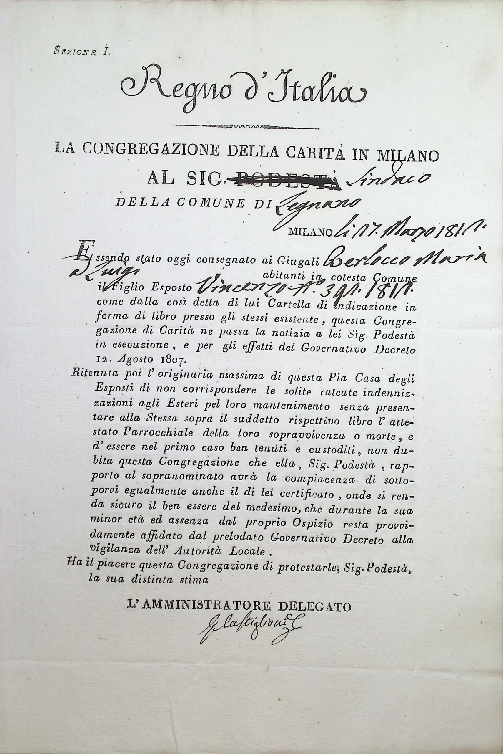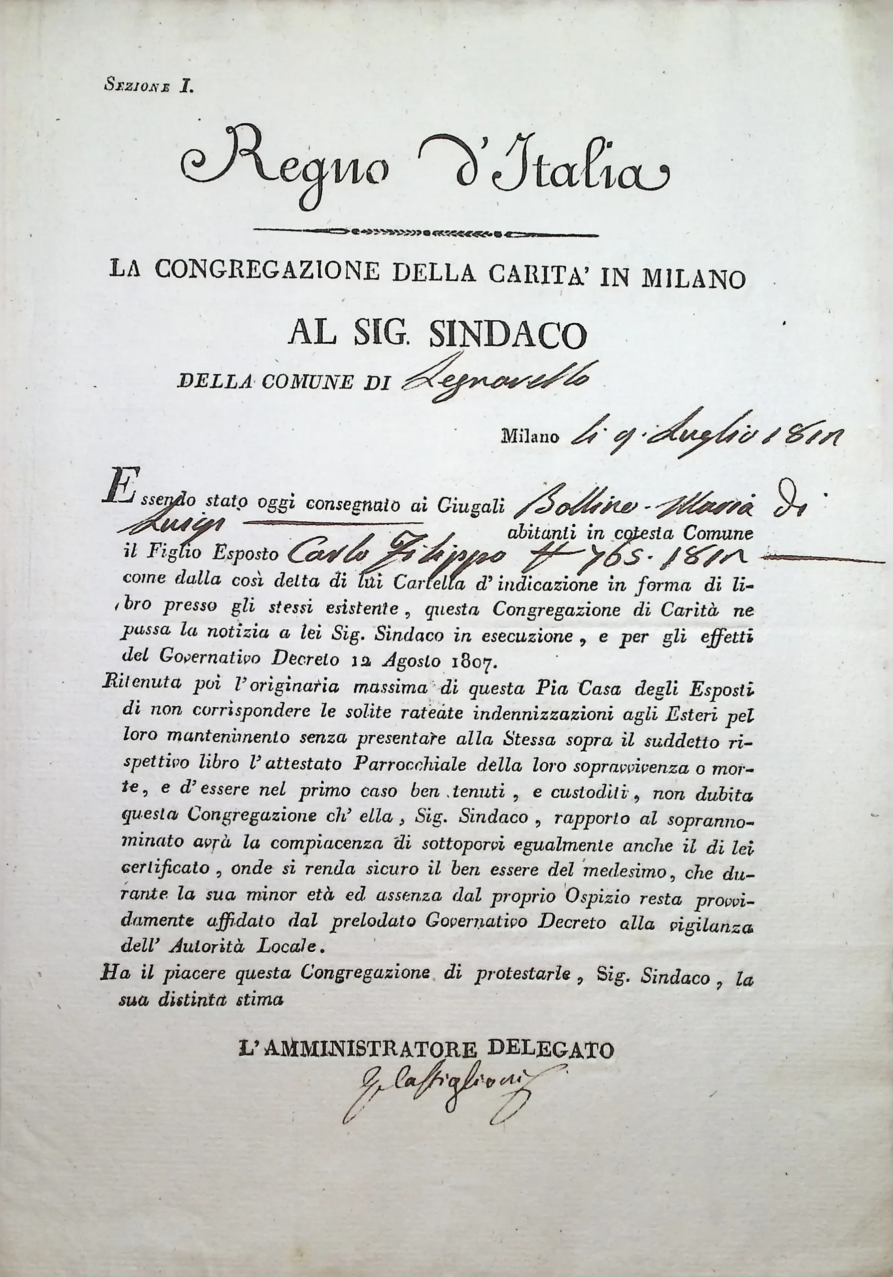 Notificazioni della Congregazione di Carità di Milano al Sindaco relative alla consegna di bambini esposti a coppie di coniugi abitanti in Legnano