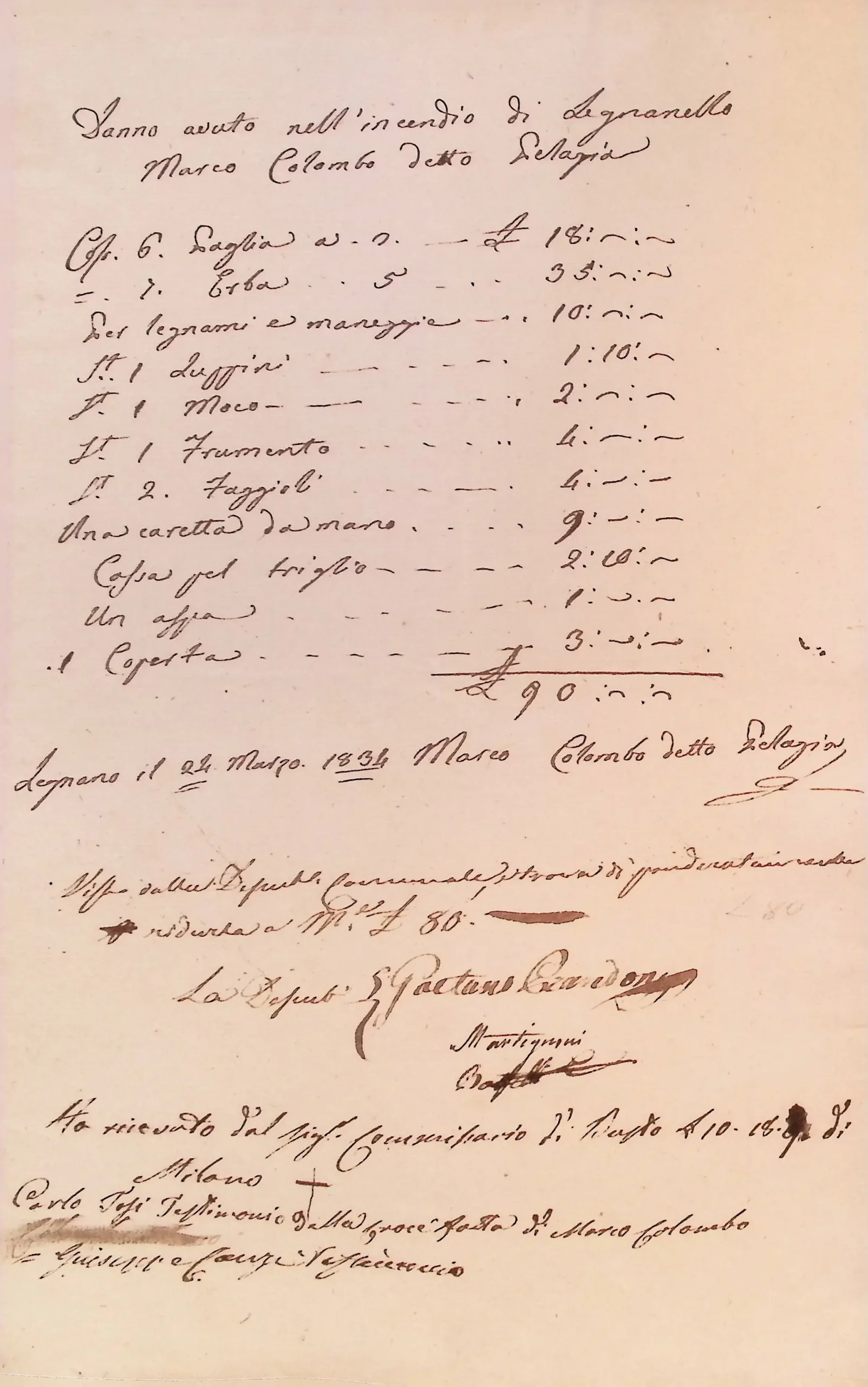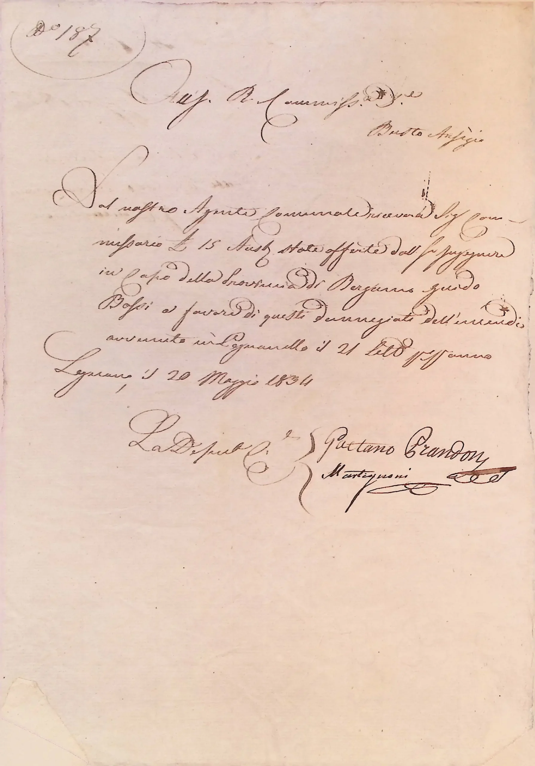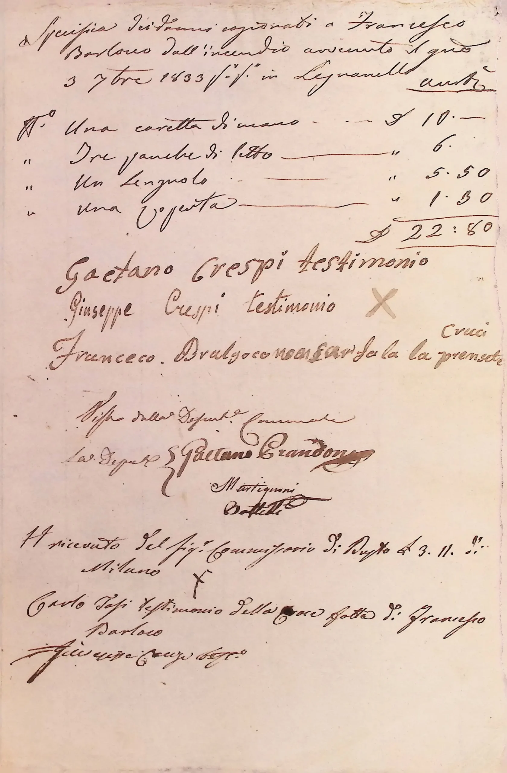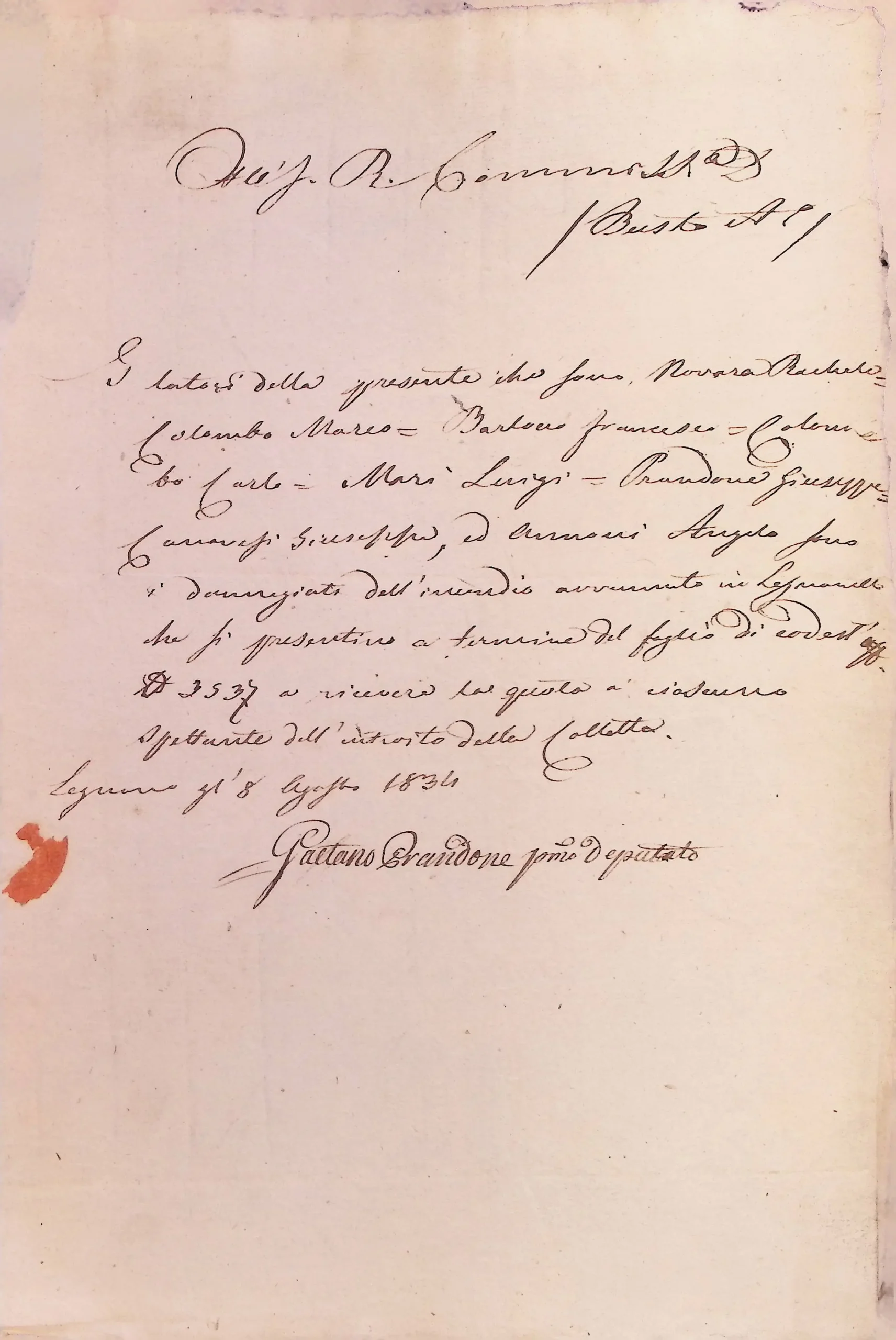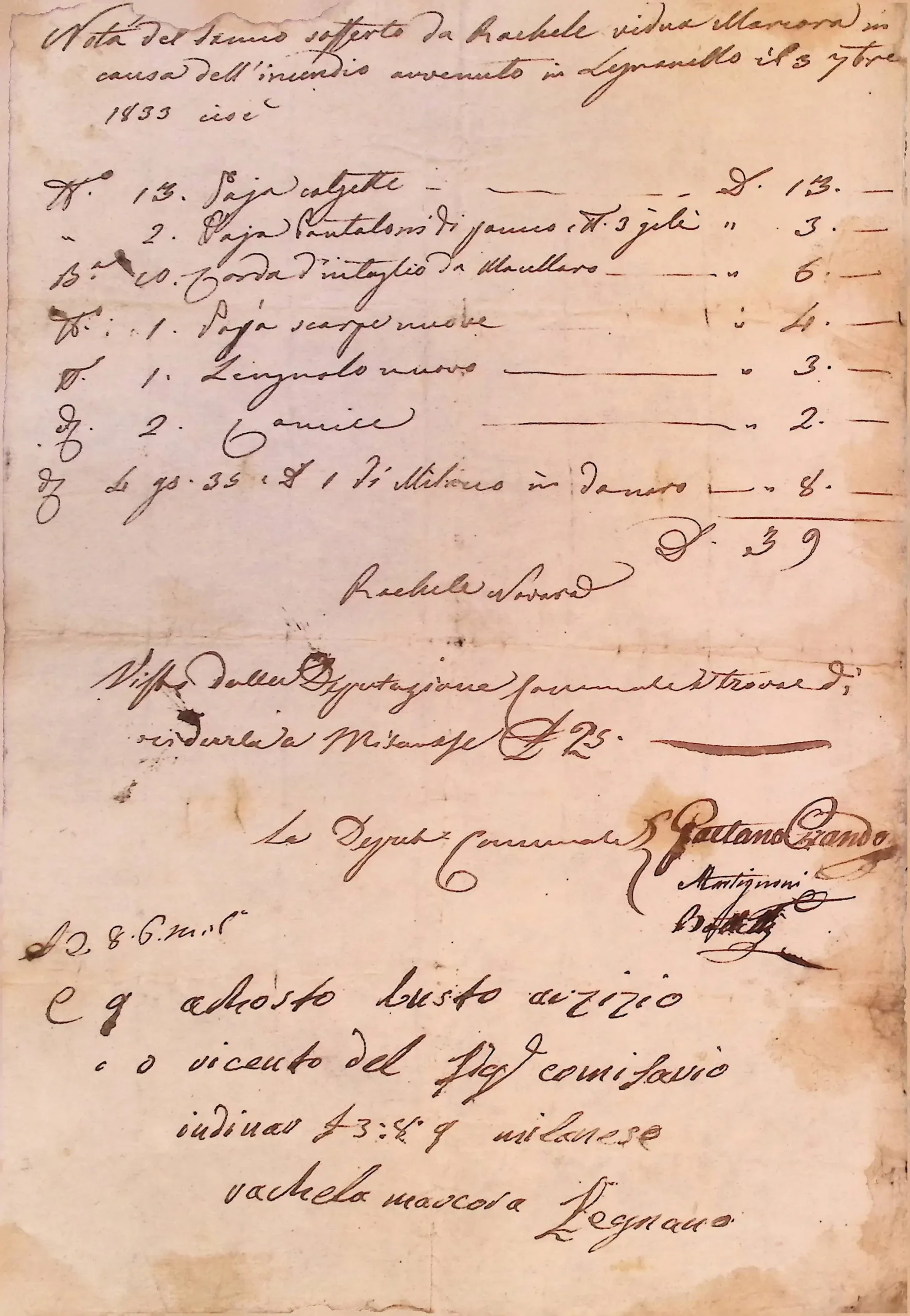 Carteggio relativo all’incendio verificatosi in Legnarello il 23 settembre 1833, alle spese per l’intervento dei vigili del fuoco e al pagamento dei sussidi ai danneggiati
