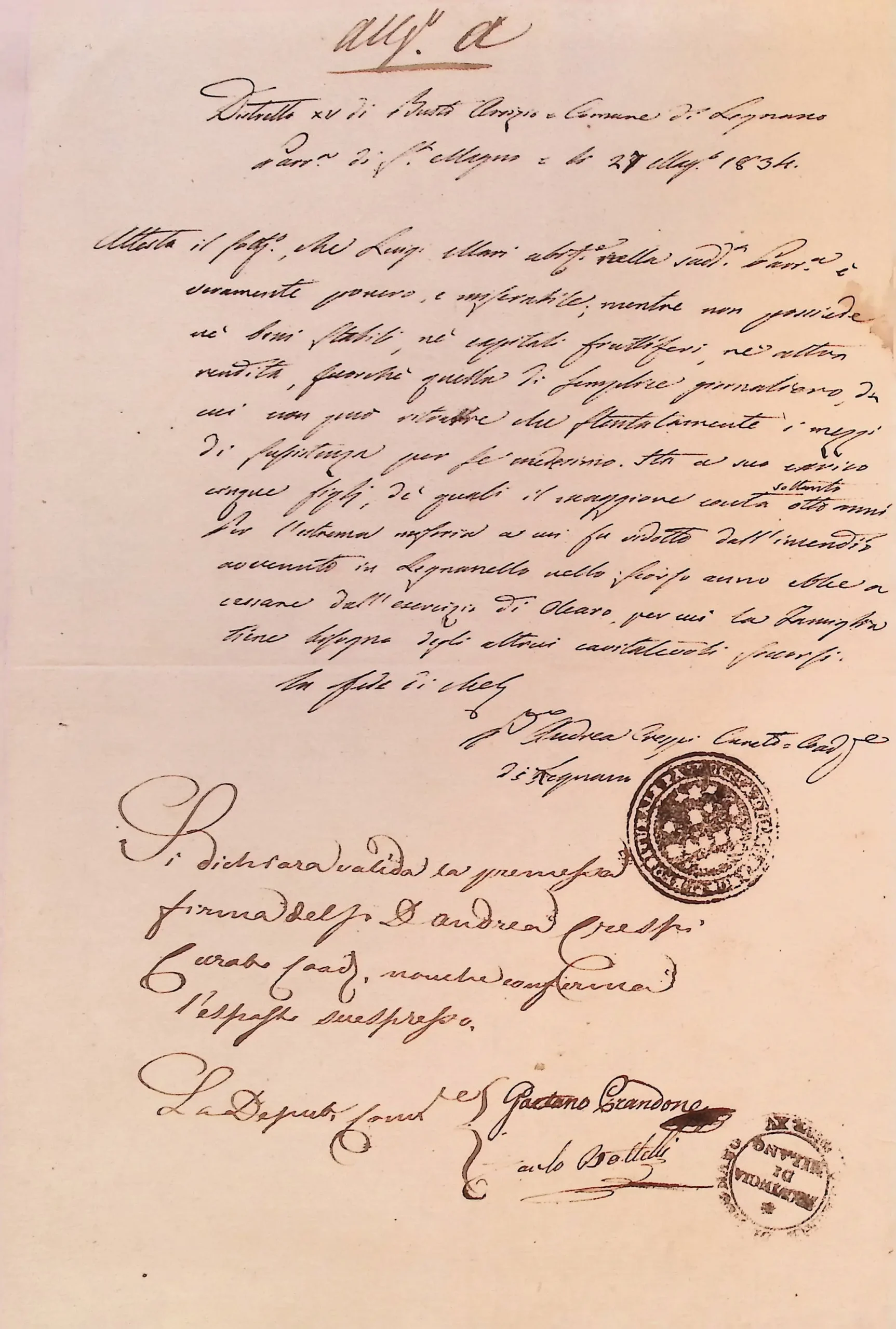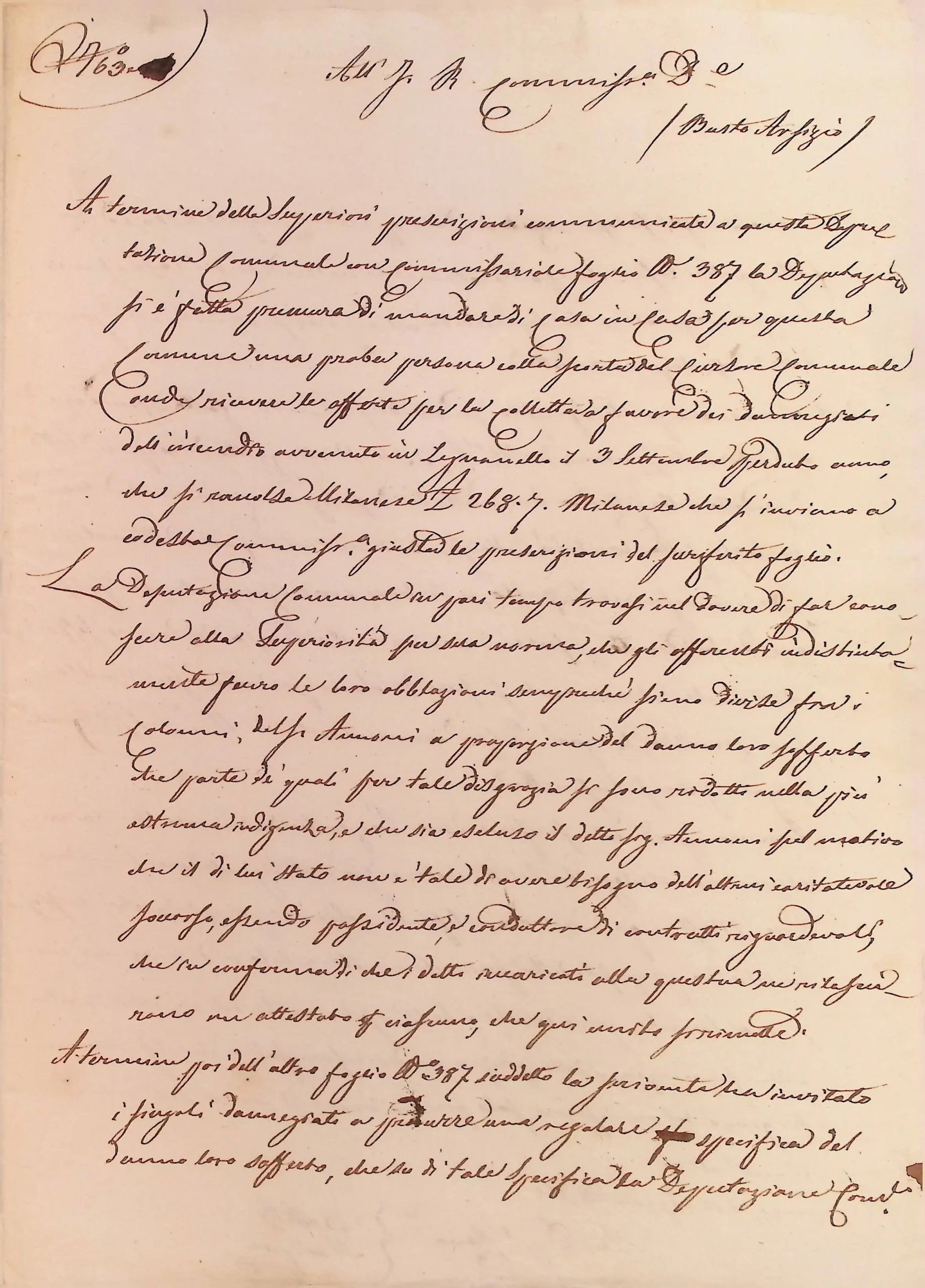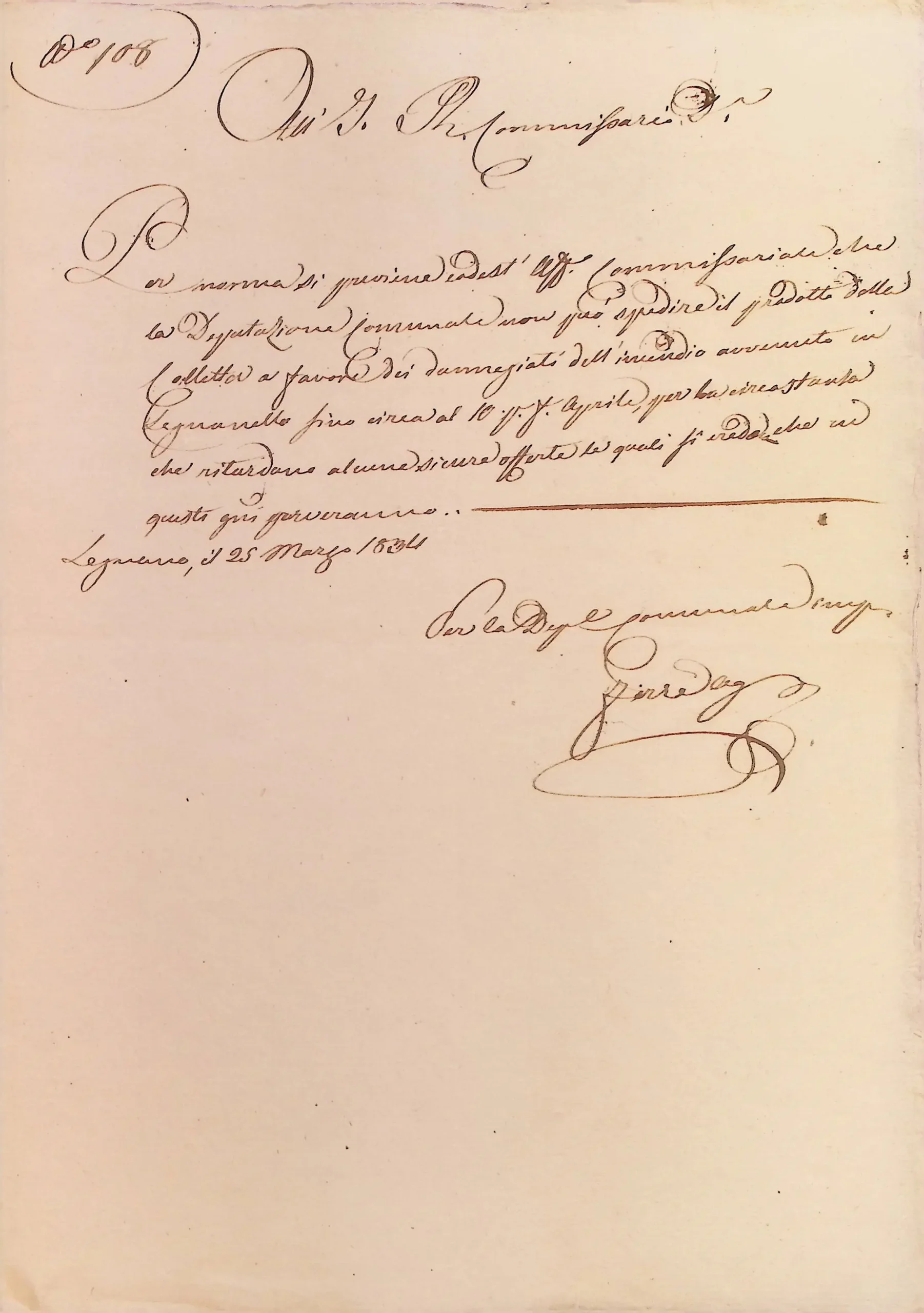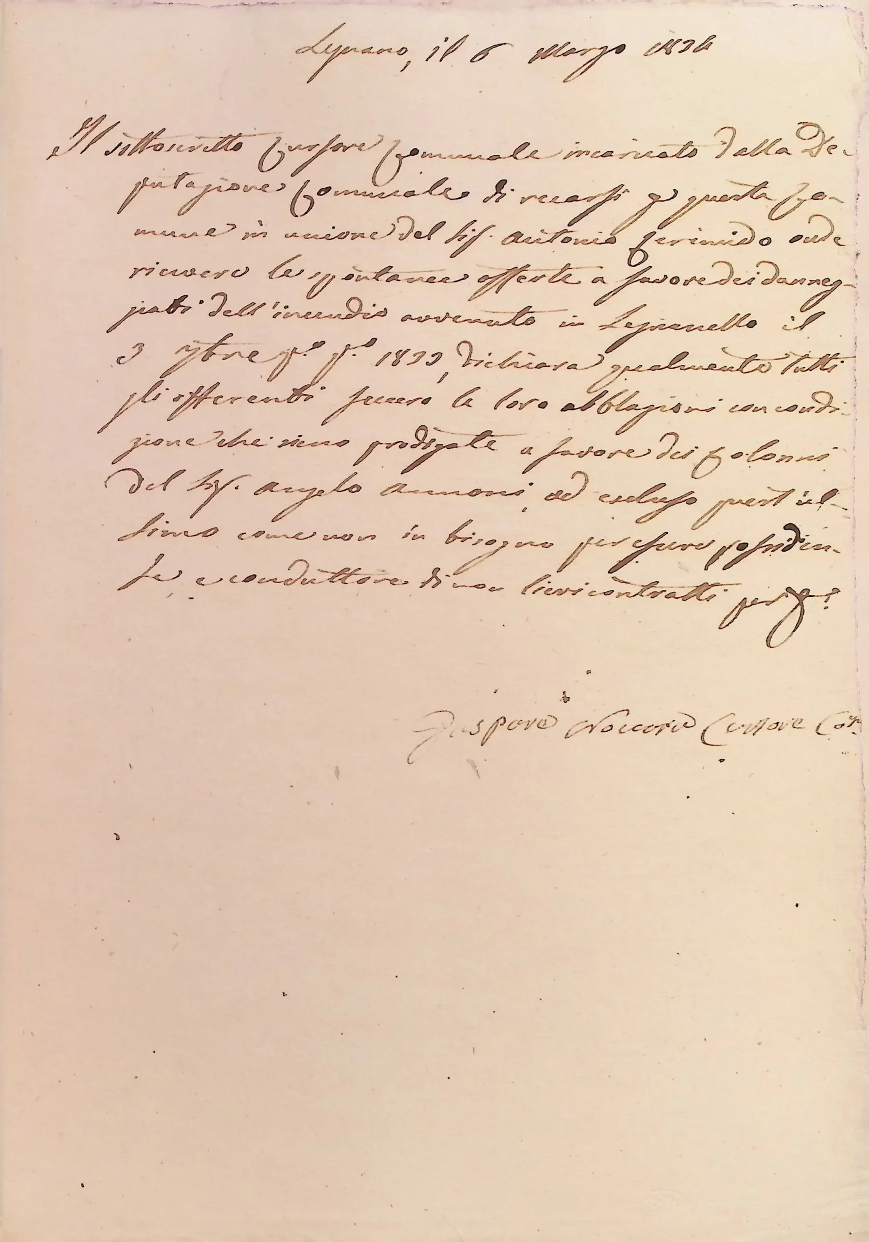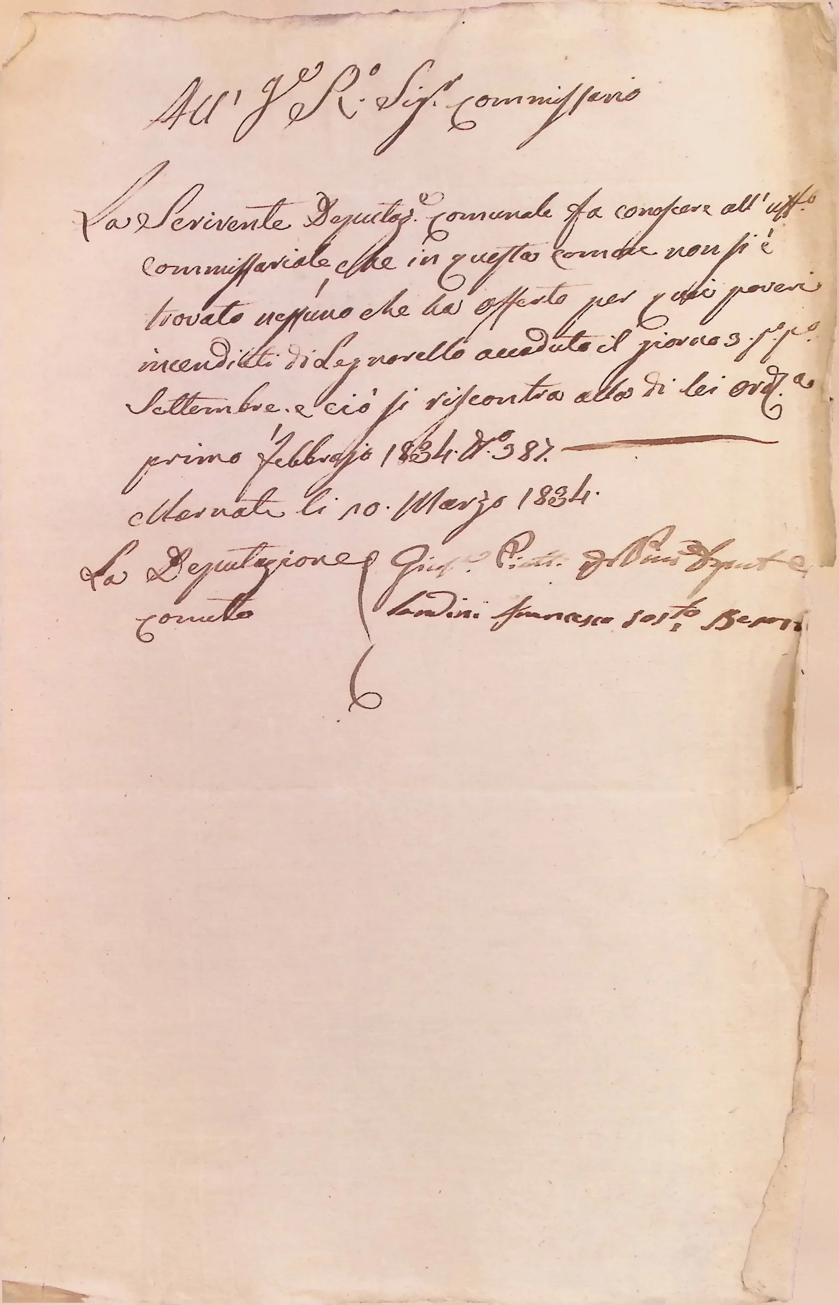 Carteggio relativo all’incendio verificatosi in Legnarello il 23 settembre 1833, alle spese per l’intervento dei vigili del fuoco e al pagamento dei sussidi ai danneggiati