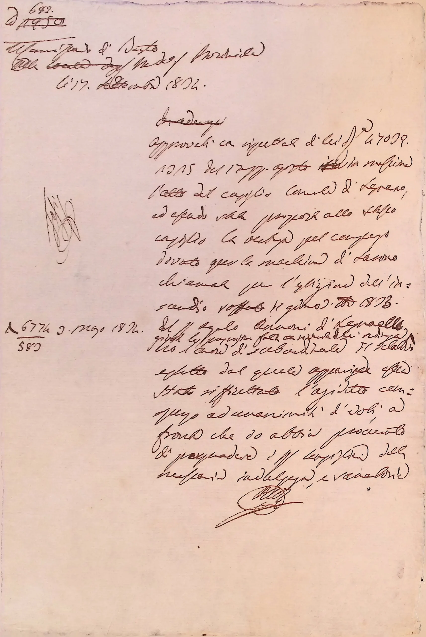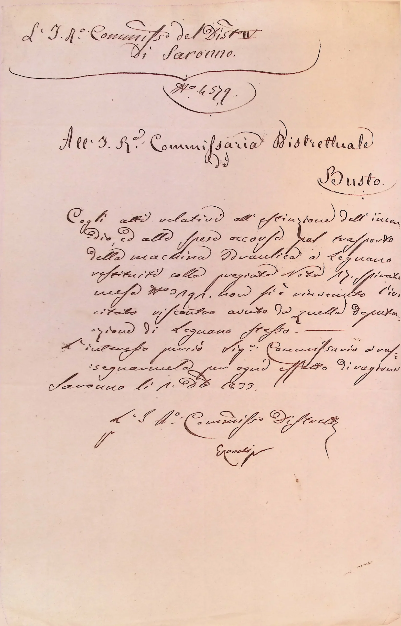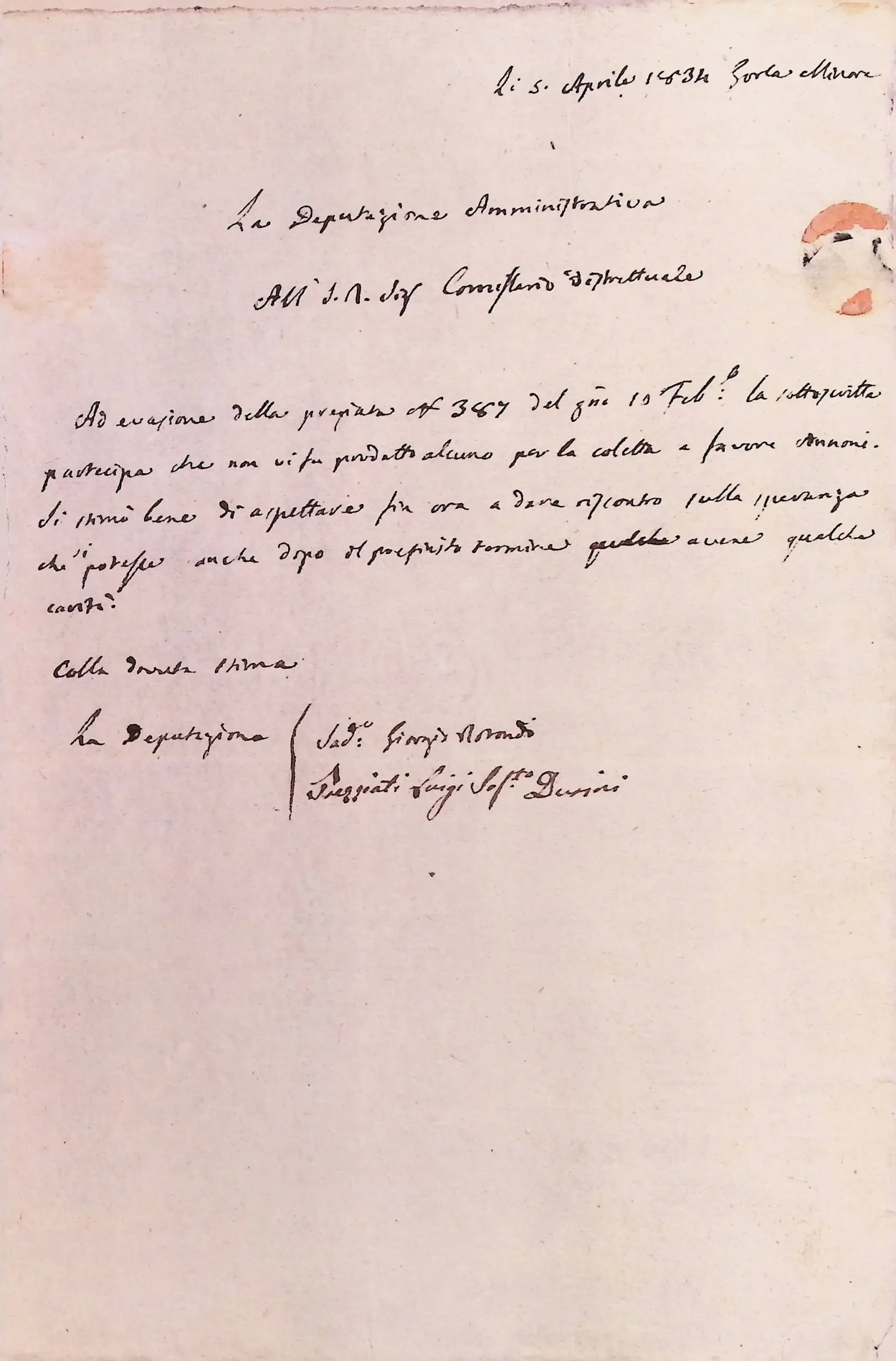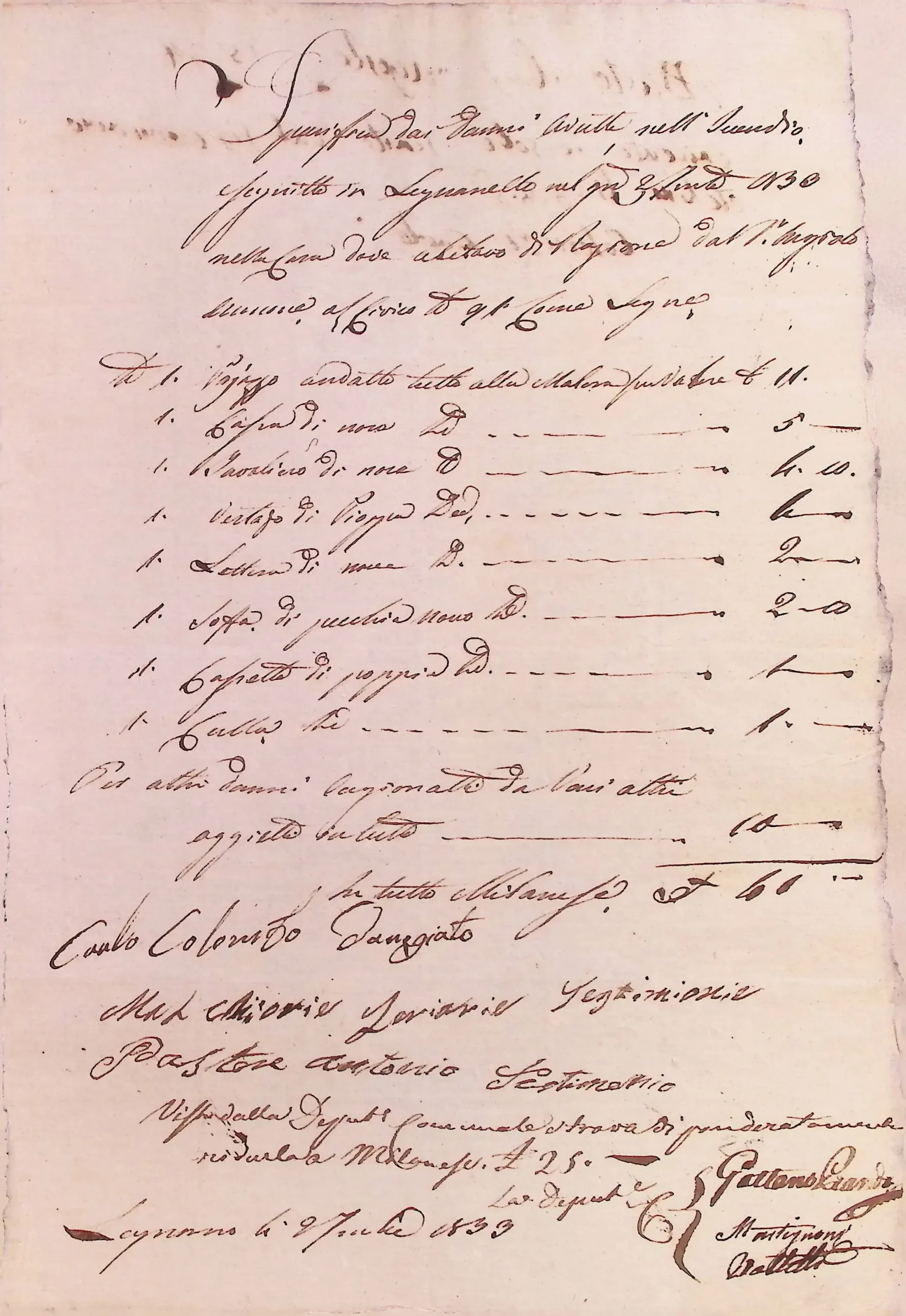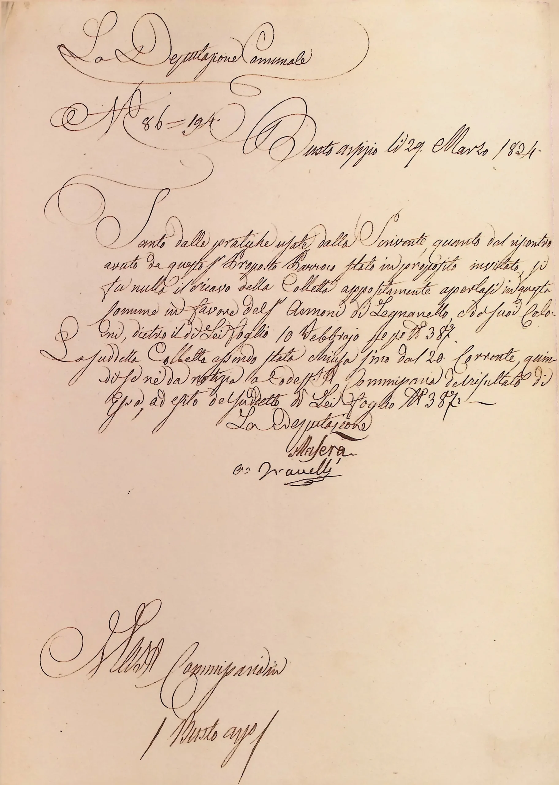 Carteggio relativo all’incendio verificatosi in Legnarello il 23 settembre 1833, alle spese per l’intervento dei vigili del fuoco e al pagamento dei sussidi ai danneggiati