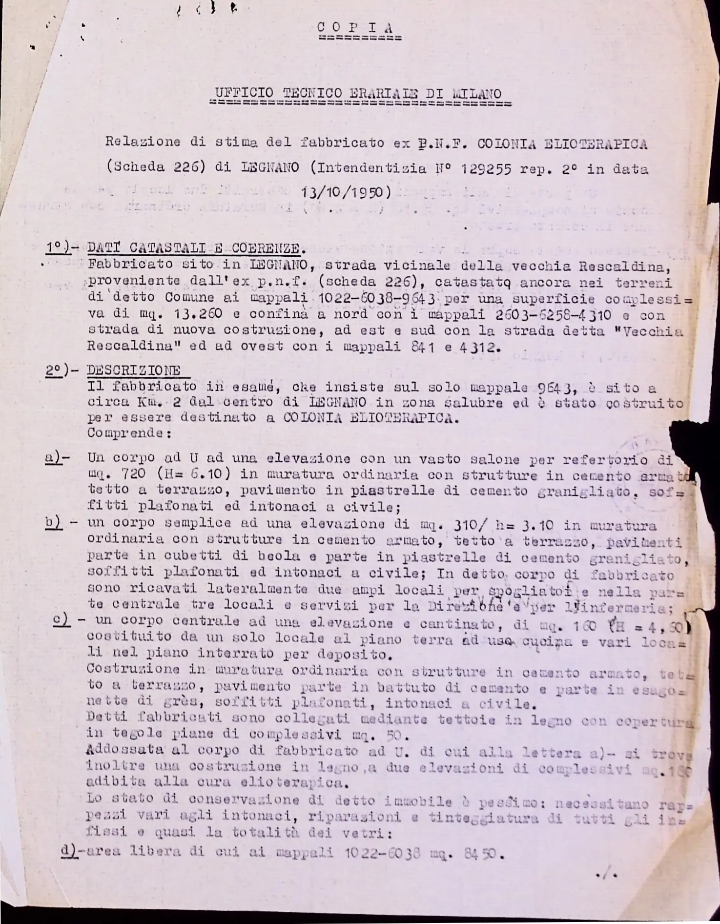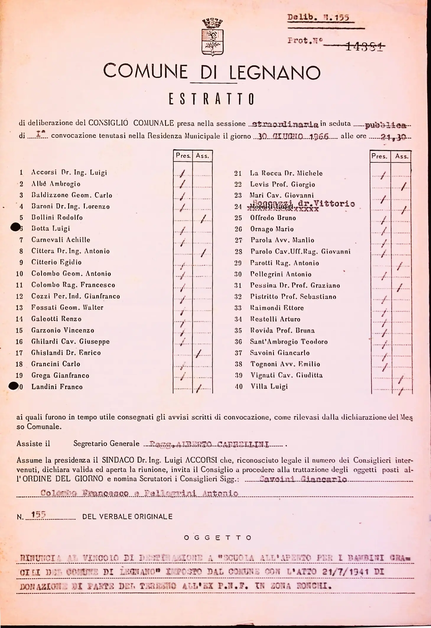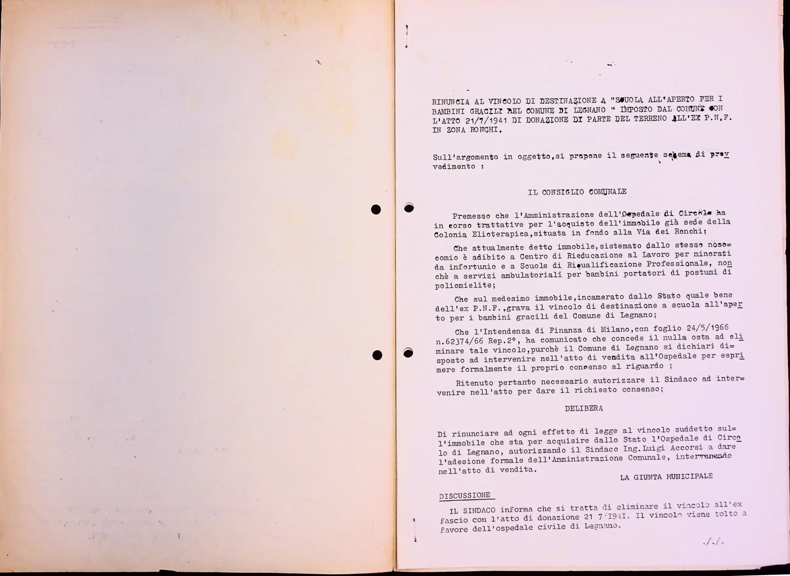 Rinuncia al vincolo di destinazione a scuola all’aperto per i bambini gracili del Comune di Legnano imposto dal Comune con l’atto 21/7/41 di donazione di parte del terreno all’Ex P.N.F. in zona Ronchi