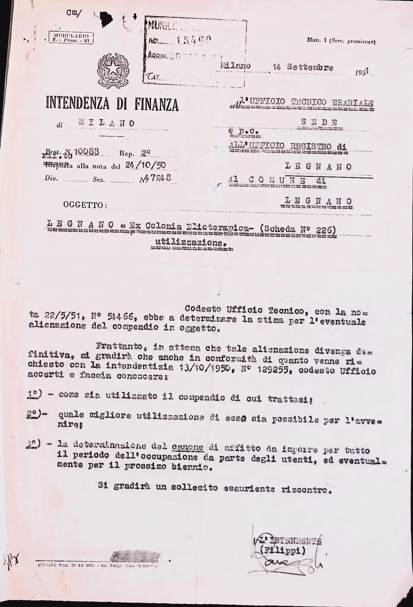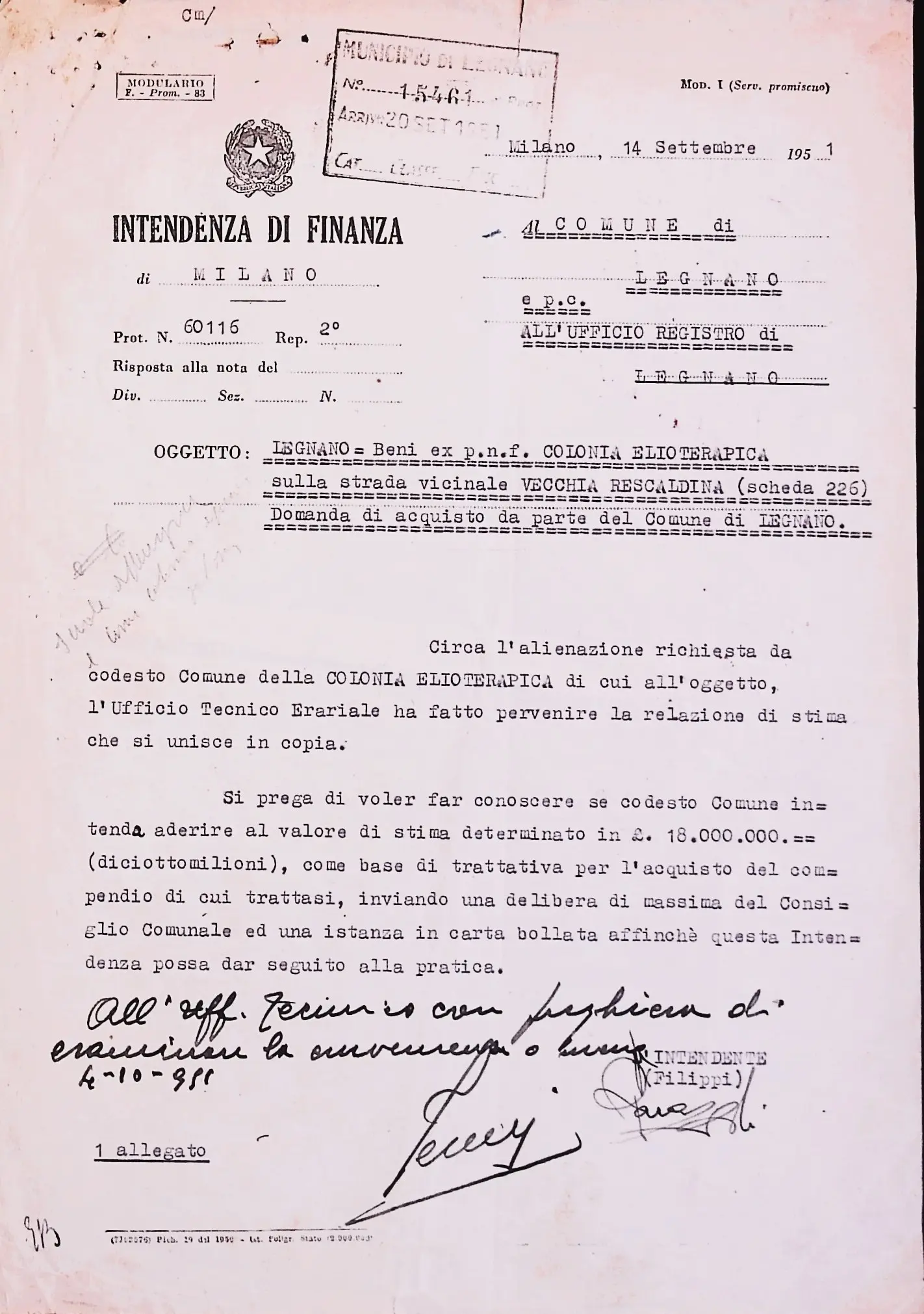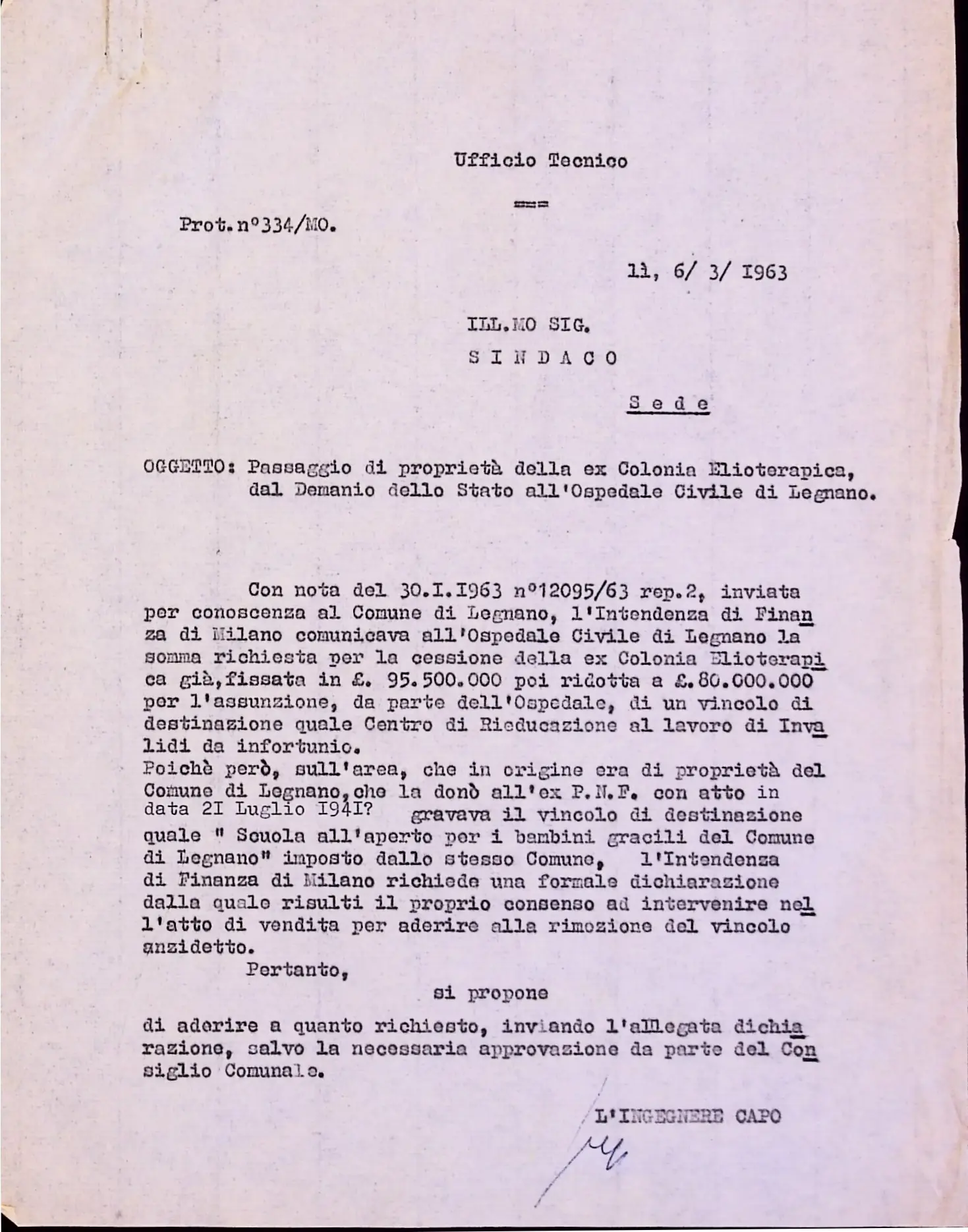 Rinuncia al vincolo di destinazione a scuola all’aperto per i bambini gracili del Comune di Legnano imposto dal Comune con l’atto 21/7/41 di donazione di parte del terreno all’Ex P.N.F. in zona Ronchi