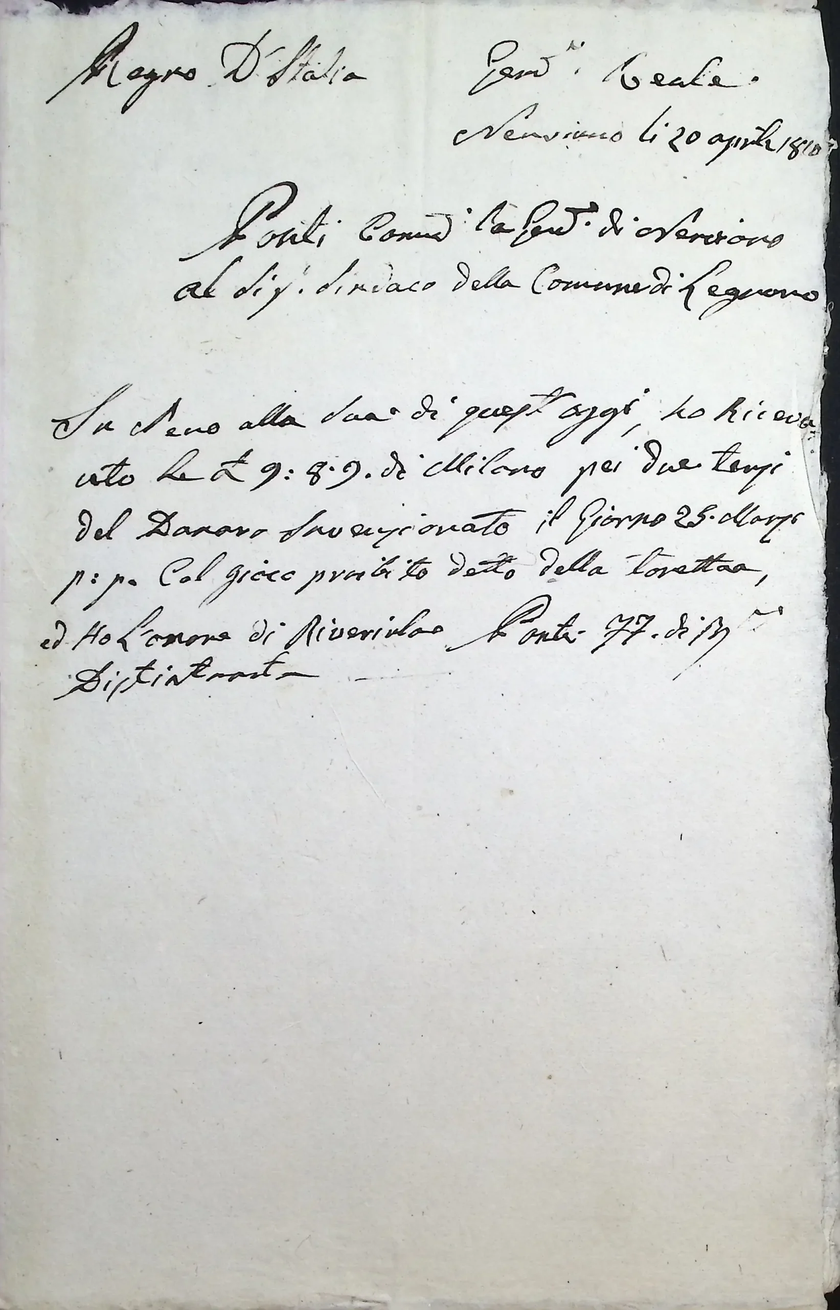 | Note dell'archivista | Descrizione precedente: "Rapporto del Sindaco del Comune sul sequestro di una somma di denaro, operata dai gendarmi a danno del tenitore del gioco detto della Toretta sulla piazza delle grazie di Legnano". |