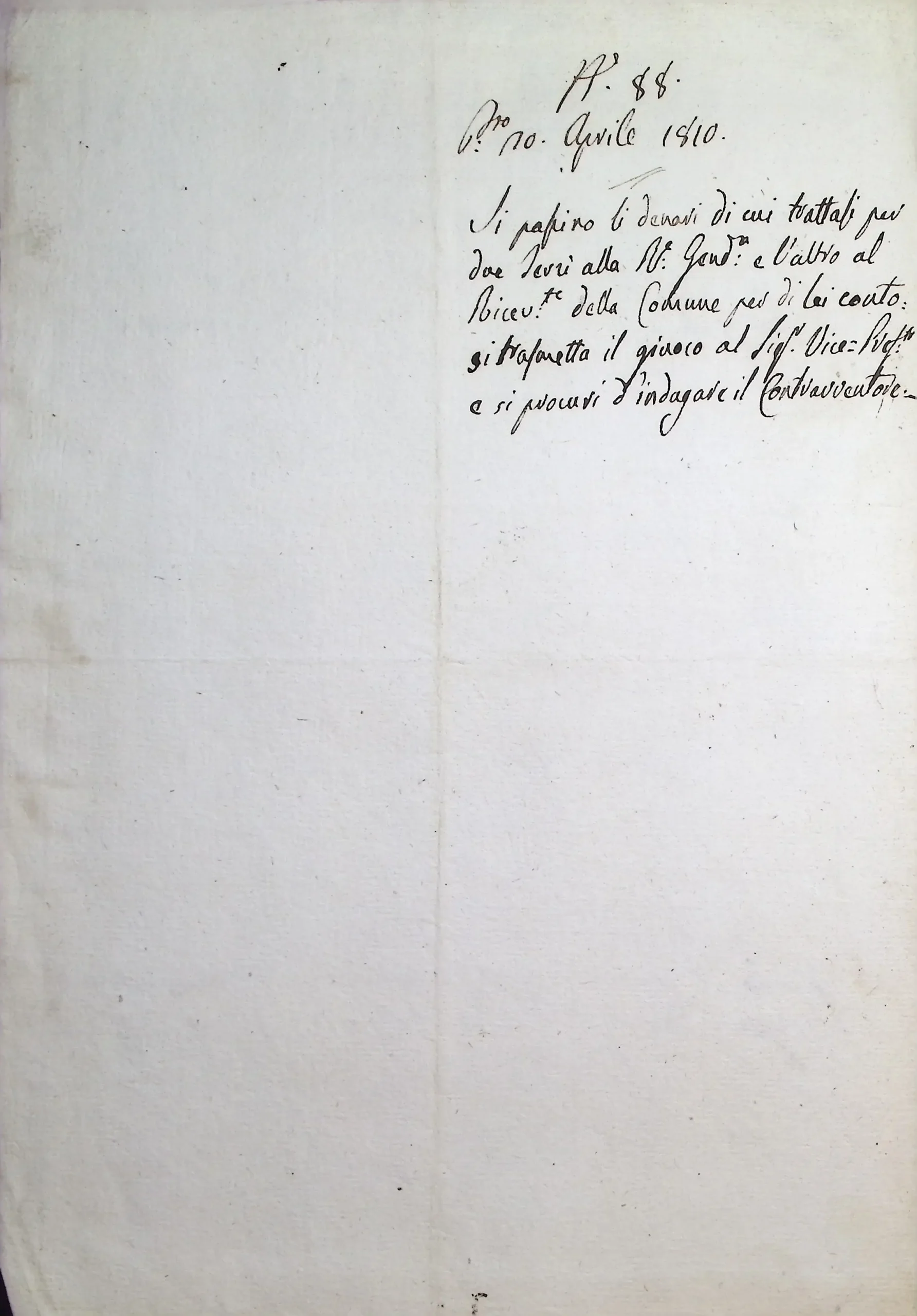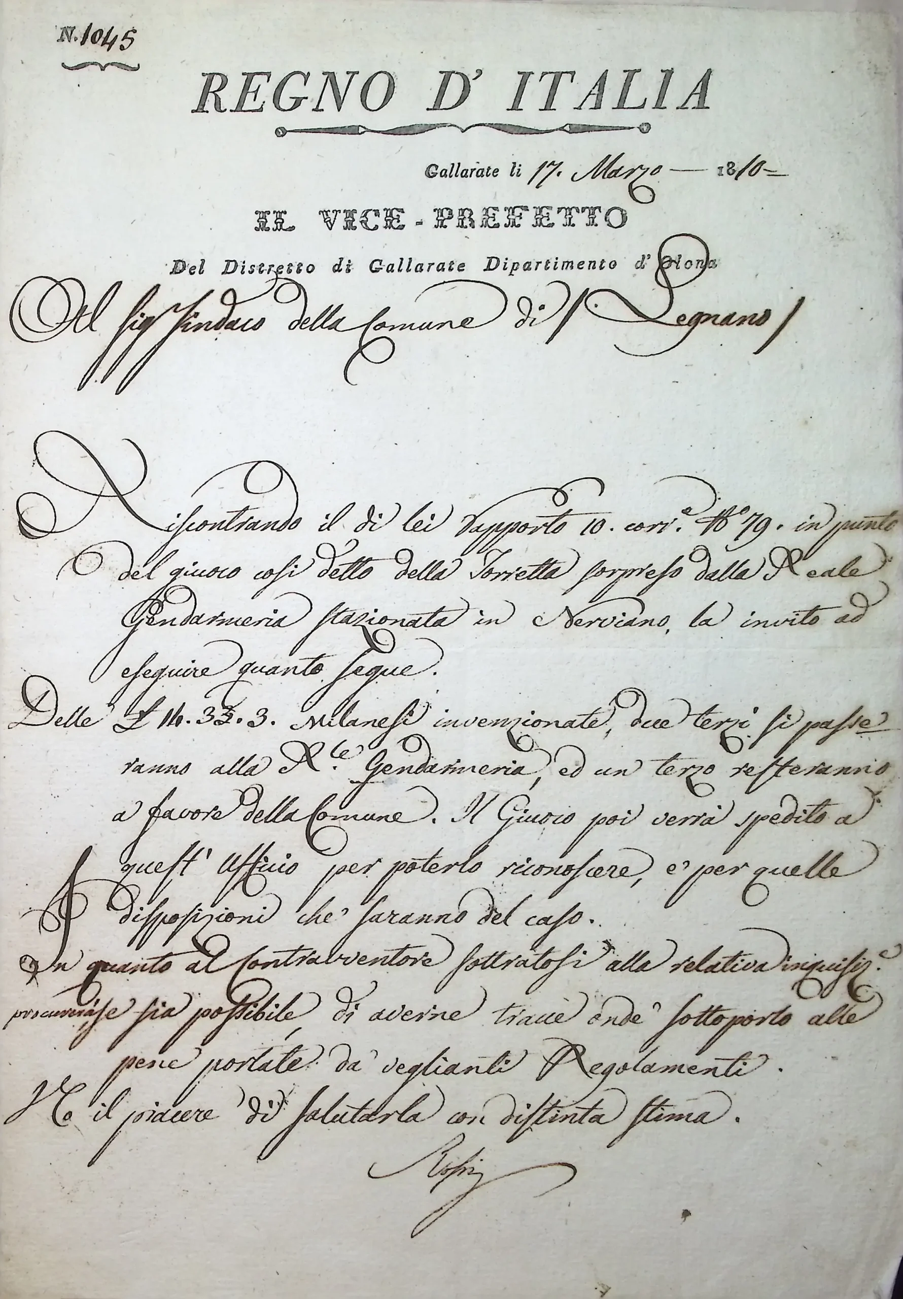 Rapporto del Sindaco sul sequestro operato dai gendarmi di Nerviano di una somma di denaro proveniente dalle scommesse sul gioco detto della Torretta, praticato abusivamente in piazza delle Grazie