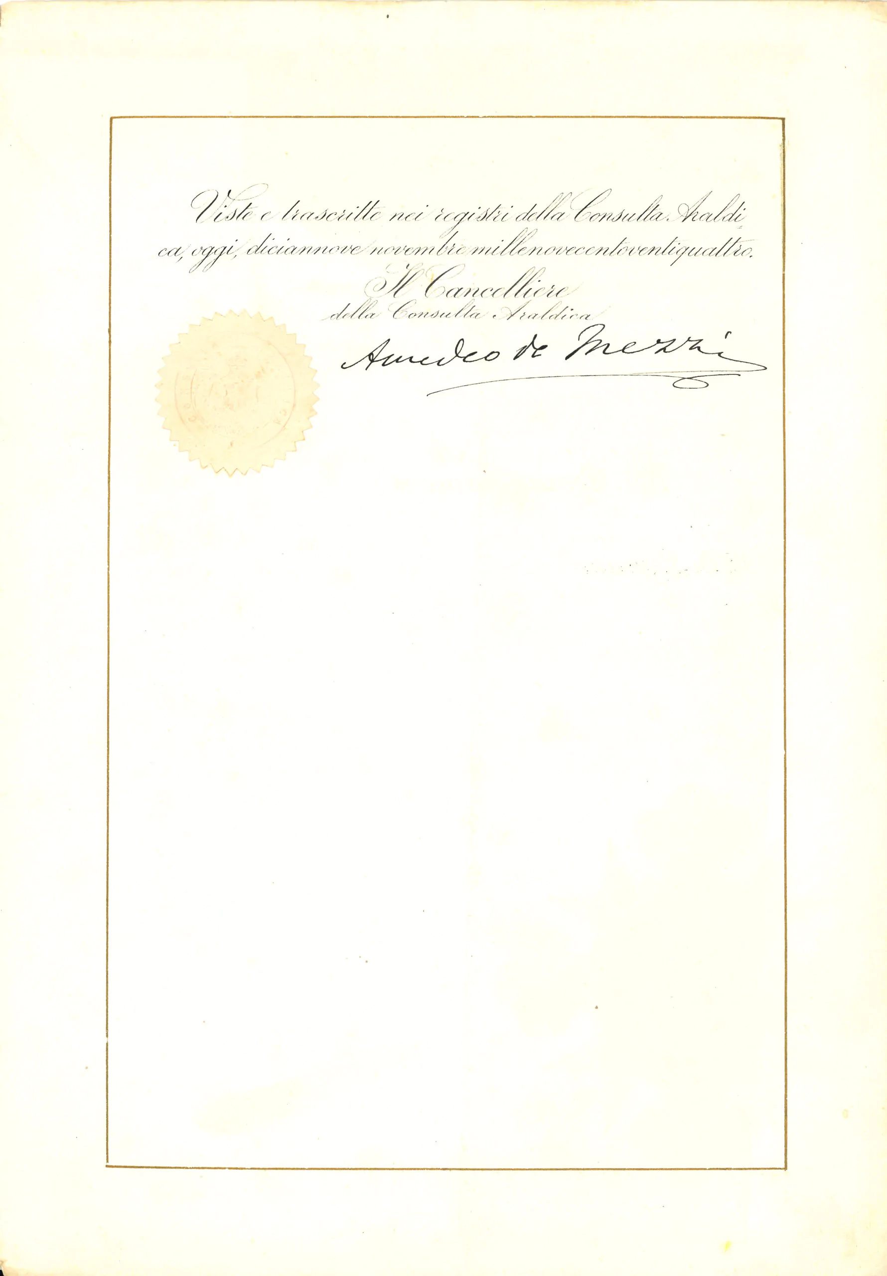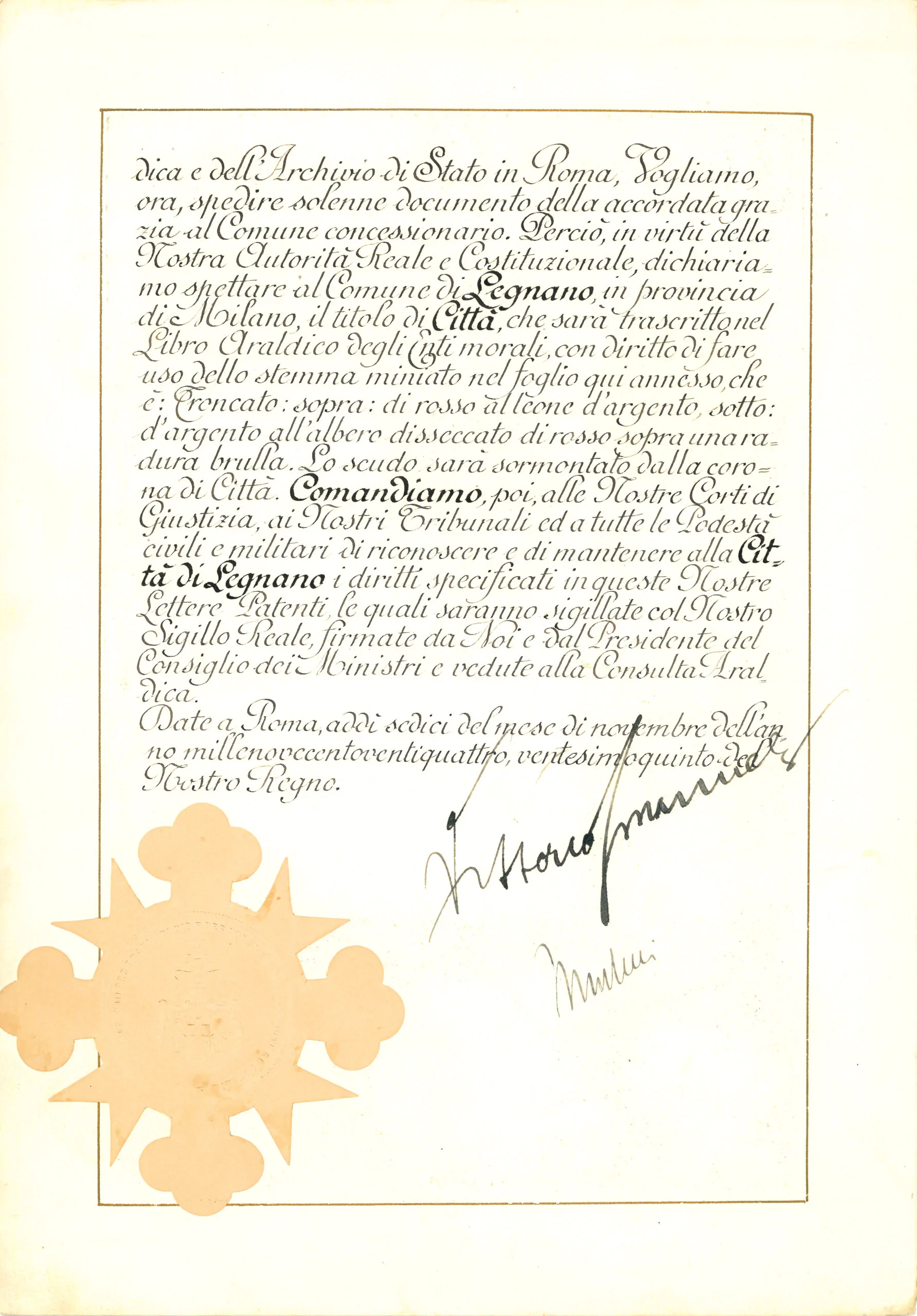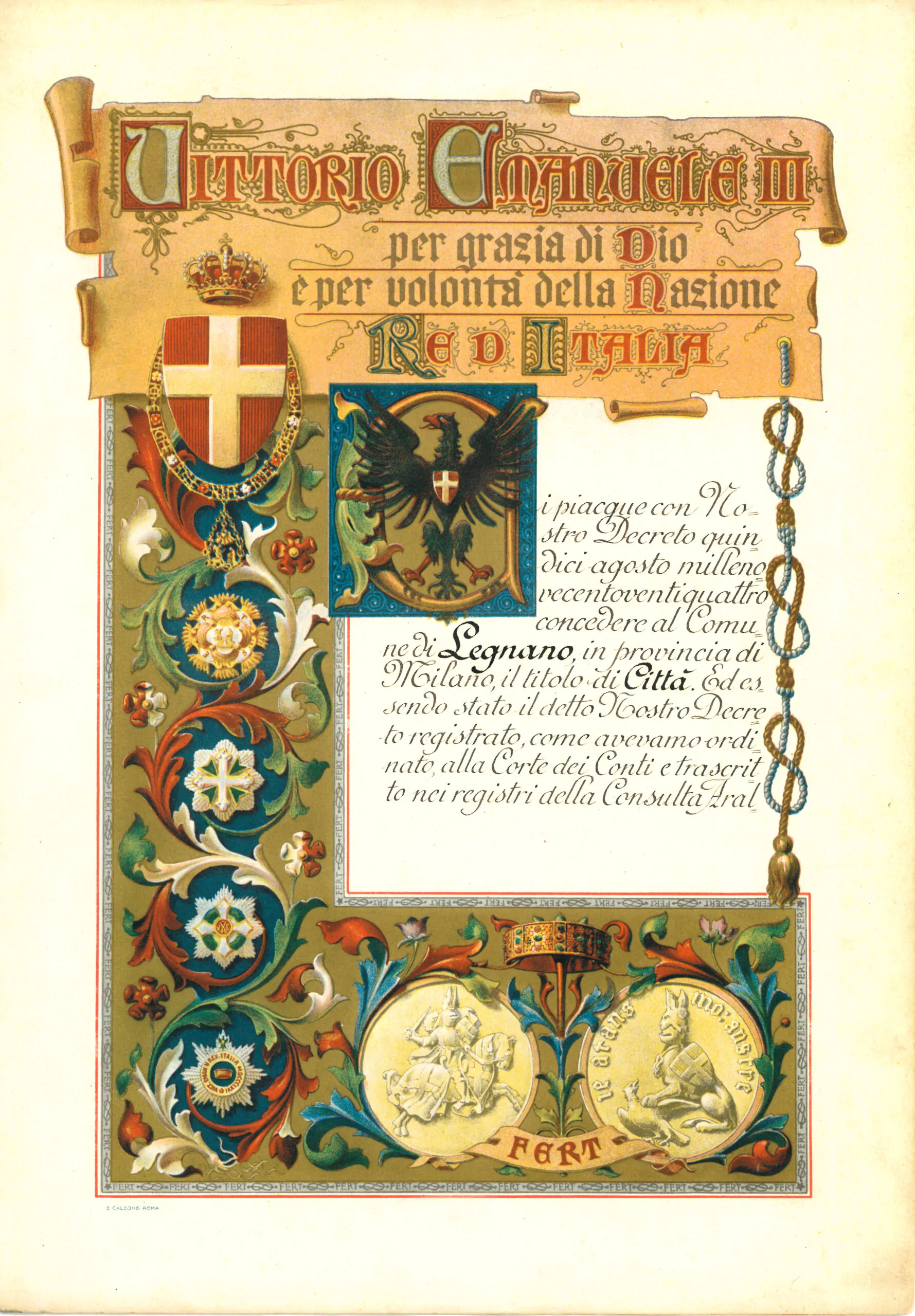Regia patente di concessione del titolo di Città e Stemma miniato rilasciato dalla Consulta Araldica