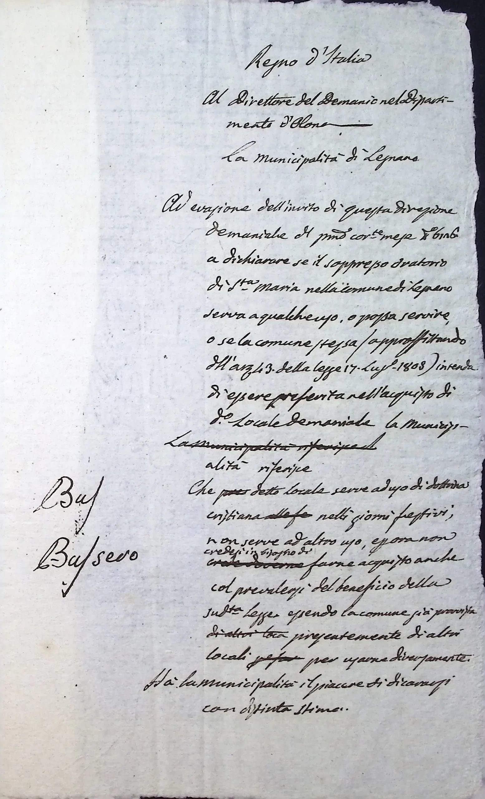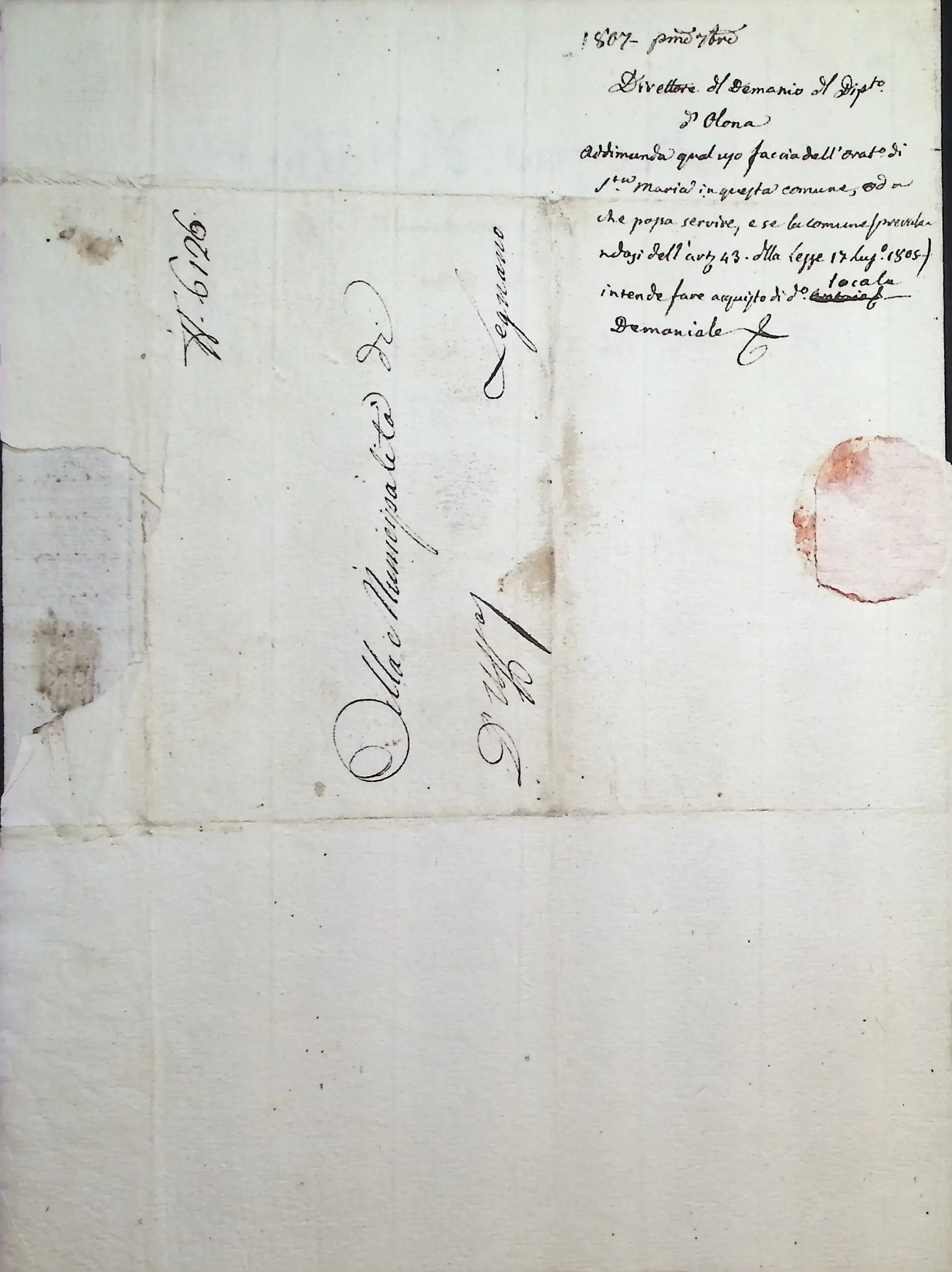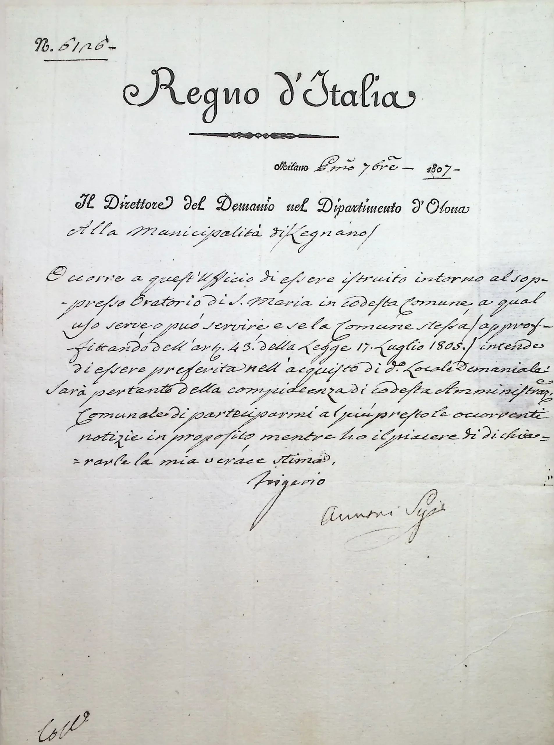 Richiesta del Direttore del Demanio del Dipartimento d’Olona di informazioni sulla destinazione d’uso del soppresso Oratorio di S. Maria e sull’eventualità che il Comune eserciti il diritto di prelazione sull’acquisto