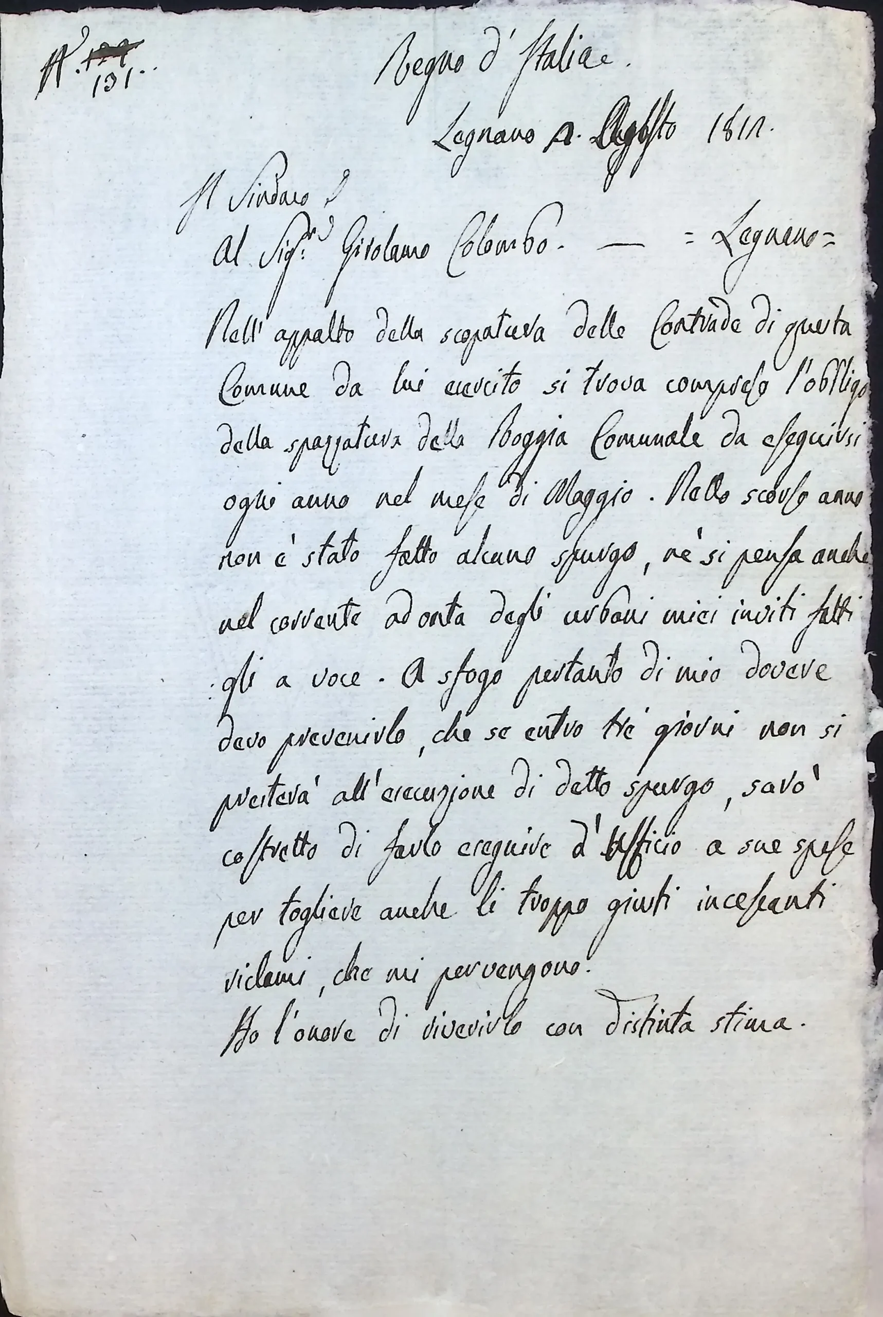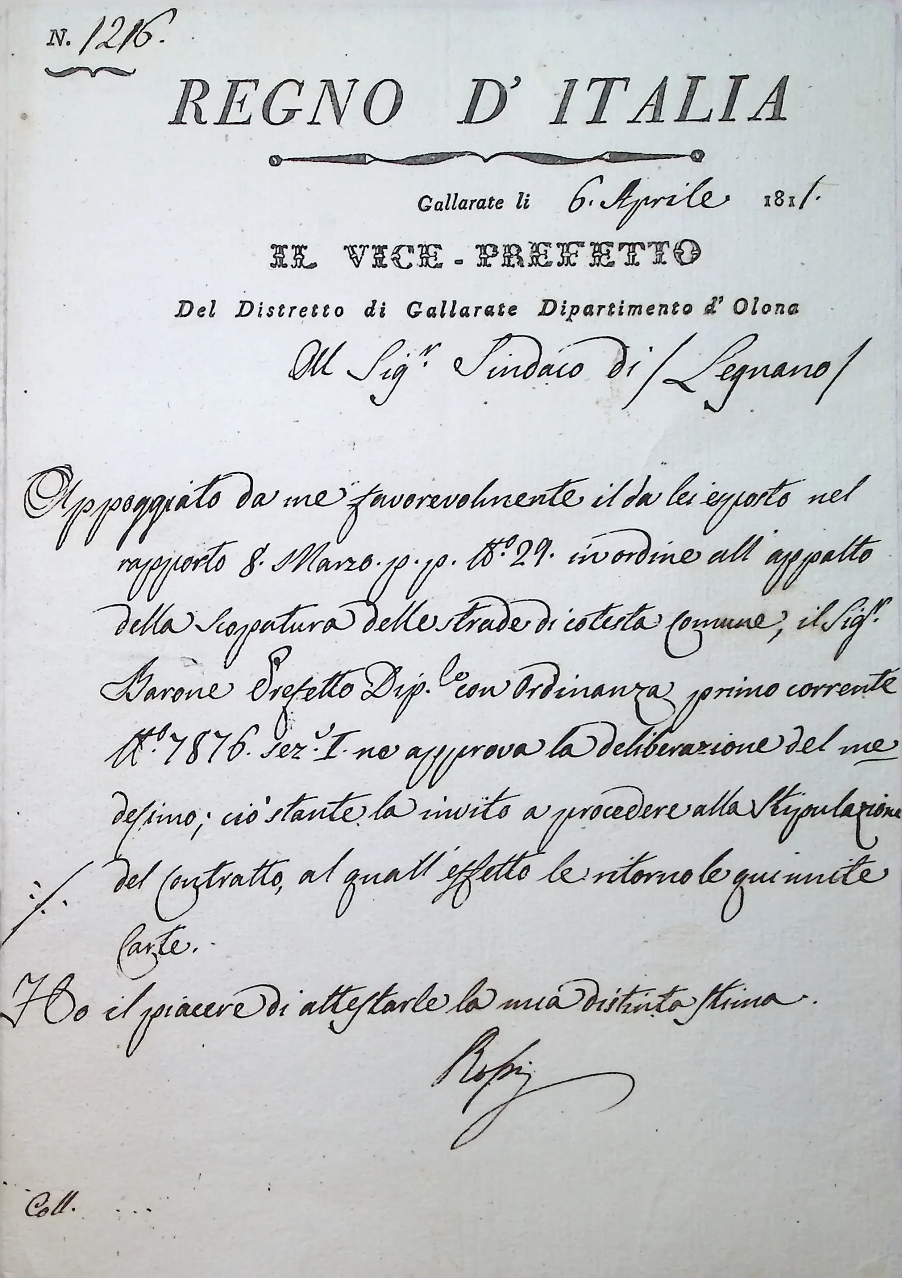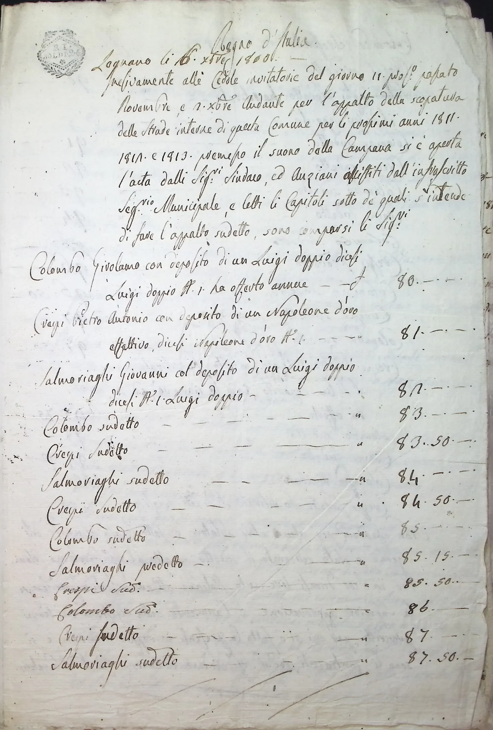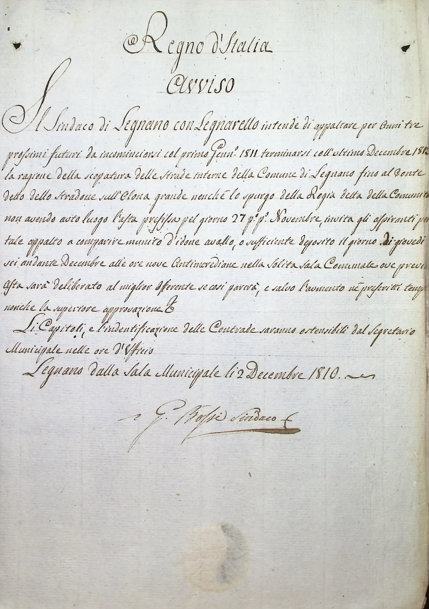 Appalto del servizio di spazzatura delle strade interne del Comune per il triennio 1811 – 1813