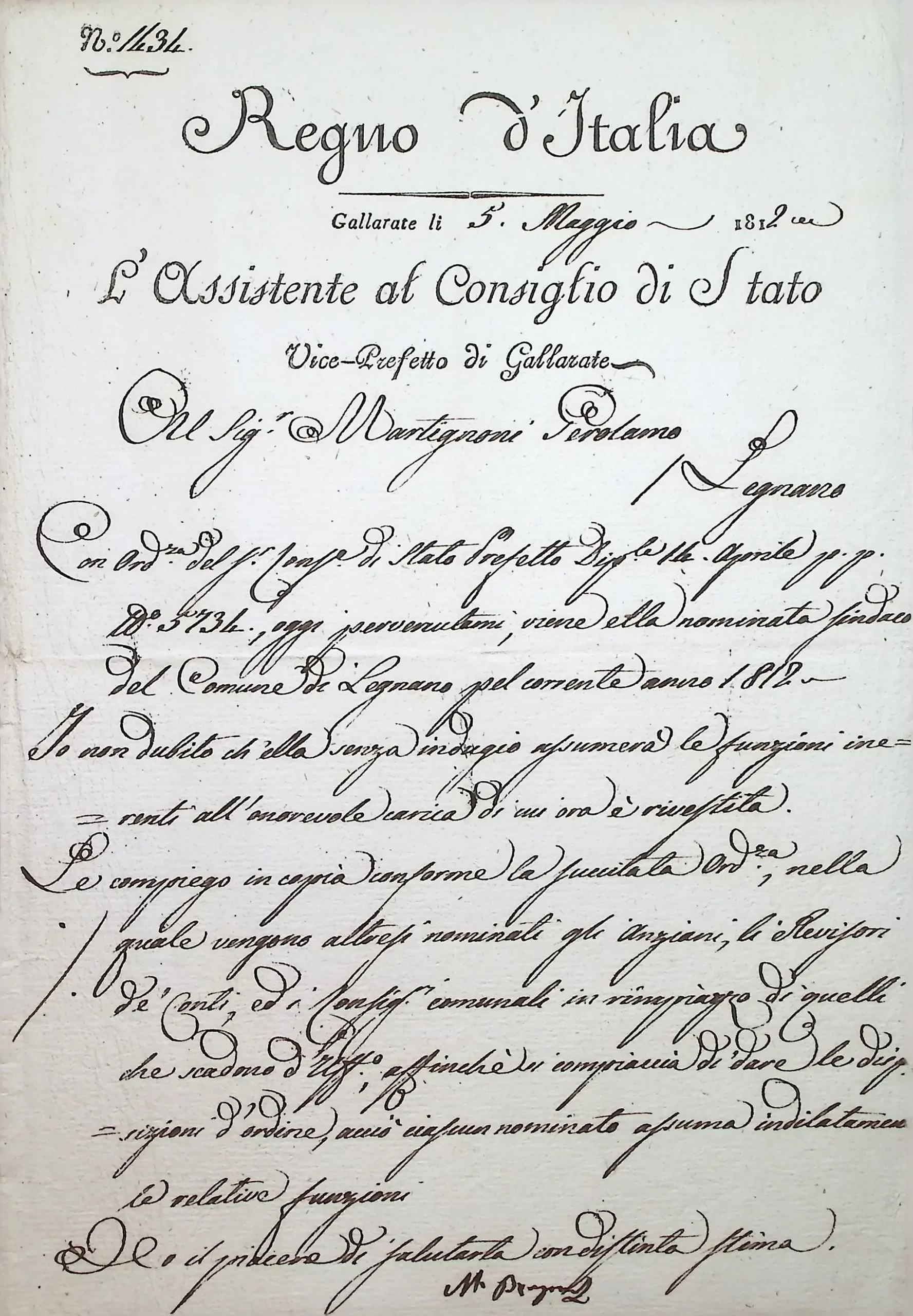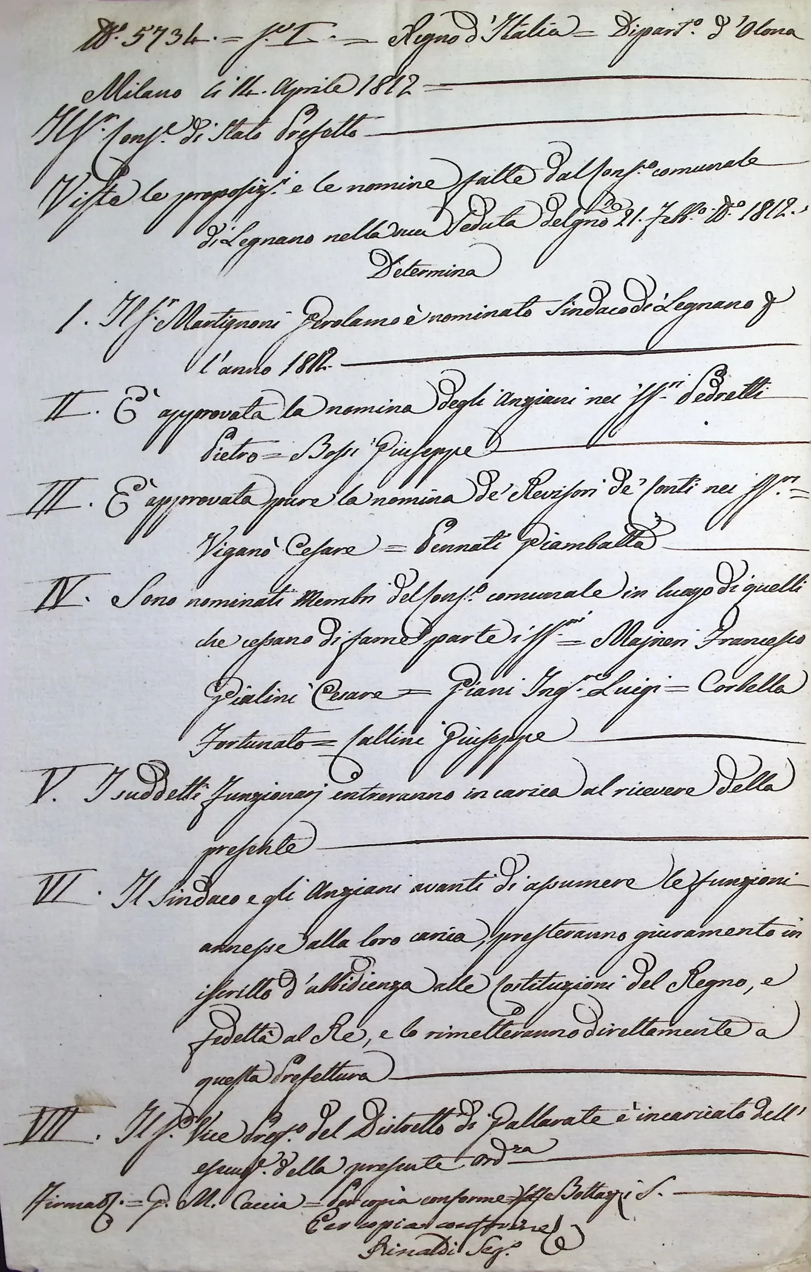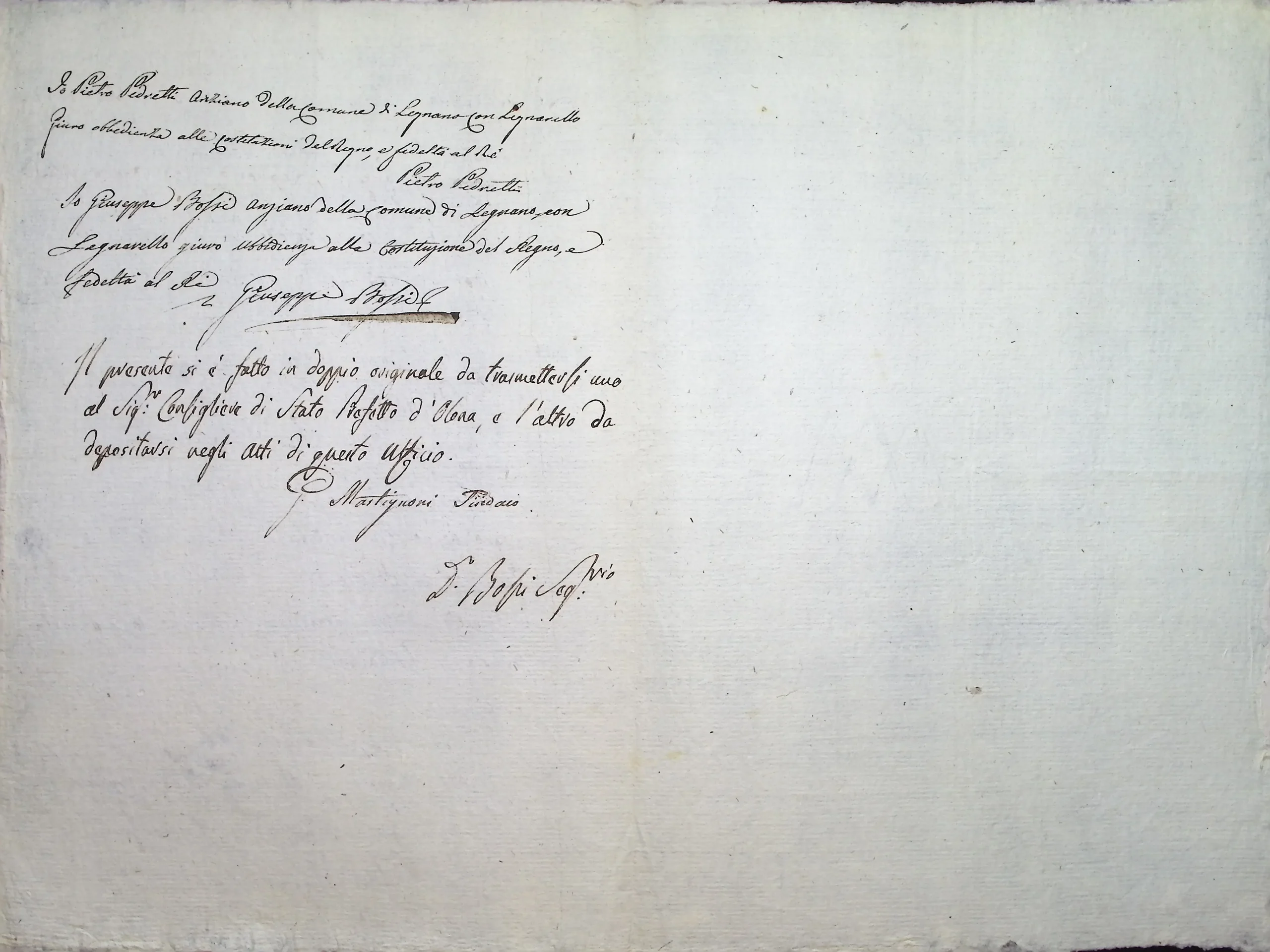 Verbale di giuramento del Sindaco e degli anziani del Comune nominati dal Prefetto del Dipartimento per l’anno 1812