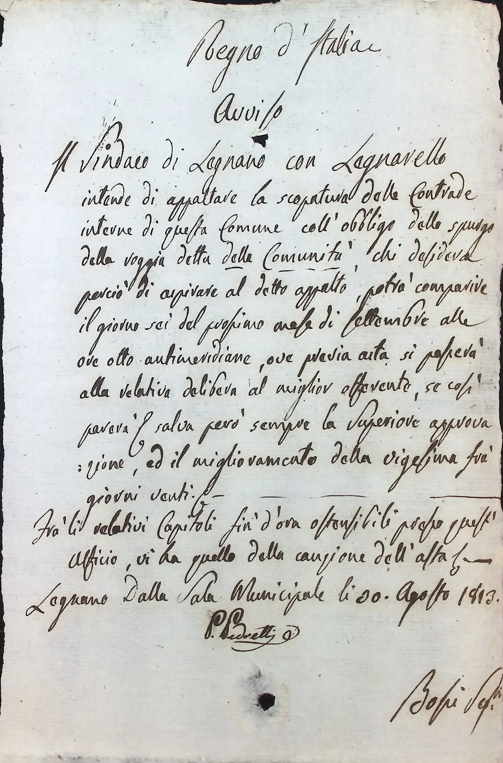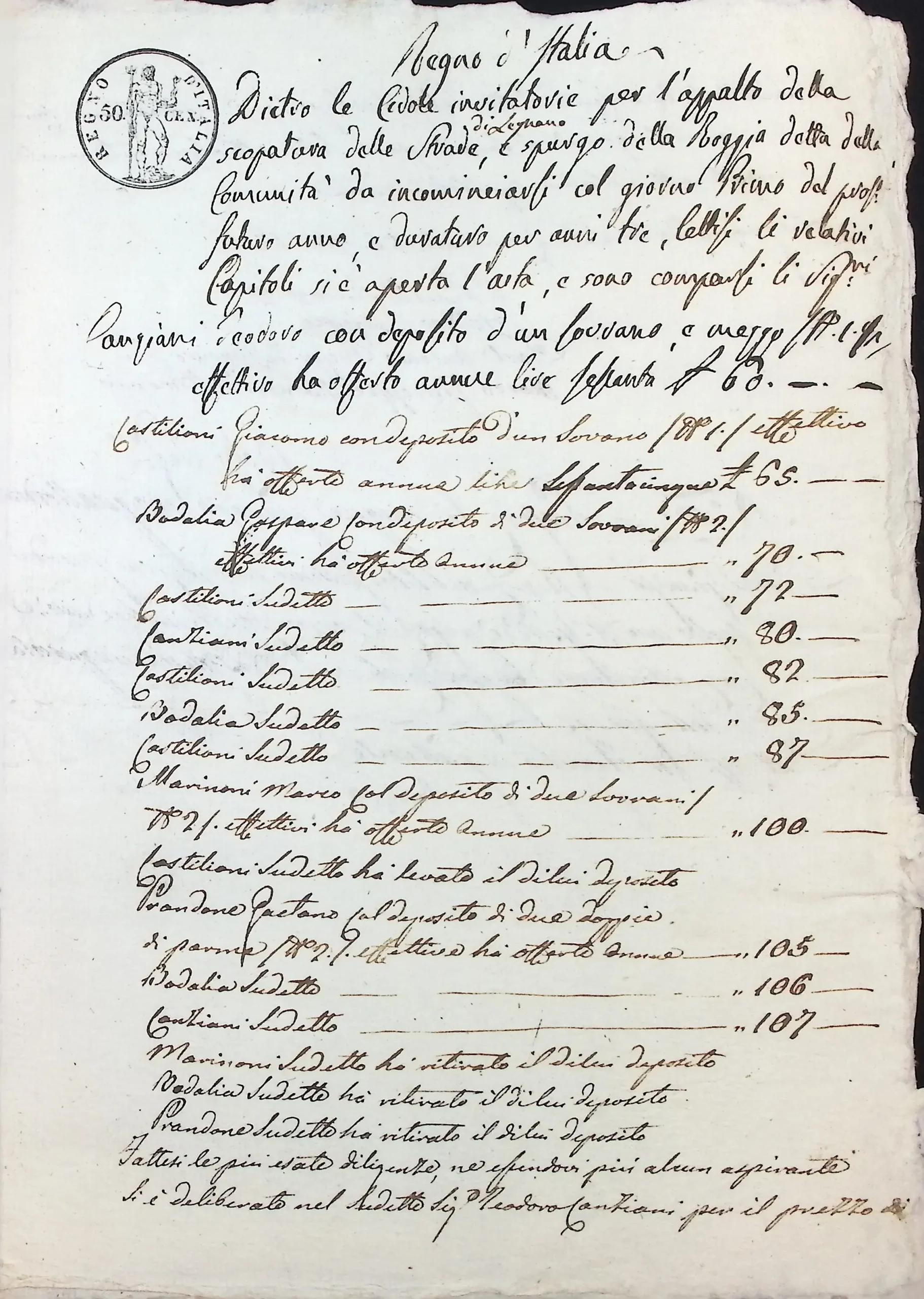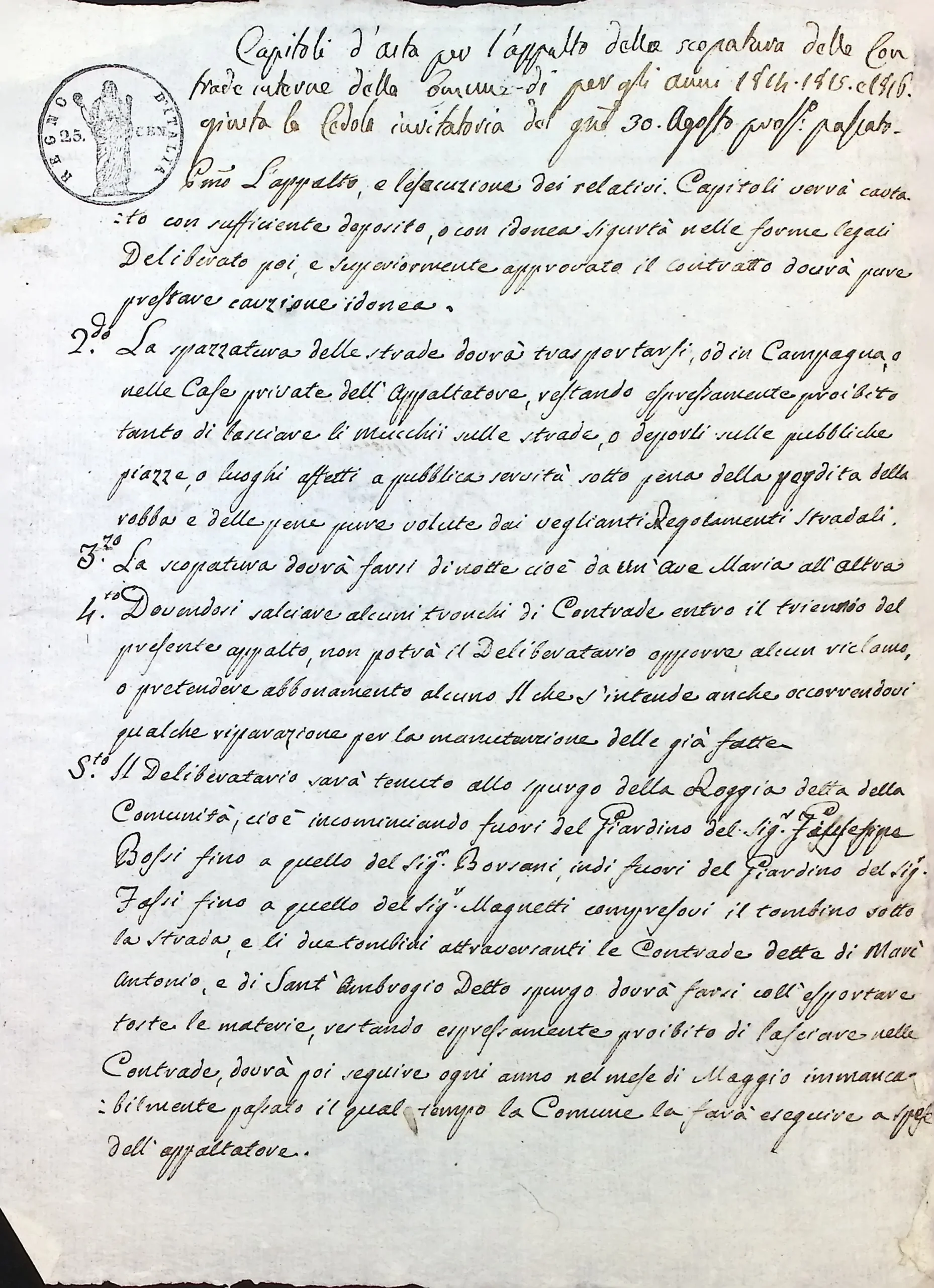 Verbale e capitoli dell’appalto del servizio spazzatura alle strade comunali e spurgo delle rogge per il triennio 1813-15
